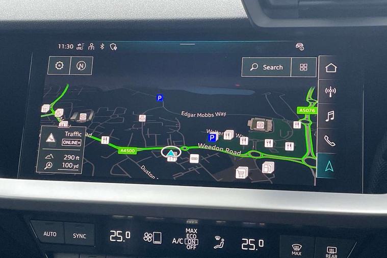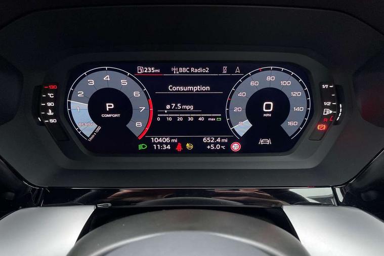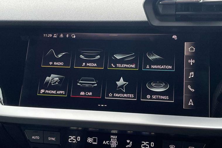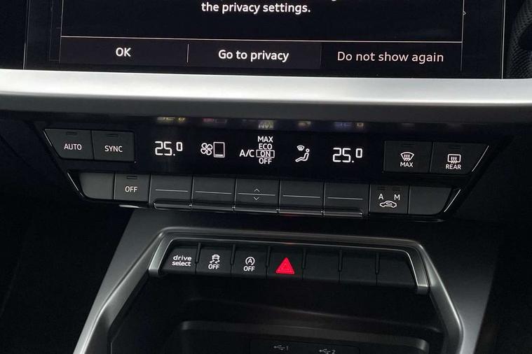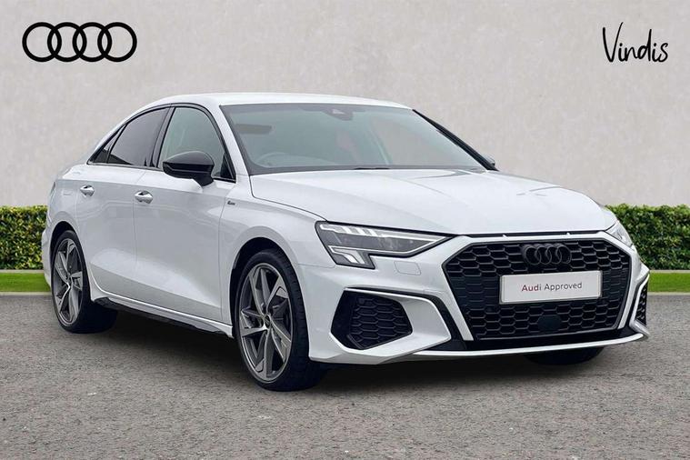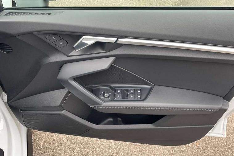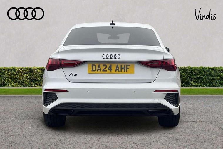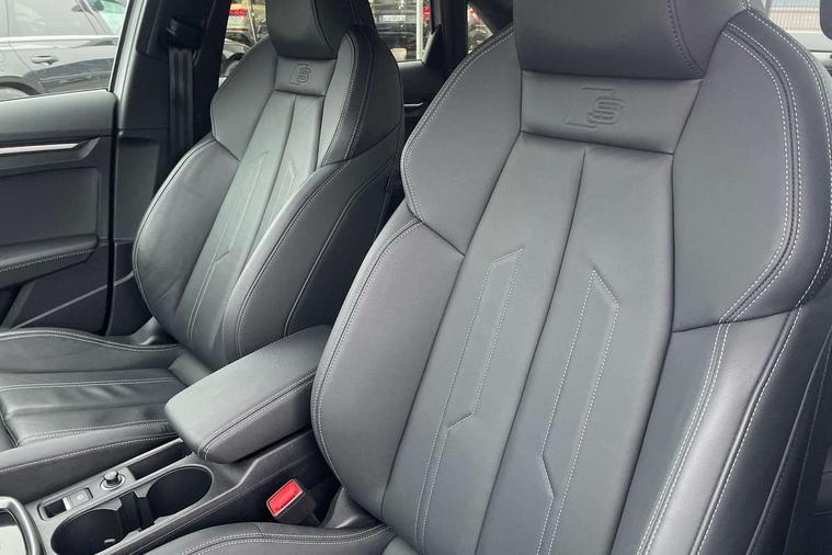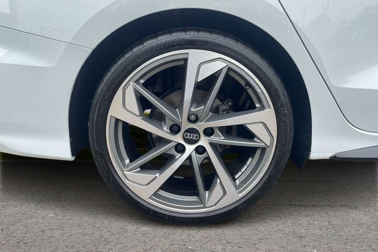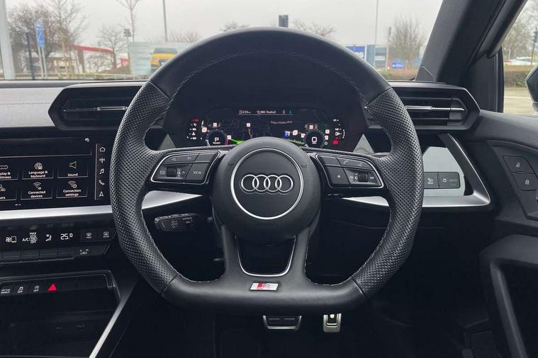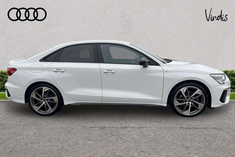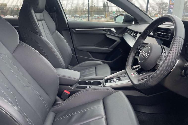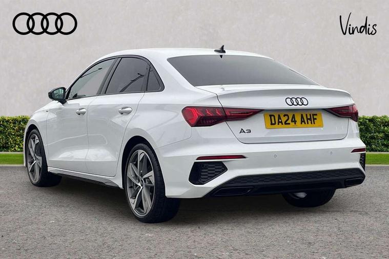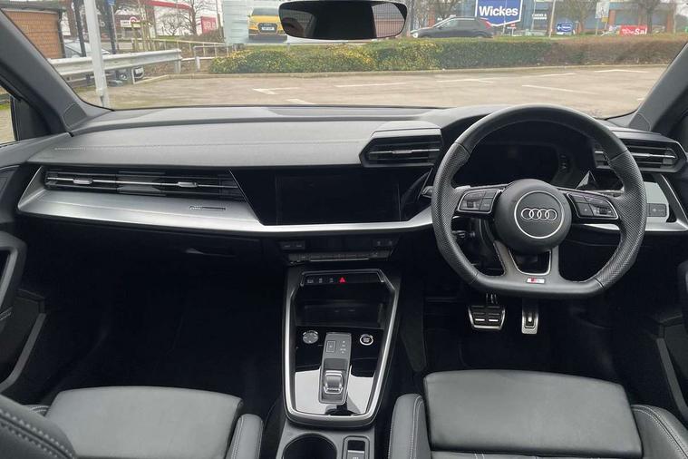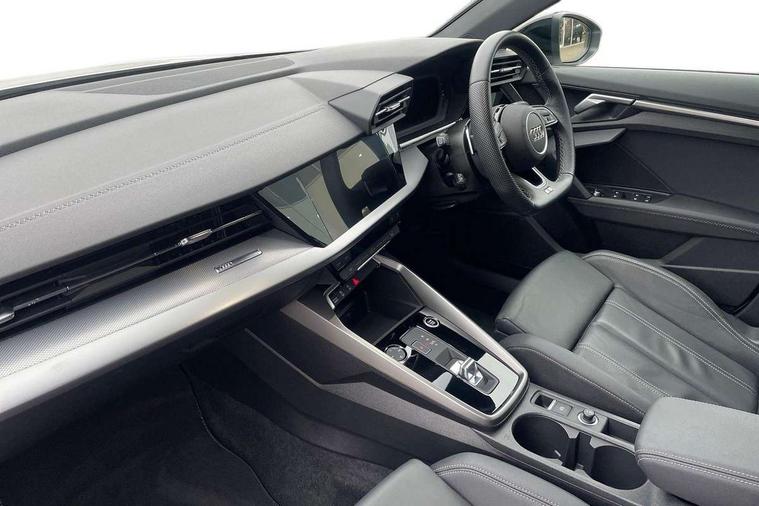 Audi drive select (Auto, Comfort, Dynamic, Efficiency and Individual), Audi smartphone interface, Audi Virtual Cockpit - 10.25" digital and colour instrument cluster, Automatic start/stop system with recuperation, Bluetooth interface, Camera based traffic sign recognition, Collision avoidance assistant, e-Call (emergency call), Electromechanical power speed sensitive steering, Lane departure warning system, MMI Navigation Plus with high resolution 10.1" colour touch screen display, Service indicator, Trip computer, Voice control system with natural language interaction, Sports suspension, 2xUSB-C connection with data and charging functions, 6 passive loudspeakers, CD player, DAB Digital radio, 3rd brake light, Acoustic glass windscreen, Audi beam uses LEDs to project the Audi logo onto the ground as you exit your A3, Auto dimming frameless rear view mirror, Electrically adjustable/heated/folding/dimming door mirrors with kerb view includes integrated LED indications + kerb view function for passenger side, Front electric windows, Illuminated door sills with aluminium inserts at the front with S logo, LED daytime running lights, LED headlights with LED rear lights and dynamic rear indicators, Light and rain sensors, Model and engine designation badges at rear, Privacy glass - dark tinted rear window, rear door and side windows, Rear boot, Rear electric windows, Rear side wing doors, S roof spoiler, 12V socket and storage compartment in front centre console, 3 seat bench in 2nd row, 3 spoke flat bottomed leather multifunction sport steering wheel with gear shift paddles, 4 way electrically adjustable lumbar support for driver and front passenger, 60/40 split folding rear seat bench, Black cloth headlining, Dual zone electronic climate control, Front and rear centre armrest in artificial leather, Front and rear headrests, Front/rear floor mats, Height and reach adjustable steering wheel, Interior lighting - glove compartment light and right hand side, Luggage compartment floor covering, Manual boot compartment lid, Single front passenger seat, Stainless steel pedals and front footrest in black, Twin leather upholstery with front sports seats S embossed logo, Aluminium interior elements pack - A3 Saloon, Black styling pack - A3 Saloon/Black edition, LED interior lighting pack - A3 Saloon, 3x3 point rear seat belts, Driver and front passenger airbag with passenger airbag deactivation, Electronic Stabilisation Control (ESC) including ABS, ASR and EDL, First aid kit with warning triangle and 2 safety vests, Front side airbags with head airbags and interaction airbag, Pre-sense front with pedestrian and cyclist detection, Seatbelt monitoring, Tyre pressure loss indicator, Anti theft alarm, Anti-theft wheel bolts, Electronically operated child locks, Immobiliser, Remote control central locking, Aluminium air vent surrounds, Dark spectrum aluminium inlays, accent surfaces in the dashboard and centre console in platinum grey silk effect paint finish, 19" 5 arm trapezoid design alloy wheels in matt grey with diamond cut finish,