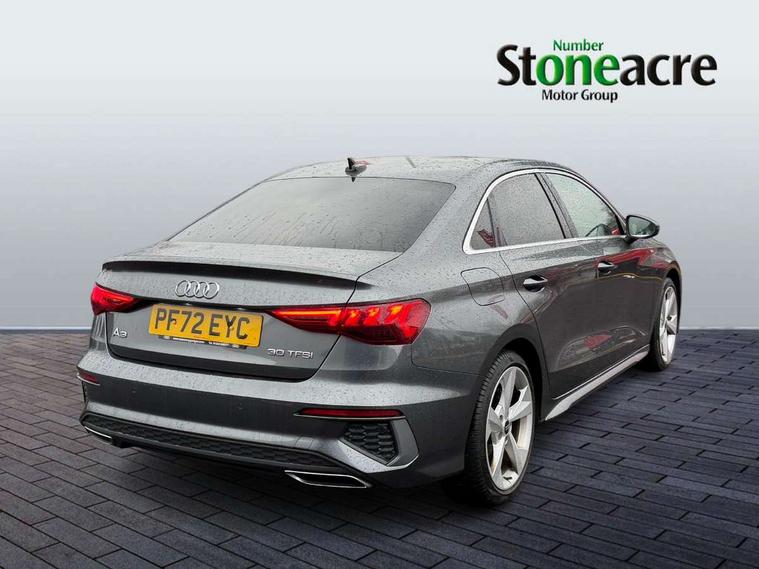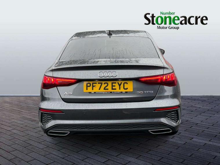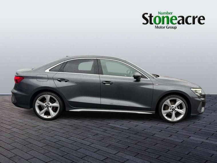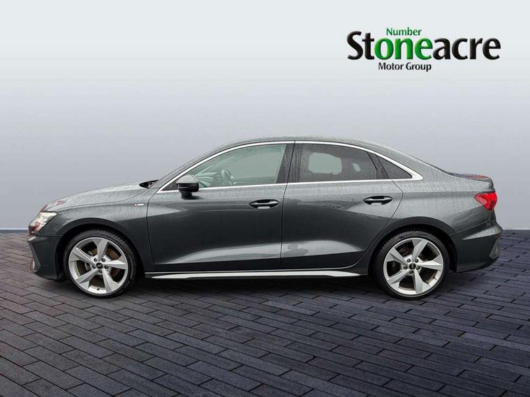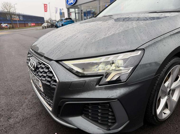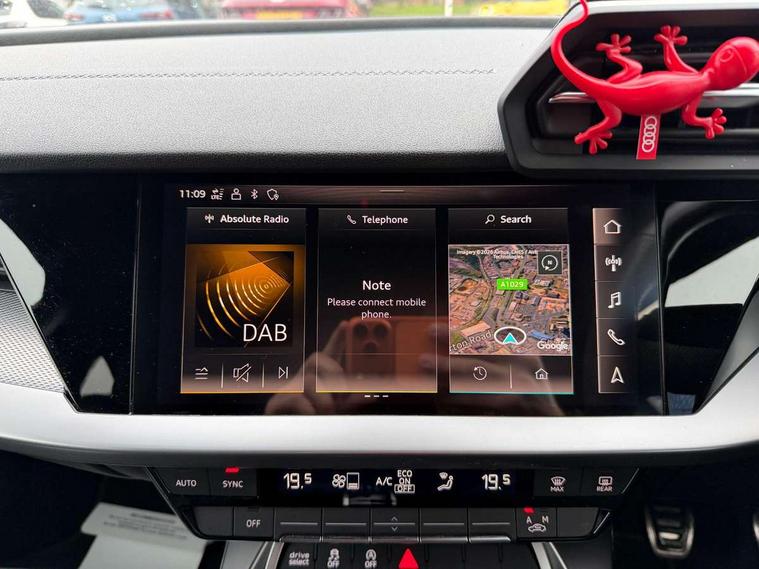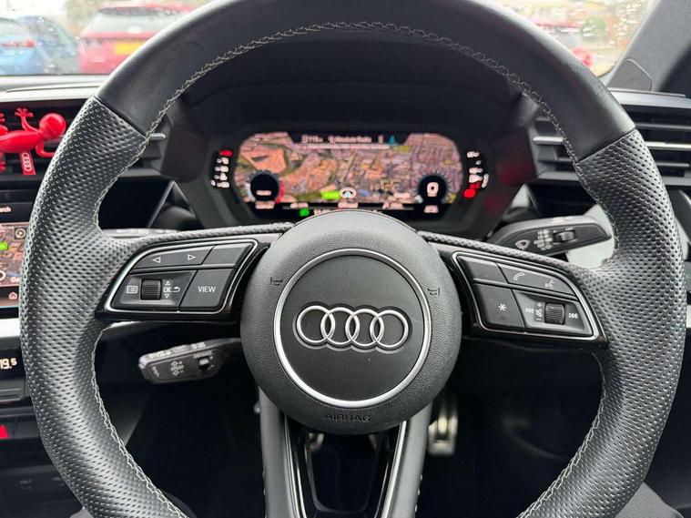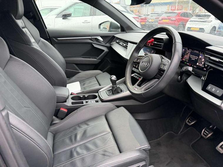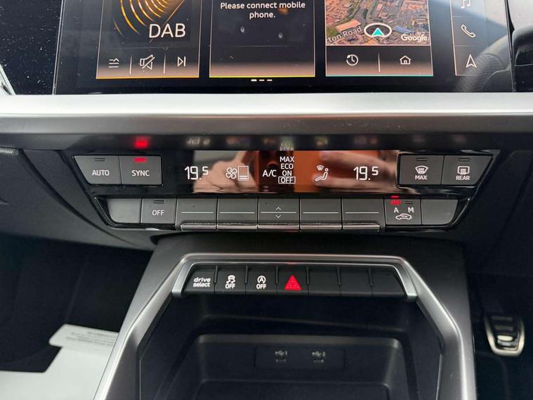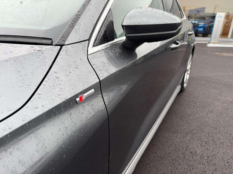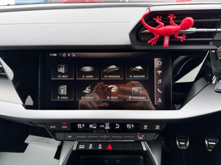 Audi connect emergency call and service, Audi drive select (Auto, Comfort, Dynamic and Individual), Audi smartphone interface, Audi Virtual Cockpit - 10.25" digital and colour instrument cluster, Automatic start/stop system with recuperation, Bluetooth interface, Collision avoidance assistant, Cruise control + speed limiter, Electromechanical power speed sensitive steering, Lane departure warning system, MMI Navigation Plus with high resolution 10.1" colour touch screen display, Rear parking sensors, Service indicator, Voice control system with natural language interaction, Sports suspension, 2x USB Type C ports (for charging and data transfer), 6 passive loudspeakers, CD player, DAB Digital radio, 3rd brake light, Acoustic glass windscreen, Aluminium window trim, Auto dimming frameless rear view mirror, Body colour exterior mirrors, Electrically adjustable/heated/folding/dimming door mirrors with kerb view includes integrated LED indications + kerb view function for passenger side, Front electric windows, Illuminated door sills with aluminium inserts at the front with S logo, LED daytime running lights, LED headlights with LED rear lights and dynamic rear indicators, Light and rain sensors, Model and engine designation badges at rear, Privacy glass - dark tinted rear window, rear door and side windows, Rear boot, Rear electric windows, Rear side wing doors, S line bumpers, S roof spoiler, 12V socket and storage compartment in front centre console, 3 seat bench in 2nd row, 3 spoke leather multifunction steering wheel, 40/20/40 split folding rear seat bench with cupholder, Black cloth headlining, Dual zone electronic climate control, Front and rear centre armrest in leather, Front and rear headrests, Front/rear floor mats, Height and reach adjustable steering wheel, Illuminated vanity mirror, Interior lighting - glove compartment light and right hand side, Luggage compartment floor covering, Manual boot compartment lid, Manually adjustable front sport seats, Seat side bolsters, Single front passenger seat, Stainless steel pedals and front footrest in black, Twin leather upholstery with front sports seats S embossed logo, Aluminium interior elements pack - A3 Saloon, LED interior lighting pack - A3 Saloon, S line styling pack - A3 Saloon, 3x3 point rear seat belts, Driver and front passenger airbag with passenger airbag deactivation, Electronic Stabilisation Control (ESC) including ABS, ASR and EDL, First aid kit with warning triangle and 2 safety vests, Front side airbags with head airbags and interaction airbag, Hill hold assist, Pre-sense front with pedestrian and cyclist detection, Seatbelt monitoring, Tyre pressure loss indicator, Anti theft alarm, Anti-theft wheel bolts, Electronically operated child locks, Immobiliser, Remote control central locking, Aluminium air vent surrounds, Aluminium trim elements, Dark spectrum aluminium inlays, accent surfaces in the dashboard and centre console in platinum grey silk effect paint finish,