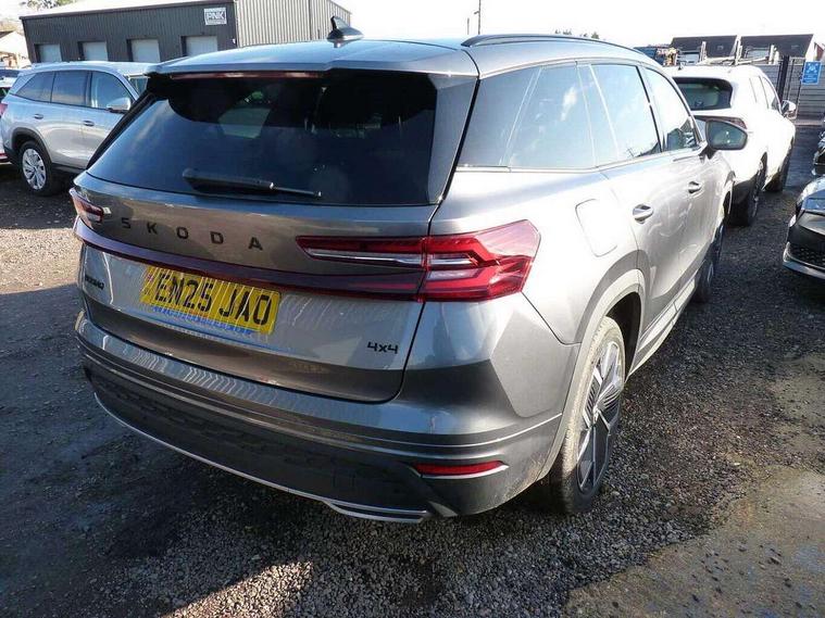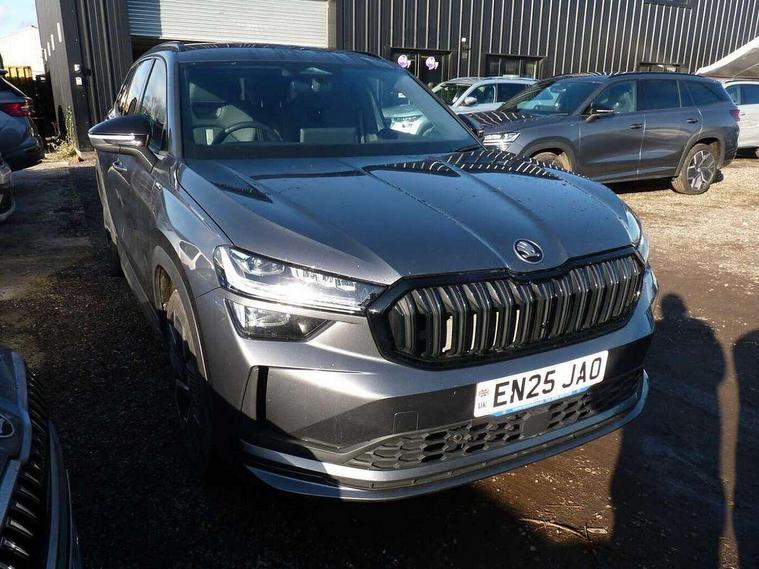 13" satellite navigation touchscreen display, Blind spot detection with door exit warning, Bluetooth system, ChatGPT functionality, Driver alert - Fatigue and drowsiness monitor, Dry display cleaner, Emergency call, Front and rear parking sensors, Front cross traffic assist, Lane assist, Off road modes, PAS, Rear traffic assist, Tailgate unlocking from outside, Traffic sign recognition, USB C Port x 2 in front centre console, Virtual Cockpit - 10.25" digital display, Voice control system, Wireless charging for two smartphones (15W) with cooling function, Wireless SmartLink for Apple CarPlay and Android Auto, Stop/start function, 2x USB-C in the rear, DAB Digital radio, Aero front windscreen wipers with intermittent function, Auto dimming rear view mirror, AWL (all weather lighting) and all weather light with cornering function, Black diffuser and decorative tailpipe with a unique dark chrome finish, Black roof rails, Black sports styling including front grille and window surrounds, Black wheel arch surrounds, Body colour door handles, Cornering light and poor weather light, Electric folding /adjustable/separted heated/folding door mirrors, auto dimming with boarding sports and memory function, Electric front and rear windows, Exterior black decorative trims, Front and rear sports bumpers including lower rear chrome strip, Gloss black door mirrors, Gloss black window frame and D pillar, Heat insulating glass in windshield, Heated rear window, Ice scraper in fuel tank cap, LED daytime running lights, LED third brake light in rear spoiler, Light assistant with automatic headlight control and coming home feature, Logo projection in door mirrors, Privacy glass, Rear roof spoiler, Rear side wing doors, Rear window wiper, Red decorative strip between rear LED lights, Safety reflectors on front and rear doors, Sportline badge on front fenders, Tailgate lettering in Black, Unique dark chrome design logo on alloy wheels, Window control switches with black trim, Windscreen wipers with rain sensor, Without engine designation, 1.5l bottle holder points in all door, 1x centre rear reading light, 2 seat bench in 3rd row, 3 configurable smart dials with 32mm coloured display, 3 seat bench in 2nd row, 4 foldable roof handles with rear coat hooks, Aluminium pedals, Ambient interior lighting - Dashboard, front-door stowage compartments, front and rear door panels and footwell lighting, Automatic gear selector on steering column, Chrome interior door handles, Driver/front passenger reading lights, Fabric headlining, Fixed bench 40:60:40 split folding backrests, Front and rear floor mats, Front centre armrest with jumbo box storage compartment, cup holder and 12V socket, Front sport seats, Height adjustable front headrests, Interior black decorative trims, Isofix child seat fittings in outer middle row rear seats and front passenger with top tether, Manually adjustable steering column, Pollen filter, Rear centre armrest with cupholders, Rear seat boot backrest release, Single front passenger seat, Skoda lettering on steering wheel, Storage pocket including mobile phone pockets on the backs of the front seats, Sunvisors with illuminated vanity mirrors, Three rear height adjustable headrests, Ticket holder on A Pillar, Tri zone climate control, Umbrella in door panel x1 made from sustainable materials, Upper and lower glovebox with card holder and coin compartment, USB C port by rear view mirror for charging only (15W), Acoustic package - Kodiaq, Performance package - Kodiaq, Sportline design selection pack - Kodiaq, Auto door release and activation of warning lights in the event of an accident, Driver and front passenger airbag with knee airbag and front passenger airbag deactivation, Electric child locks, Electronic parking brake, ESC (incl. ABS+EMD+MSR+ASR+EDL+HBA+DSR+RBS+ESBS+MCB+TSA+XDS), Front assist with braking reaction to vehicles, pedestrians and cyclists, Front disc brakes, Fuel cut off safety device, Height adjustable front 3 point seatbelts + pretensioners, Hill hold assist, Junction assist with automatic emergency braking, Rear disc brakes, Safety vest holder in door, Seat belt reminder for all seats, Three point rear seat belts, Two tone horn, Tyre pressure monitor, Alarm with interior monitoring and tilt sensor with safe function, Anti-theft wheel bolts, Immobiliser, Remote central locking with 2 keys, 20" Rila anthacite polished alloy wheel with black matte aero covers,