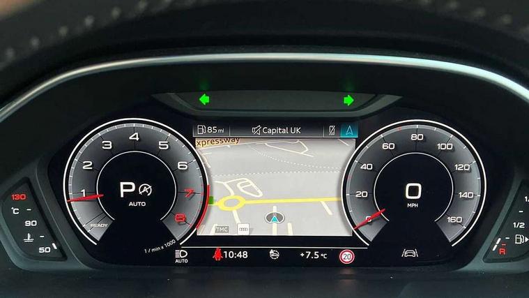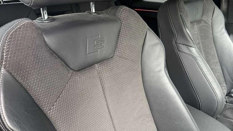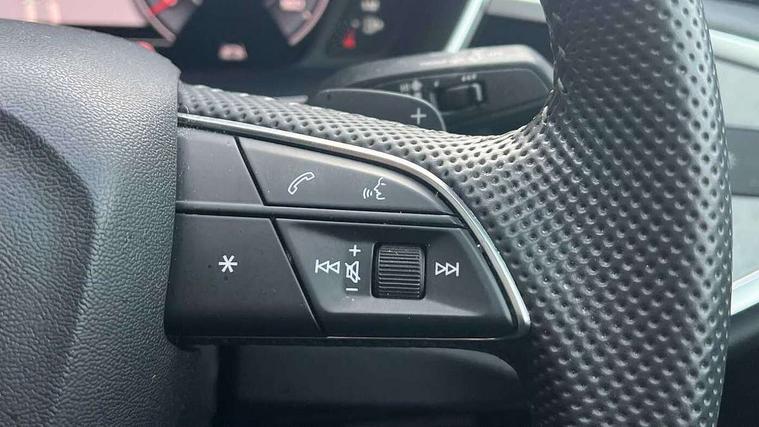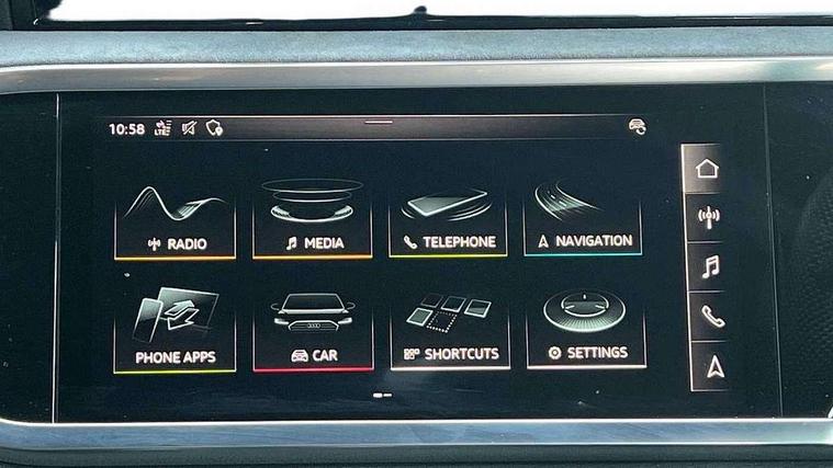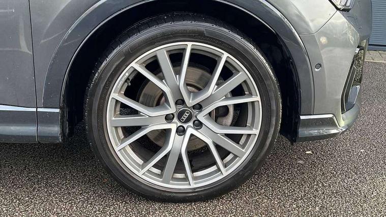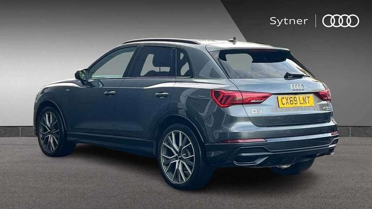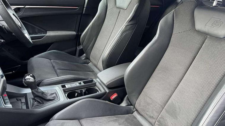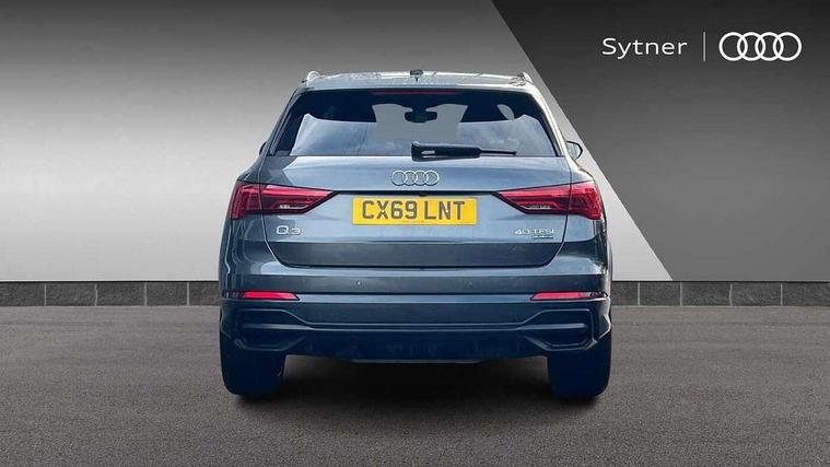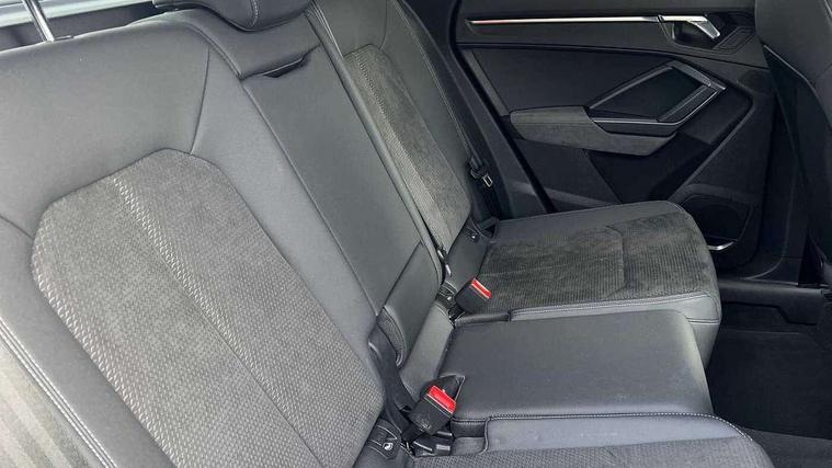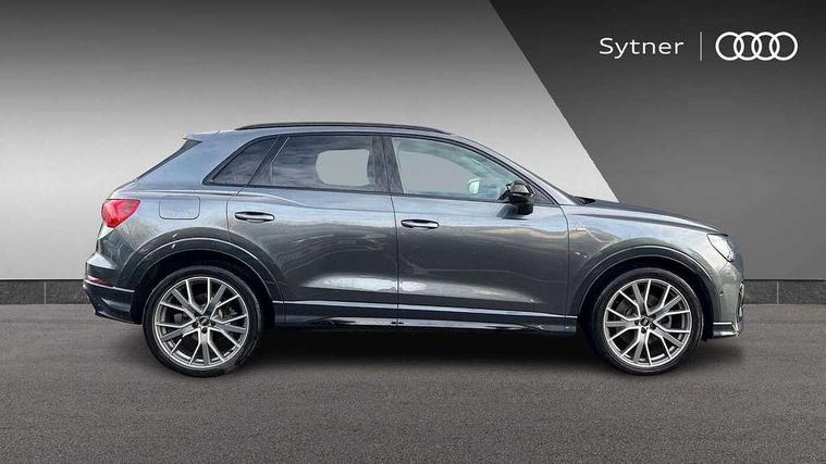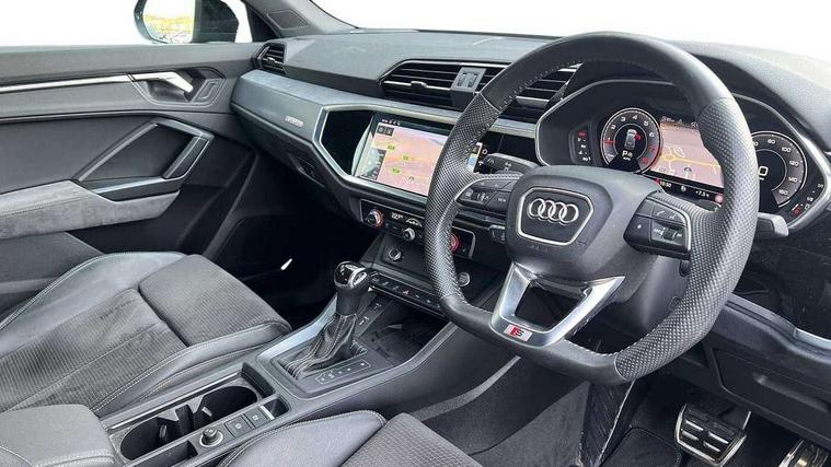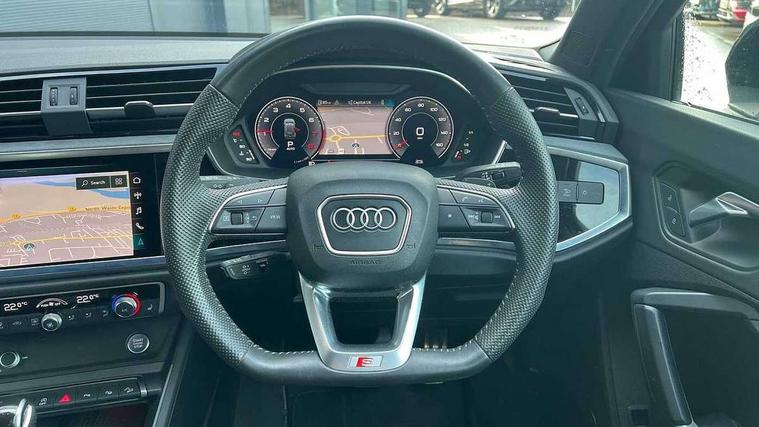 360 degree parking camera, Audi connect safety and service (e-call), Audi drive select, Audi lane departure warning, Audi parking system plus with front and rear sensors, Audi phone box with wireless charging, Audi side assist, Audi smartphone interface, Audi virtual cockpit plus, Bluetooth interface, MMI navigation plus with MMI touch, Power opening/closing tailgate, Progressive steering, Rear cross traffic alert, Service interval indicator, Stop/start system, Voice control system, Adaptive suspension with damping control, 1 x USB type C and 1 USB type A charging points, Bang & Olufsen 3D Premium Sound System, DAB digital radio module, Acoustic windscreen, Audi Beam uses LEDs to project the Audi Sport logo, Auto dimming and folding door mirrors, Auto dimming rear view mirror, Black roof rails, Contrast bumpers in Manhattan grey paint finish, Diffuser in matt Platinum grey, Electrically adjustable and heated door mirrors with integrated LED side indicators, Front and rear electric windows, Front fog lights, Front spoiler blade in matt platinum grey, Headlight washers, High gloss black finish B and C pillars, Matrix LED headlights with LED rear lights and dynamic front and rear indicator, Panoramic opening glass sunroof, Privacy glass, Rain and light sensors, Rear diffuser strip in matt titanium black, S line bumpers in contrasting Manhattan grey, 12V socket in rear centre console, 3 spoke flat bottomed high multi-function leather sport steering wheel with gearshift paddles, 4 way electric lumbar support for driver and front passenger, 40:20:40 split folding rear bench seat, Adjustable rear seat bench/backrest with centre armrest and cupholder, Aluminium door sill trims, Black cloth headlining, Dual zone climate control, Electrically adjustable front seats, Front and rear black floor mats with contrast stitching in rock grey, Front and rear headrests, Front and rear roof module including reading lights, Front centre armrest with storage compartment and angle adjustment, Glove compartment lighting, Heated front seats, Height and reach adjustable steering wheel, ISOFIX child seat mounting and Top Tether with front passenger airbag deactivation, Luggage compartment light, Perforated leather gearknob, Stainless steel luggage compartment sill finisher, Stainless steel pedals, Black styling pack - Q3, Driver Assistance Pack - Q3, Multi coloured extended ambient interior lighting pack - Q3, Non smoking pack - Q3, 3x3 point rear seatbelts, 6 airbags - Driver, front passenger, curtain and side windows, Audi pre-sense front with pedestrain and cyclist recognition, Electrically operated child locks on rear doors, Electromechanical parking brake, Electronic stabilisation control including ABS, ASR and EDL, Hill descent control, Hill hold assist, Pre sense basic, Seatbelt monitoring, Tyre pressure warning, Warning triangle and first aid kit, Advanced key, Anti theft alarm, Anti theft wheel bolts, Remote central locking, Dark matt brushed aluminium inlay, MMI touch colour display in gloss black with aluminium surround,