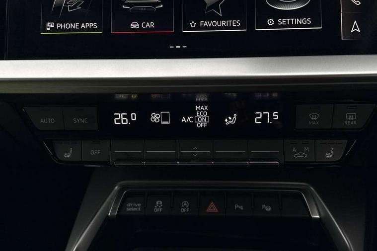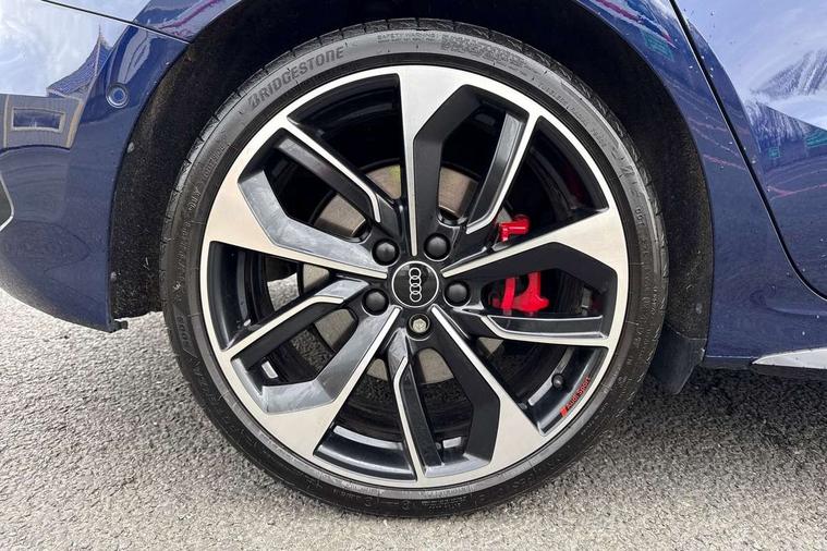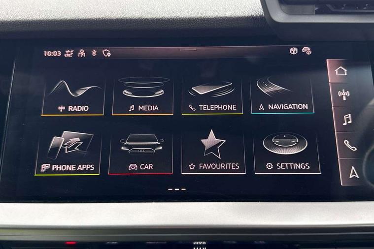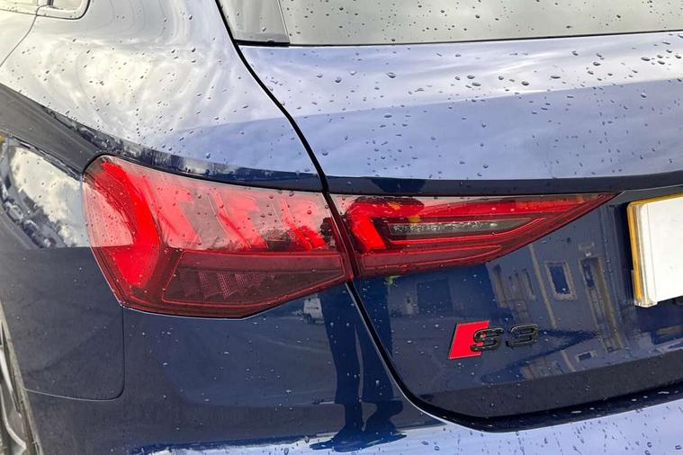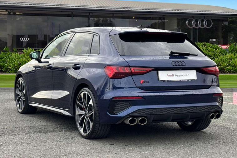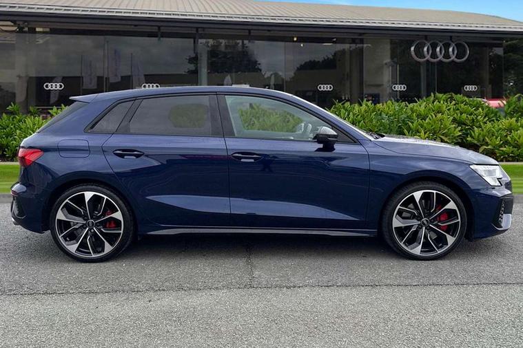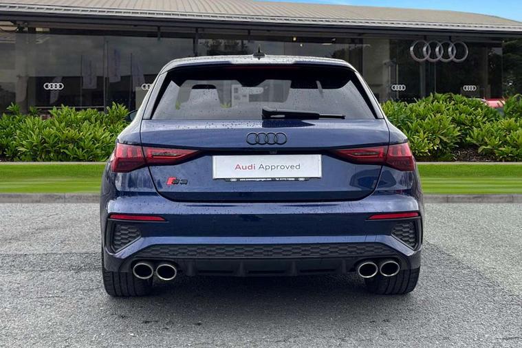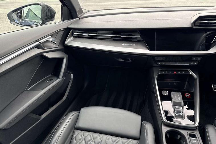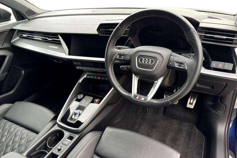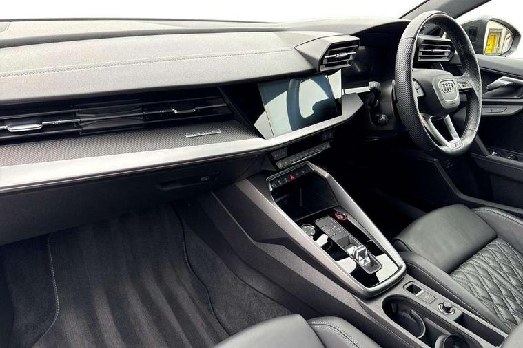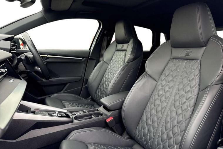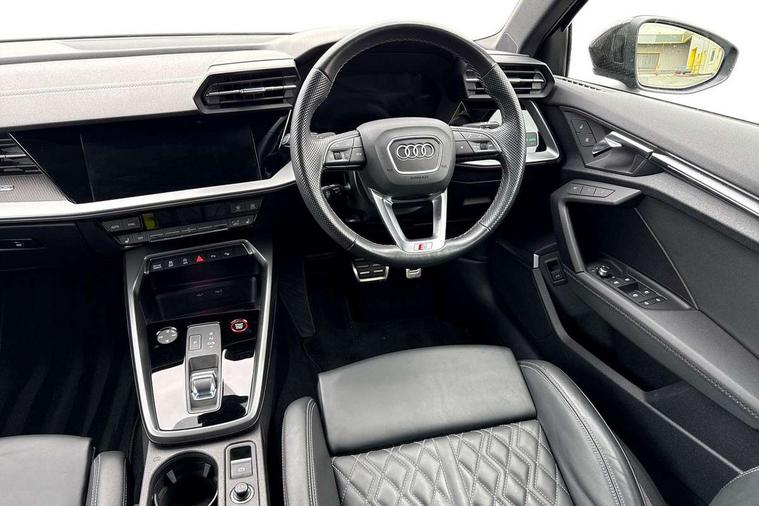Adaptive cruise assist, Audi drive select (Auto, Comfort, Dynamic, Efficiency and Individual), Audi smartphone interface, Audi virtual cockpit plus - 12.3" full HD resolution dynamic digital instrument cluster, Automatic start/stop system with recuperation, Bluetooth interface, Collision avoidance assistant, e-Call (emergency call), Head up Display, Lane change assistant with exit warning system and rear cross traffic alert, Lane departure warning system, MMI Navigation Plus with high resolution 10.1" colour touch screen display, Power operated tailgate - Luggage compartment lid opens/closes electrically, Progressive steering, Service indicator, Trip computer, Voice control system with natural language interaction, Quattro permanent all wheel drive, S suspension with damper control, 2xUSB-C connection with data and charging functions, DAB Digital radio, 3rd brake light, Acoustic glass windscreen, Audi Beam uses LEDs to project Vorsprung onto the ground as you exit your S3, Auto dimming frameless rear view mirror, Carbon door mirror housings, Dual branch oval twin tailpipes in chrome plated finish, Electrically adj heated/folding + automatically dimming exterior mirrors with memory + automatic kerb side function for passenger side exterior mirror, Front electric windows, Headlight washers, Heat insulating glass windscreen, Illuminated door sills with aluminium inserts at the front with S logo, Integrated LED indicators in door mirrors, LED daytime running lights, Light and rain sensors, Privacy glass - dark tinted rear window, rear door and side windows, Rear electric windows, Rear side air outlets in grained matt black, Rear side wing doors, Rear wiper, 12V socket and storage compartment in front centre console, 3 seat bench in 2nd row, 3 spoke leather multifunction steering wheel with gear shift paddles, 4 way electrically adjustable lumbar support for driver and front passenger, 60/40 split folding rear seat bench, Black cloth headlining, Dual zone electronic climate control, Fine Nappa leather upholstery with front sports seats S embossed logo, Front and rear centre armrest in artificial leather, Front and rear headrests, Front/rear floor mats, Height and reach adjustable steering wheel, Interior lighting - glove compartment light and right hand side, Luggage compartment floor covering, Seat side bolsters, Single front passenger seat, Stainless steel pedals and front footrest in black, Aluminium interior elements pack - A3 Sportback, Black styling pack - A3 Sportback/S3, Body styling design pack - S3, Extended ambient lighting pack - A3 Sportback, Storage pack - A3 Sportback, Technology pack pro with 360 camera - A3 Sportback/Voursprung, 3x3 point rear seat belts, Driver and front passenger airbag with passenger airbag deactivation, Electronic Stabilisation Control (ESC) including ABS, ASR and EDL, First aid kit with warning triangle and 2 safety vests, Front side airbags with head airbags and interaction airbag, Pre-sense front with pedestrian and cyclist detection, Seatbelt monitoring, Tyre pressure loss indicator, Anti theft alarm, Anti-theft wheel bolts, Electronically operated child locks, Immobiliser, Remote control central locking, Carbon inlays, accent surfaces in the dashboard and centre console in platinum grey silk effect paint finish,