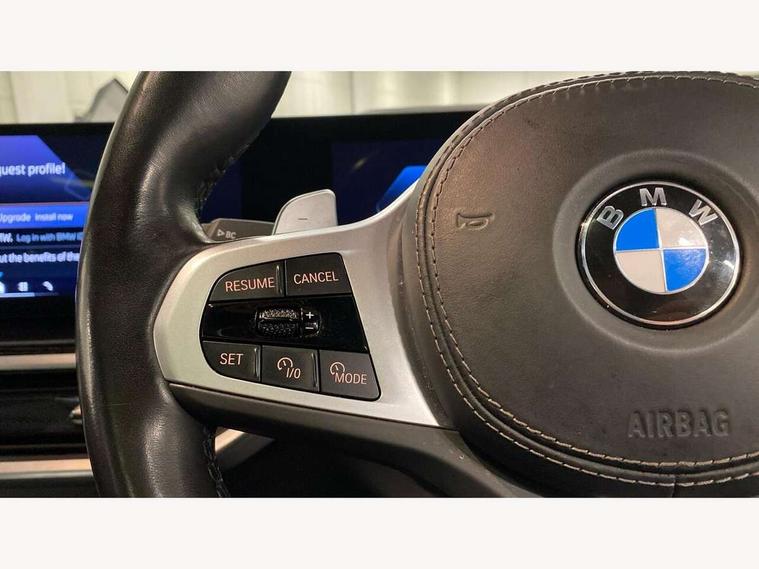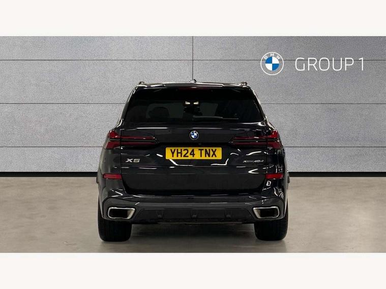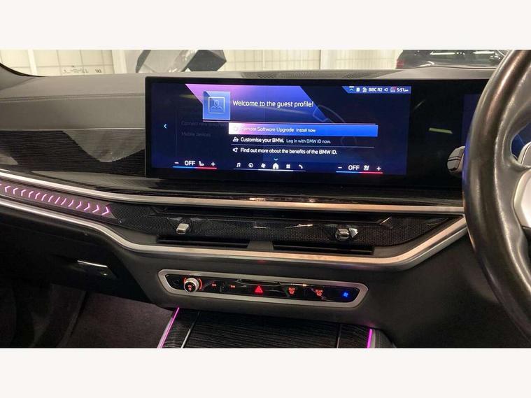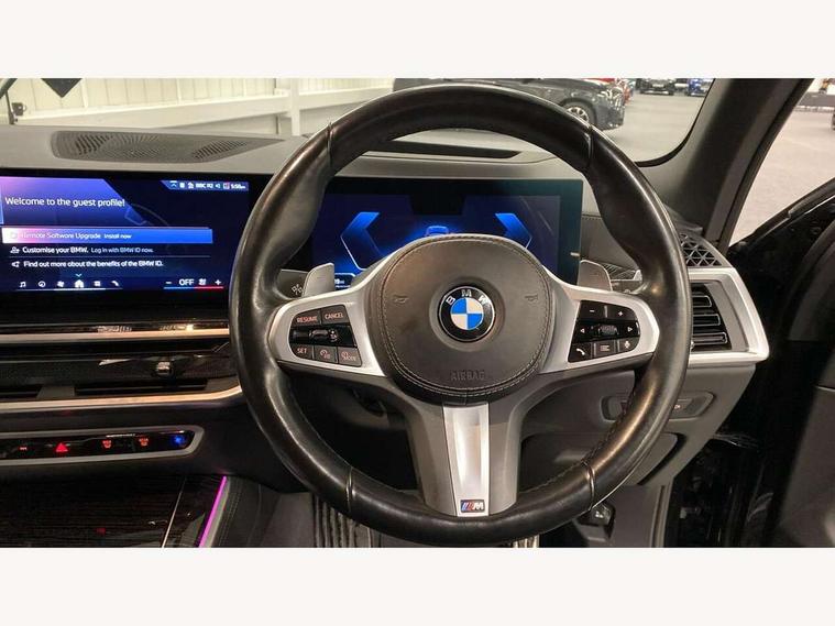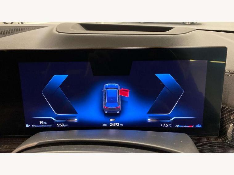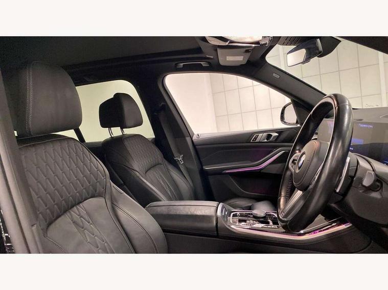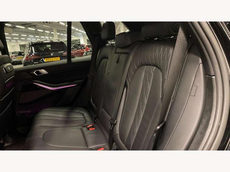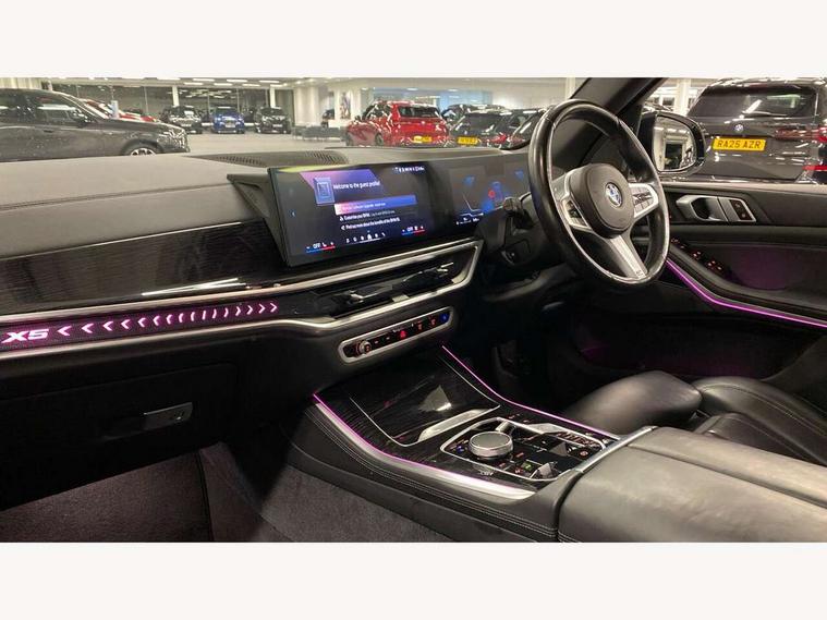Attentiveness assist, Automatic tailgate operation, BMW ConnectedDrive online services, BMW live cockpit + with curved 12.3 instrument cluster/14.9 central display, nav/Tuner with diversity reception, RDS/4GLTE/remote software upgrade, BMW Recovery system, BMW Teleservices, Condition based service, Cruise control with brake assist, eCall emergency call system, Enhanced bluetooth with wireless charging, Integrated owner's handbook, PAS, Speed limiter, Wi-Fi hotspot, Drive performance control with ECO PRO comfort + sport mode, Eight speed steptronic sport automatic transmission and gearshift paddles on the steering wheel, Hi-Fi loudspeaker system, Personal eSim, Adaptive LED Headlights, Front and rear electric windows, High beam assistant, High gloss black shadow line roof rails, LED daytime running lights, Rain sensor, Rear side wing doors, Third brake light in rear spoiler, Variable intermittent rear wash/wipe, 12V - Power sockets with 2x centre console and 1x luggage compartment, 3 seat bench in 2nd row, Foldable rear centre armrest with 2 cupholders and storage compartment, Front and rear side armrest integrated into door trim, Headrests for all seats, Luggage compartment separating net, Single front passenger seat, Three spoke sport M leather steering wheel, Velour floormats, Ambient light interior pack - X5, Driving assistant pack with radar based driver assistance system - X5, Expanded exterior mirror pack - X5/X5 M, M aerodynamics pack - X5, 3 rear seatbelts, Active protection, Airbags - driver/front passenger, rear and side, first and second row seats head airbags, front passenger seat airbag deactivation + knee airbag, Anti-lock braking system (ABS), Automatic Stability Control (ASC), Brake energy regeneration, Cornering brake control (CBC), Crash sensor activating central locking release, hazard warning lights, fuel cut off, interior lighting + activation of safety battery terminal clamp, DSC - Dynamic Stability Control, Dynamic Traction Control - DTC, Electromechanical parking brake with automatic drive away release and auto hold function, Electronic brake force distribution, Hill start assistant, M Sport blue painted brake calipers with 'M' designation, Mechanical child proof lock on rear doors, Tyre pressure monitoring system, Tyre pressure sensors, Ventilated front and rear disc brakes, Warning triangle and first aid kit, Alarm system, Closing system with central locking, Comfort access system, Locking wheel bolts,