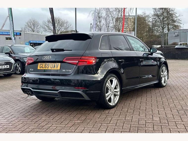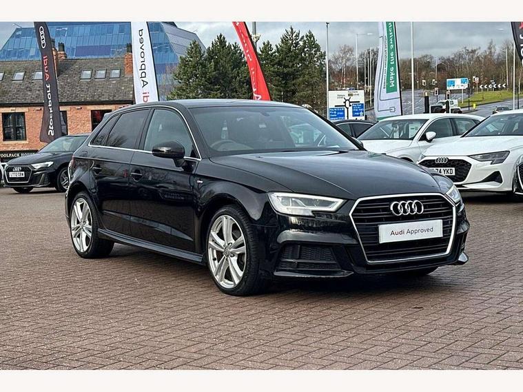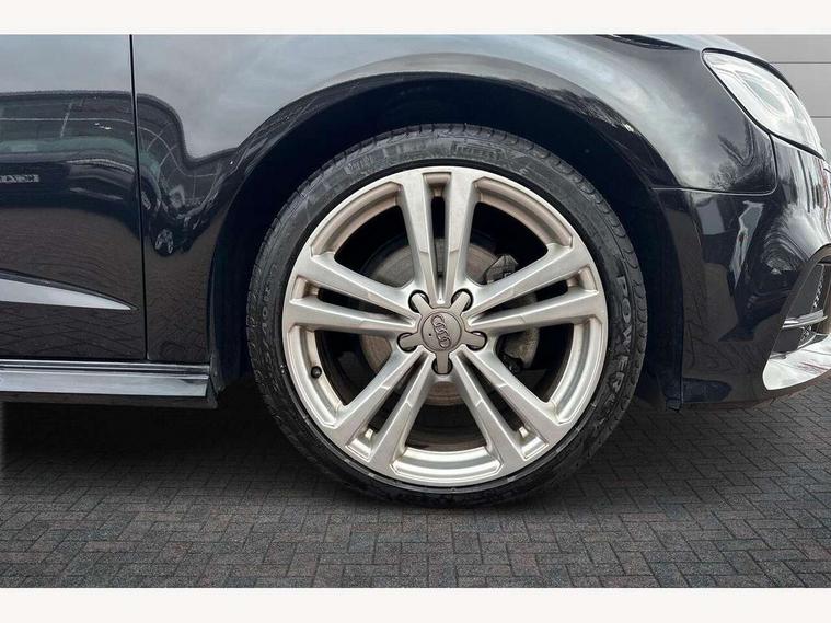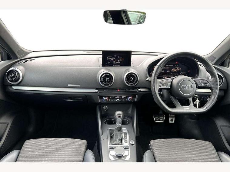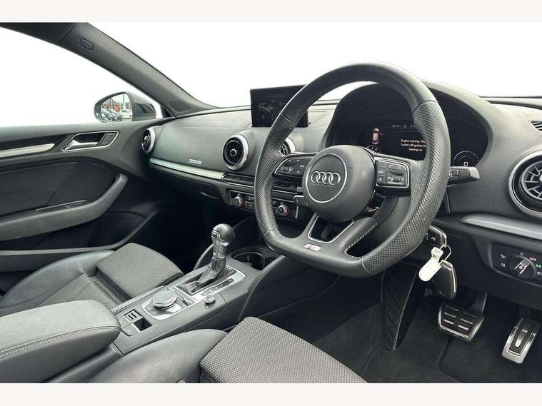 Audi drive select, Audi smartphone interface, Automatic start/stop system, Colour driver's information system display, Electro - mechanical power assisted steering, Mobile telephone preparation - bluetooth interface, SD card based MMI navigation, Service interval indicator, Speed limit display, Voice control system, Voice recognition for navigation system, Sports suspension, 2 USB interfaces and Aux-In jack, Audi music interface, CD player, DAB Digital radio, MMI radio plus with 7" colour MMI screen and MMI controller, Online entertainment, Aluminium window trim, Auto dimming interior rear view mirror, Body colour door mirrors, Chrome exhaust tailpipes, Electric front windows, Electric rear windows, Electrically adjustable and heated door mirrors with integrated LED side indicators, Heated windscreen washer jets, LED daytime running lights, Light and rain sensors, Matt black radiator grille, Rear wiper, S line badges on front wings, S Line body styling with front & rear bumpers and side skirts, radiator grille and rear diffuser insert, roof spoiler, Sport specific side air inlet grille and diffuser insert, 3 adjustable rear headrests, 60/40 split folding rear seat, Adjustable front centre armrest, Black cloth headlining, Dual zone electronic climate control, Flat bottom 3 spoke multifunction leather sport steering wheel with gear-shift paddles plus S badging and grips in perforated leather, Front and rear interior lights with delay, Front/rear floor mats, Height and reach adjustable steering wheel, Illuminated door sill trims with S logo, Isofix child seat preparation for front passenger/outer rear seats inc passenger airbag deactivation including top tether, Lashing point in luggage compartment, Manual height adjustable front seats, Stainless steel pedals, Storage compartments in doors side trims, centre console and under front drivers seat, LED interior light pack - A3/RS3, Non smoking pack - A3, Storage and luggage pack - A3/RS3, 3 point seatbelts on all seats, ABS/EBD, Active bonnet, Active front headrests, Airbags - front driver/passenger, front & rear side, curtain, drivers knee, ASR, EDL, Electromechanical parking brake, ESC - Electronic Stability Control + traction control, Front passenger airbag deactivation, Hill hold assist, Manual rear child locks, Multi-Collision braking, Seatbelt warning, Tyre pressure warning, Warning triangle and first aid kit, Anti theft alarm, Anti-theft wheel bolts, Remote control central locking, Thatcham category 1 alarm + immobiliser, Aluminium air vent surrounds, Aluminium trim elements, Matt brushed aluminium inlays, Tool kit, Tyre repair kit,