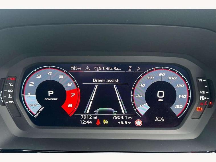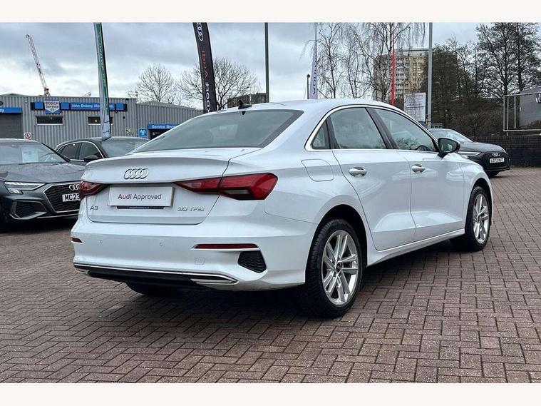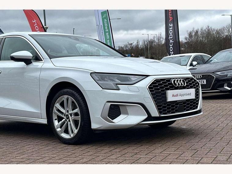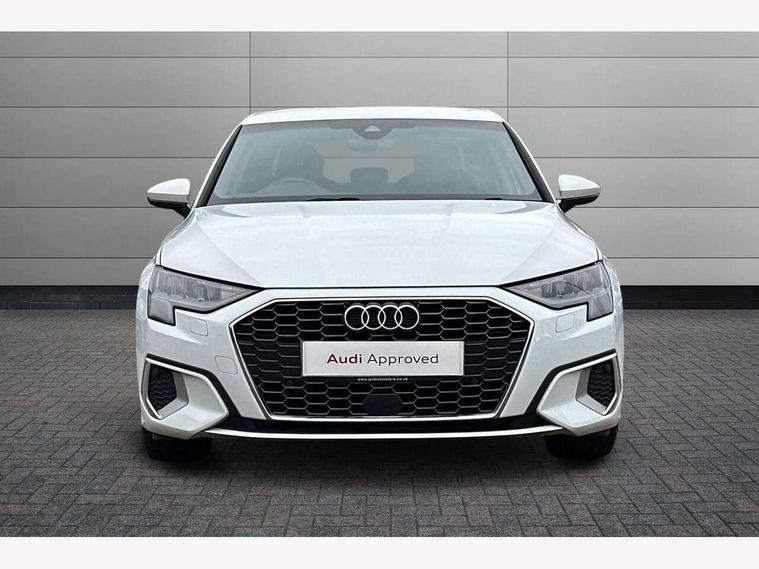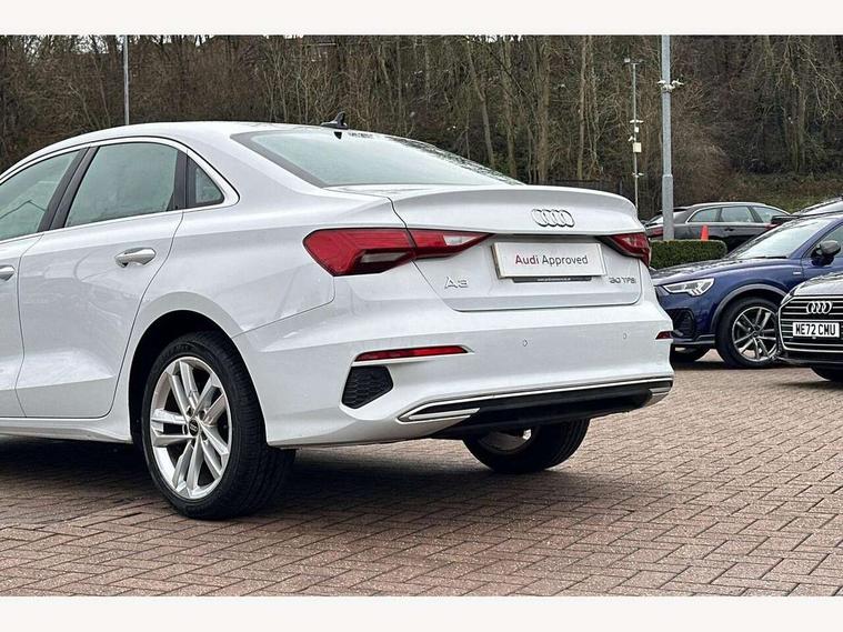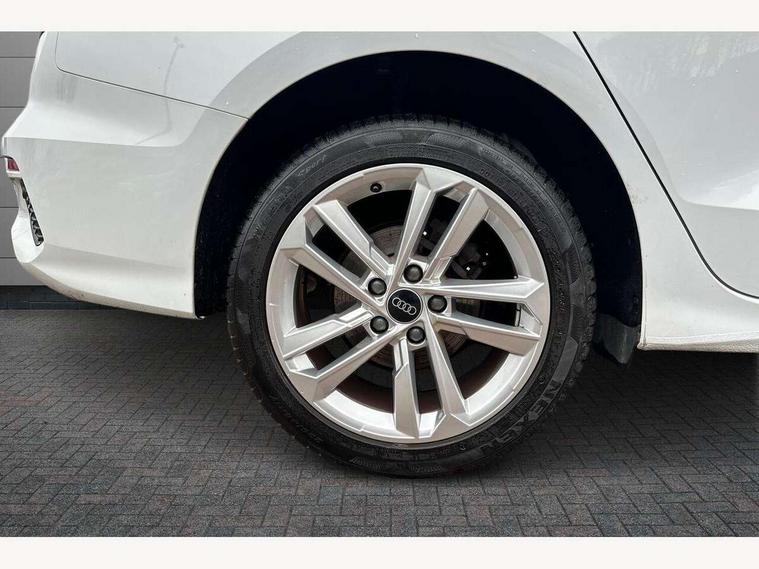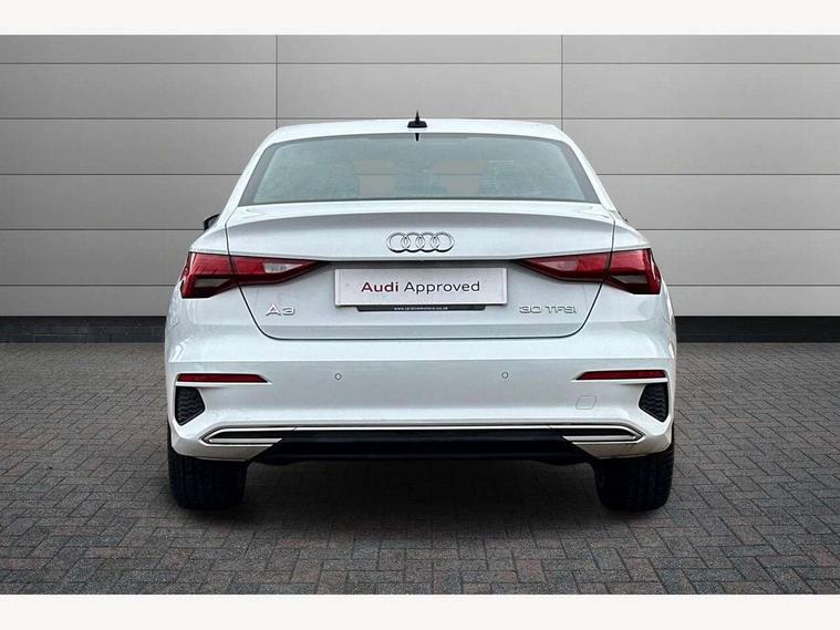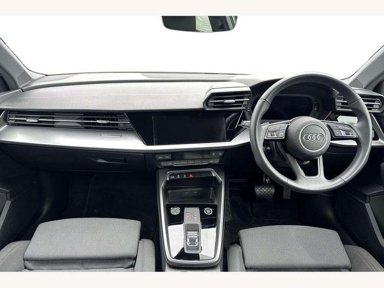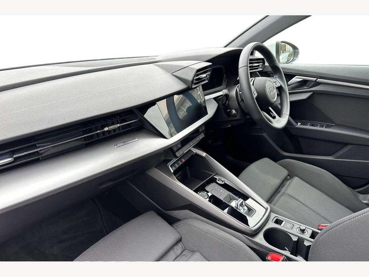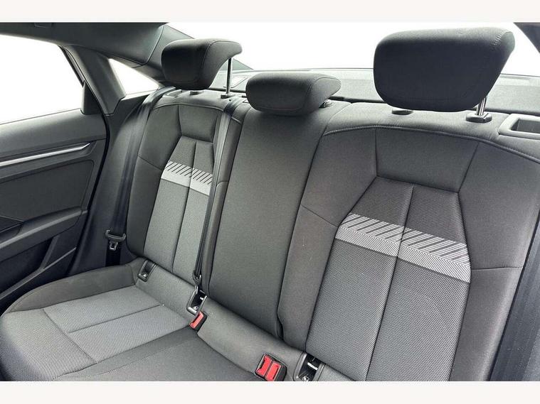 Audi drive select (Auto, Comfort, Dynamic and Individual), Audi smartphone interface, Audi Virtual Cockpit - 10.25" digital and colour instrument cluster, Automatic start/stop system with recuperation, Bluetooth interface, Camera based traffic sign recognition, Collision avoidance assistant, e-Call (emergency call), Electromechanical power speed sensitive steering, Lane departure warning system, MMI Navigation Plus with high resolution 10.1" colour touch screen display, Service indicator, Trip computer, Voice control system with natural language interaction, Standard suspension, 2xUSB-C connection with data and charging functions, 6 passive loudspeakers, CD player, DAB Digital radio, 3rd brake light, Acoustic glass windscreen, Aluminium window trim, Auto dimming frameless rear view mirror, Body colour exterior mirrors, Body colour roof spoiler, Electrically adjustable/heated/folding/auto dimming door mirrors with integrated LED indications + kerb view function for passenger side, Front electric windows, LED daytime running lights, LED headlights and halogen rear lights, Light and rain sensors, Model and engine designation badges at rear, Rear boot, Rear electric windows, Rear side wing doors, Rear window, rear door windows and rear side windows in clear glass, 12V socket and storage compartment in front centre console, 3 seat bench in 2nd row, 3 spoke leather multifunction steering wheel with gear shift paddles, 4 way electrically adjustable lumbar support for driver and front passenger, 60/40 split folding rear seat bench, Dual zone electronic climate control, Front and rear headrests, Front centre armrest, Front door sill trims with aluminium inlay, Front/rear floor mats, Height and reach adjustable steering wheel, Interior lighting - Front and rear roof module including reading lights, glove compartment light and right hand side, Interior lighting - glove compartment light and right hand side, Luggage compartment floor covering, Manual boot compartment lid, Manually adjustable front seats, Routine cloth upholstery with front sports seats, Seat side bolsters, Single front passenger seat, Steel grey cloth headlining, Aluminium interior elements pack - A3, LED interior lighting pack - A3 Saloon, Sport styling pack - A3 Saloon, 3x3 point rear seat belts, Driver and front passenger airbag with passenger airbag deactivation, Electronic Stabilisation Control (ESC) including ABS, ASR and EDL, First aid kit with warning triangle and 2 safety vests, Front side airbags with head airbags and interaction airbag, Pre-sense front with pedestrian and cyclist detection, Seatbelt monitoring, Tyre pressure loss indicator, Anti theft alarm, Anti-theft wheel bolts, Electronically operated child locks, Immobiliser, Remote control central locking, Aluminium air vent surrounds, Inlays with silk effect paint in platinum grey,