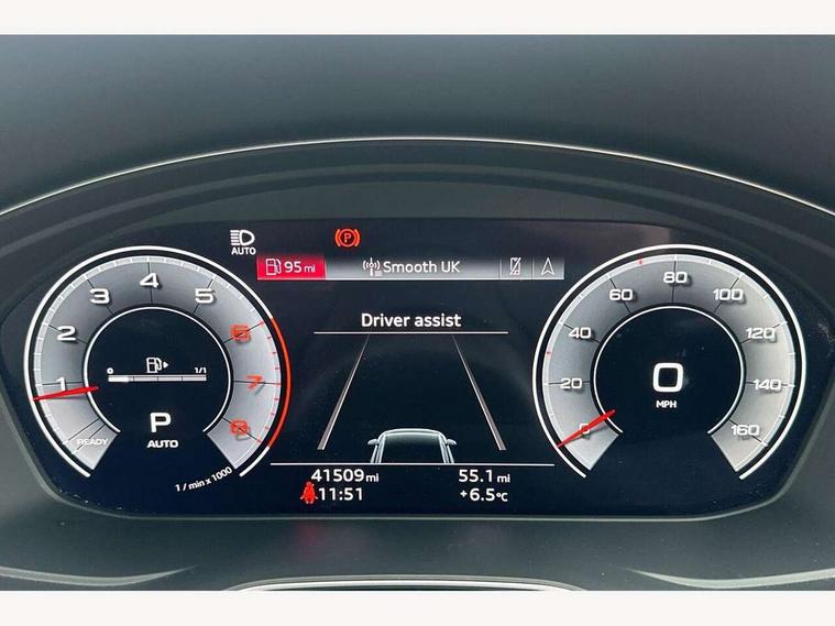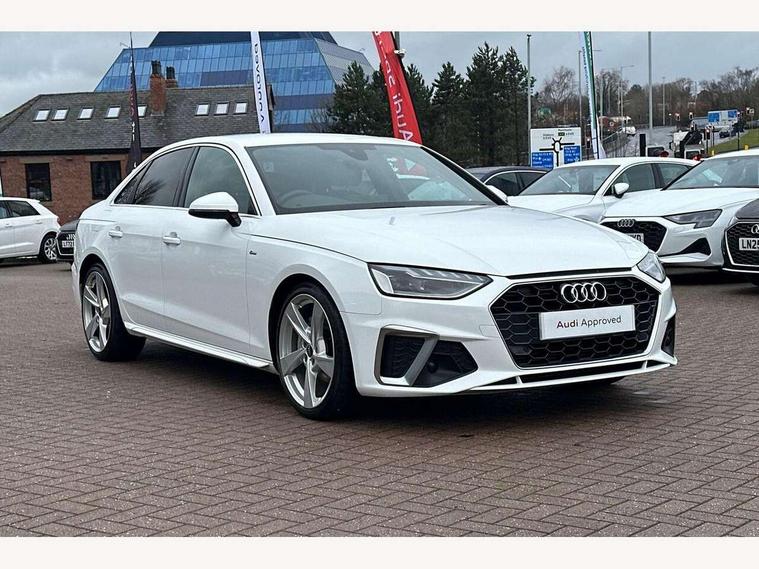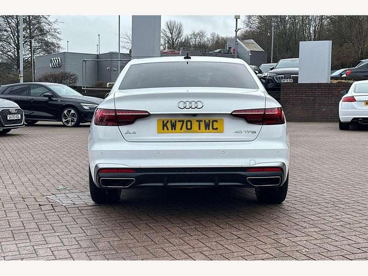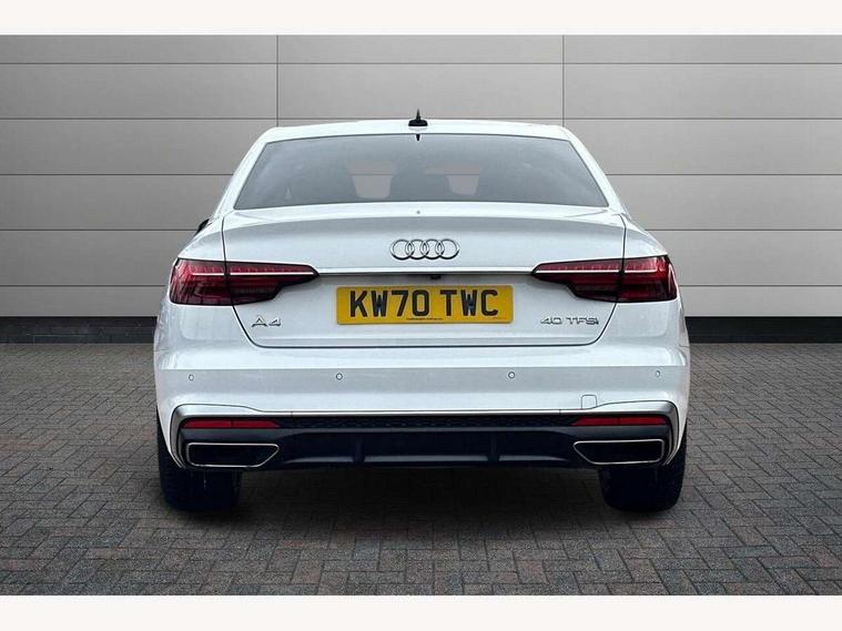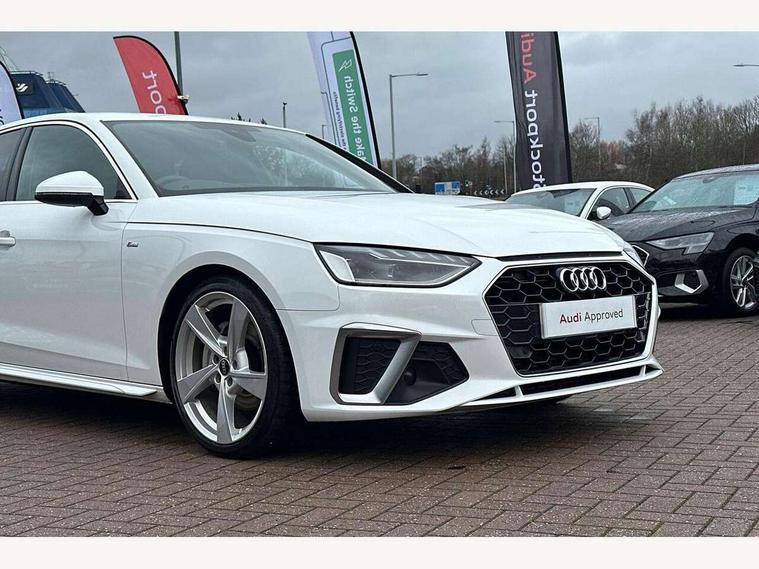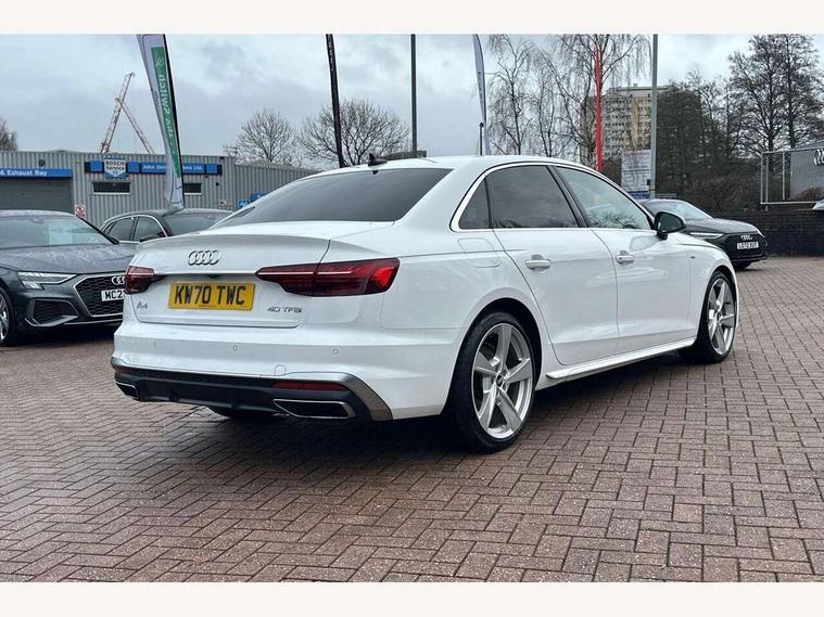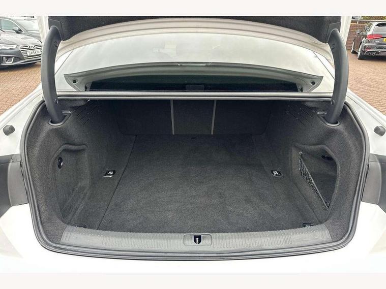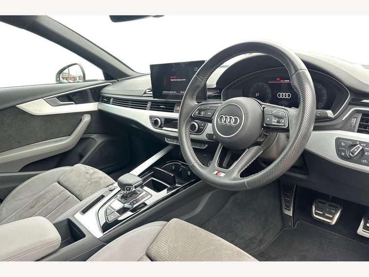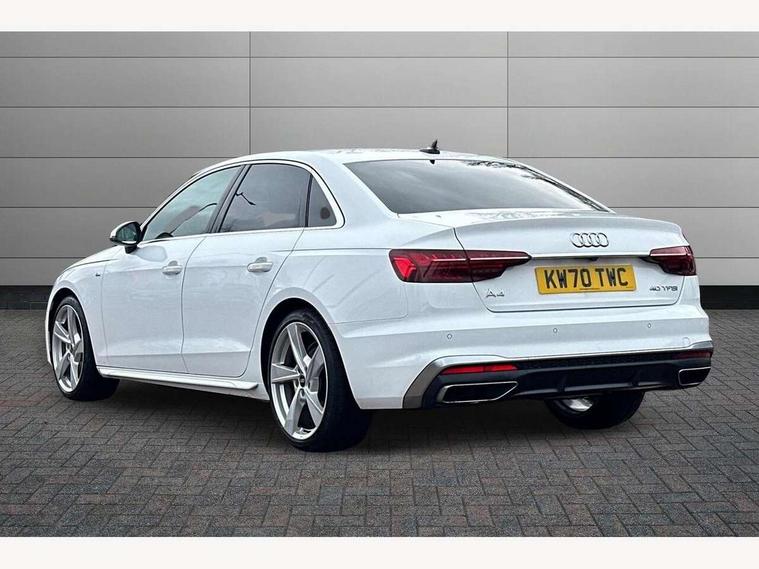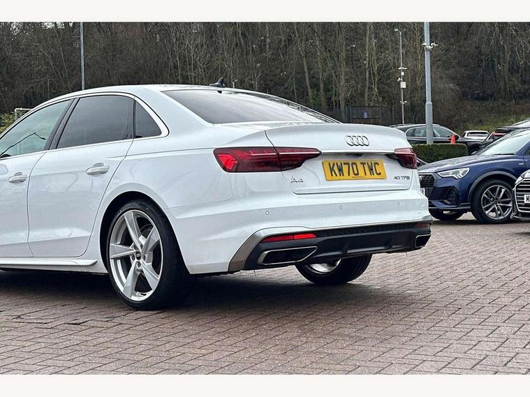 Audi connect safety and service (e-call), Audi drive select, Audi parking system plus with front and rear sensors, Audi smartphone interface, Audi virtual cockpit, Automatic start-stop system with coasting functionality and efficiency programme, Bluetooth interface, Electric boot lid release, Electromechanical power steering, MMI Navigation plus with MMI touch includes 10.1" high resolution colour MMI display, 3D map, Rear view camera, Voice control system, 54 litre fuel tank, Sports suspension lowered by 23mm, 2 USB charging ports, 8 passive loudspeakers, DAB digital radio reception, Auto dimming rear view mirror, Body colour door handles, Body colour front spoiler lip, Body colour side sill trim, Body coloured door mirrors, Electrically folding auto dimming/adjustable/heated door mirrors with LED side indicators and kerb view function for passenger side, Grained matt black side air inlets with matt aluminium silver inlay, High beam assistant, Honeycomb structure radiator grille in grained matt black, LED headlights with LED rear lights + dynamic rear indicators + headlight adjustment and high beam, turning light + LED daytime running lights, Matt aluminium silver tailpipe trim, Rain and light sensors, S Line badges on the front wings, S line front and rear bumpers with side skirts, S Line rear diffuser in matt titanium black with trim strip in matt aluminium silver, Windscreen with acoustic glazing, 4 way electric lumbar support for driver and front passenger, 40/20/40 split folding 3 rear seat bench in 3 parts with rear centre armrest, Black cloth headlining, Black perforated leather gearknob, Contrast stitching on seats, steering wheel and gear lever gaiter, Deluxe 3 zone electronic climate control, Door sill trims with aluminium inlay, Front and rear head restraints, Front centre armrest, Heated front seats, Illuminated door sill trims with S logo, ISOFIX child seat mounting and top tether, Manual seat adjustment, Stainless steel pedals and foot rest, High gloss package - A4, LED Interior light pack - A4/S4, 3 rear seatbelts, 6 airbags - Driver, front passenger, curtain and side windows, Electronic Stabilisation Control (ESC) including ABS, ASR and EDL, Hill hold assist, Multi collision brake assist, Pop-up bonnet for pedestrian protection, Pre sense city, Seatbelt monitoring, Warning triangle and first aid kit, Anti theft alarm, Anti theft wheel bolts, Keyless Go, Matt brushed aluminium inlays, Tool kit, Tyre repair kit,