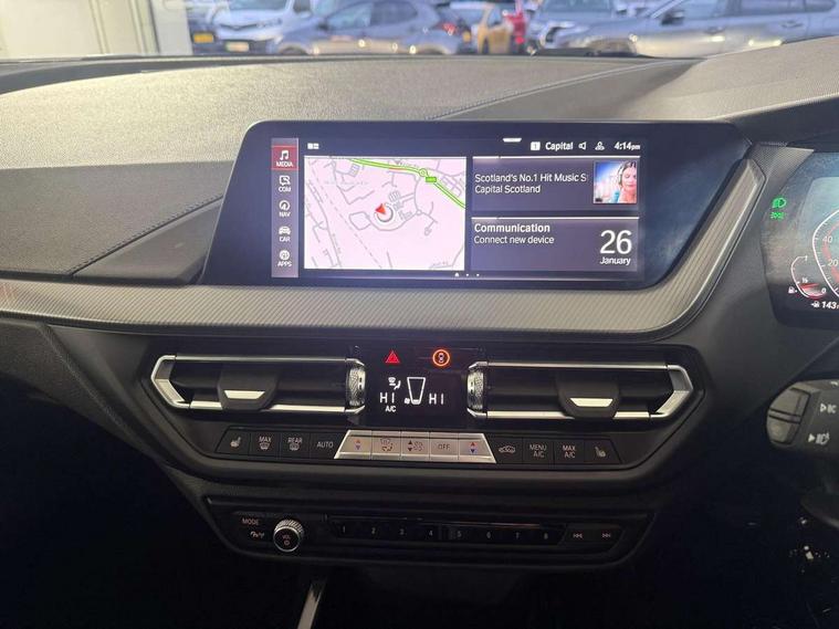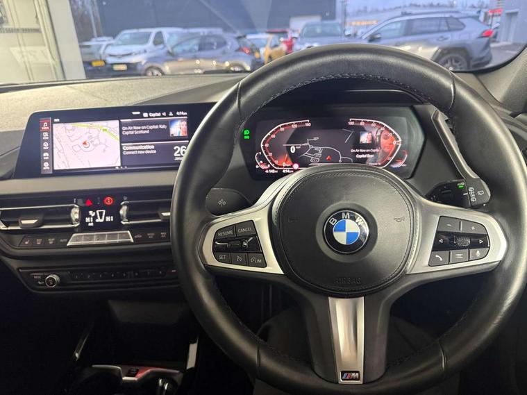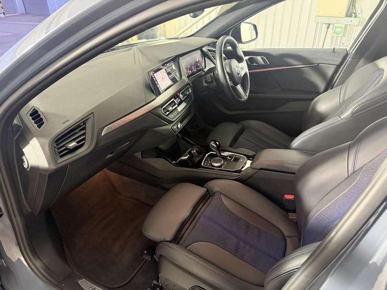 Active guard plus, Attentiveness assist, BMW ConnectedDrive online services, BMW Teleservices, Check Control warning system for monitoring of lights and door/luggage compartment open warning, Cruise control with brake assist, Eco pro mode, Front axle single joint with specific axle kinematics to minimise drive influences on steering + provide increased rigidity agile driving behaviour, Integrated owners handbook, Lane departure warning system, Oil sensor for level and grade, On board computer, Optimum shift indicator, Personal Profile, Pull away assistant, Rigidly mounted rear subframe - Multi link construction with separate spring / damper configuration and excellent driving characteristics, Speed limit Info including no-overtaking indicator, Speed limiter, Aluminium lightweight construction, Anti roll bar front and rear, Balancer shaft, Double VANOS twin scroll turbocharging system, Drive Performance Control, Electronic differential lock, High precision injection, M sport suspension, Petrol Particulate Filter, Twin tube gas filled shock absorbers with degressive characteristic curve, VALVETRONIC engine management, DAB Digital radio, Auto dimming rear view mirror, Automatic headlight beam throw control, Automatic windscreen wipers and automatic headlight, Body colour door handles, Body colour mirror caps, Body colour roof trims, Chrome 'M' logo side designation, Chrome exhaust twin tailpipes round 90mm in left, Chrome kidney grille frame with Satin Aluminium struts, Direction indicator side lights in exterior mirrors, Fading support, Folding side mirrors with auto dimming/folding wing mirrors with auto dimming, Follow me home headlights, Front and rear bumper system with replaceable deformation elements, Front and rear electric windows with open and close fingertip control, anti trap facility and comfort closing, Front door sill finishers in black plastic with M designation in metallic look, Green tinted heat protection glazing, Heated, electrically adjustable exterior mirror aspheric on driver side, convex on passenger side, High gloss shadowline window frame, Recess cover mirror frames and B/C pillar embelisher trim, High level third brake light, Integrated front windscreen with washer jets, LED daytime running lights, LED eyebrow turn indicators, LED front fog lights, LED Headlights, Lightweight engineering, Matt black air guide grilles, Matt black wheel arch trim, Model designation on electric bootlid, Nearside reverse light in rear light cluster, Preparation for high beam assistant, Rear fog lights, Rear side wing doors, Rear window wiper, Shark fin antenna, Trailer stabilisation logic, Visible VIN plate, Welcome lighting, 12V power socket in front centre console with blanking plug, 3 rear seat head restraints, 3 seat bench in 2nd row, 3 spoke sports leather steering wheel with black leather and stitching, pearl chrome decorative finish, specific M Badge, Anthracite headlining, Black boot net with lashing eyes, Cargo function on 2nd seat row, Child seat ISOFIX attachment for two outer rear seats and front passenger seat with anchorage points, Conditioned based service, Driver and front passenger seat heating, Folding rear clothes hook, Four grab handles integrated in roof lining, Front and rear door pockets with bottle holders, Front and rear side armrest integrated into door trim, Front armrest, Front sports seats, Glove compartment, Height adjustable front head restraints, Luggage compartment for bag hooks on left and right, foldable luggage compartment liner and four lashing eyelets, Manual adjust steering wheel, Multi-function controls for steering wheel, Single front passenger seat, Storage compartment in centre console, Sun visors with vanity mirrors and insert tab, Two front centre console cupholders, Two zone automatic air conditioning, Velour floor mats, Additional interior lighting pack - 1 Series, BMW live cockpit professional pack- 1 Series, Connected pack professional - 1 Series, Interior lights pack - 1 Series, M Sport exterior styling aerodynamics pack - 1 Series, 2 tone horn, 3 point seatbelts on all seats, front pyrotechnic belt tensioners, stopper and belt force limiters, rear coded belt buckles, Airbags - Front driver/passenger, front and rear curtain head protection, front side, manual deactivation of front passenger airbag, Anti lock braking system (ABS) with brake assist, BMW emergency call, Brake drying, Braking readiness, Child proof locking system in rear door, City braking function, Comfort modes, Cornering brake control, Crash sensor activating central locking release, hazard warning lights, fuel cut off, interior lighting + activation of safety battery terminal clamp, Driver and front passenger seat belt security check, Dynamic stability control + (DSC+), Dynamic Traction Control - DTC, Electrically operated hand brake including automatic hold function, Front and rear disc brakes, Seatbelt warning, Side impact protection, Tyre pressure monitoring system, Warning triangle and first aid kit, Central locking switch for all doors, fuel filler cap and luggage compartment, Deadlocking function system to all doors, Drive away locking system on all doors and luggage compartment with de-activated in iDrive settings, Locking wheel bolts, Remote control with integrated key with High-gloss Black inlay and M designation and 1 button for open/ close lock, window, open luggage compartment, Start/stop button illuminated in centre console with keyless engine start and auto start stop deactivation button, Thatcham Cat.1 alarm and immobiliser, Wheel slip limitation close to the actuator (ARB), Contrast stitching on instrument panel, Electrically powered 12V compressor, Reduced rolling resistance tyres,
