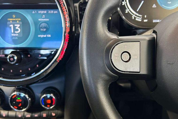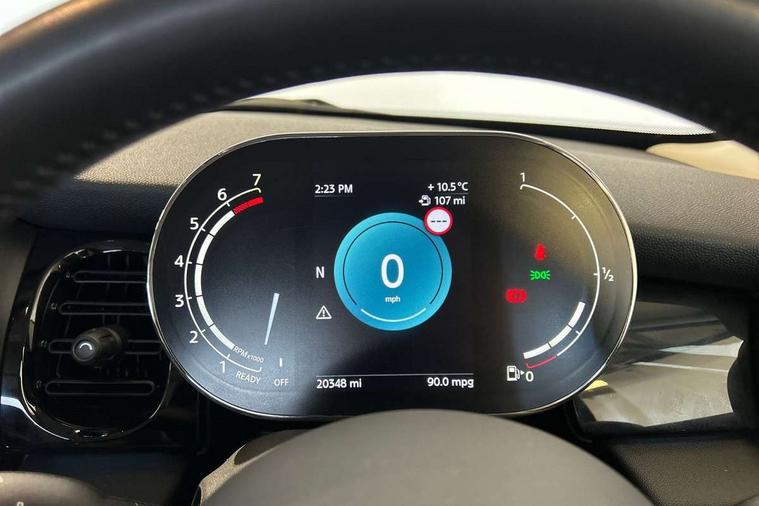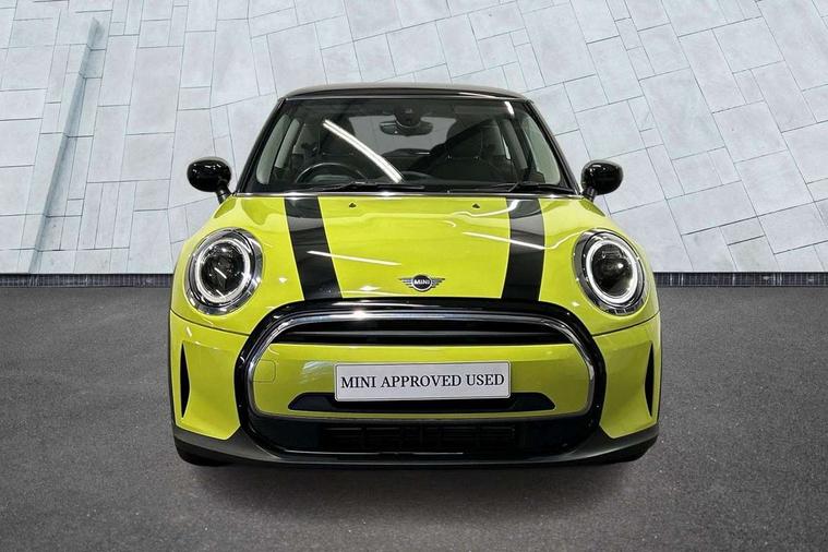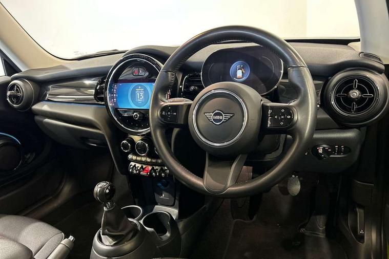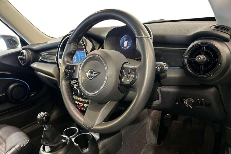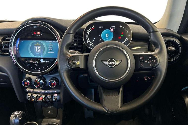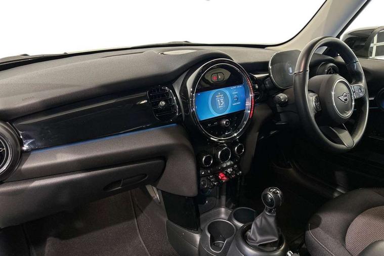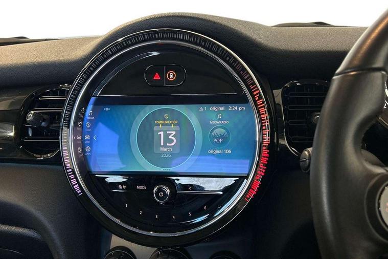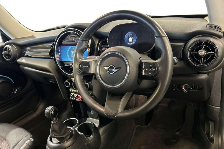 Apple CarPlay, Automatic start/stop function with brake energy recuperation, Compatible mobile phone bluetooth with audio streaming, Digital dashboard display, Electro-mechanical speed dependant steering assistance, Flexible car sharing preparation, Instrument cluster, Mini E-call, MINI TeleServices, On board computer, Service interval indicator, Double Vanos system, Fully variable valve control, High precision injection, Performance Control, 4 speakers in front door trims and underneath front seats, 8.8" touchscreen with LED ring, FM tuner and DAB digital radio, 3rd brake light, Automatic headlight activation switch, Body colour fuel filler cap, Chrome border high gloss black slats radiator grille, Dynamic brake lights, Electric front windows, Exhaust tailpipe on left with chrome finisher, Heated rear window, Heated windscreen washer jets, LED headlight with closed ring and daytime driving lights, Metal door sill strips with MINI imprint, Model logo Cooper on right of tailgate, Rain sensor window wipers, Rear fog lights, Rear LED lights with union jack design, Rear window wiper, Side scuttle panel with integrated indicator, Sun/heat protection glass, White indicator lenses, 12V Accessory socket in centre console, 2 seat bench in 2nd row, 4 lashing eyes in luggage compartment, 60/40 split folding rear seat, Ambient lighting, Chrome interior highlights, Cupholders, Front and rear head restraints, Front and rear isofix with front passenger airbag deactivation, Front floor mats in velour, Glove compartment, Height and length steering column adjustment, Interior lighting with 12 different colours across the dashboard, underneath door bezel with illuminated laser-engraved design on central display, Leatherette gearshift lever and handbrake gaiters, LED reading lights, vanity mirror lights, front foot well light and spotlight on front seats, Mechanical seat adjustment - forward/back & backrest for front seats and driver seat height adjust, Multifunction steering wheel, Passenger seat height adjuster, Satellite grey headlining including grab handles and clothes hooks, Single front passenger seat, Sport leather steering wheel with speed limiter and audio/communication controls, Storage compartments in doors, Sunvisors with vanity mirrors, Driving assistant pack - Mini Hatchback, Premium pack - Hatchback, 3 point seatbelts on all four seats, 6 Airbags - front, side, head and seat belt tensioners, Anti-lock braking system (ABS), DSC - Dynamic Stability Control, Front and rear disc brakes, Single tone fanfare horn, Tyre pressure monitoring system, Alarm system with tilt sensor, monitoring doors, bonnet interior and tailgate, Electronic vehicle immobiliser, Start/stop toggle with keyless go, Piano black interior trim, Tool kit, Tyre repair kit,