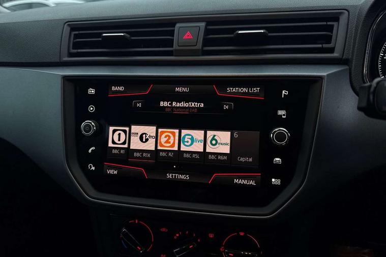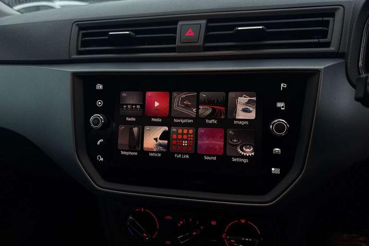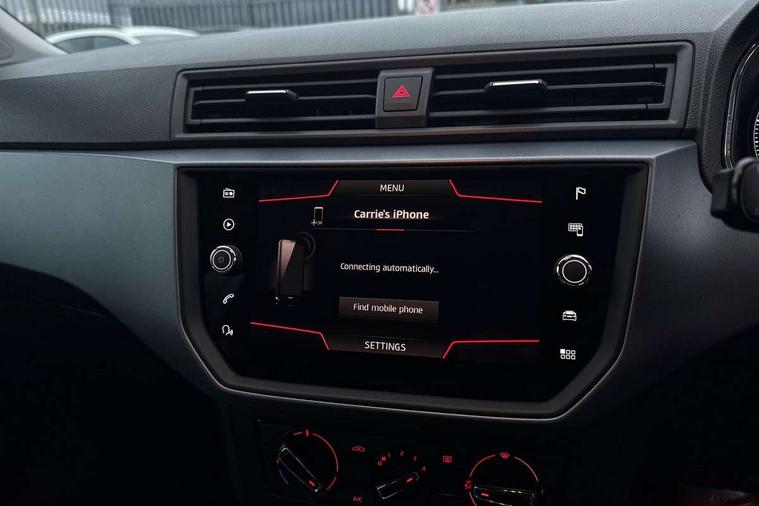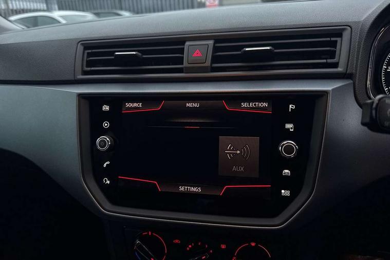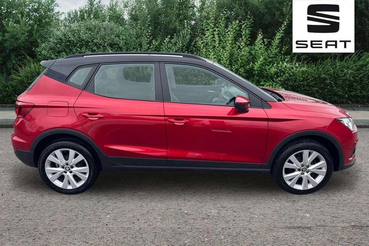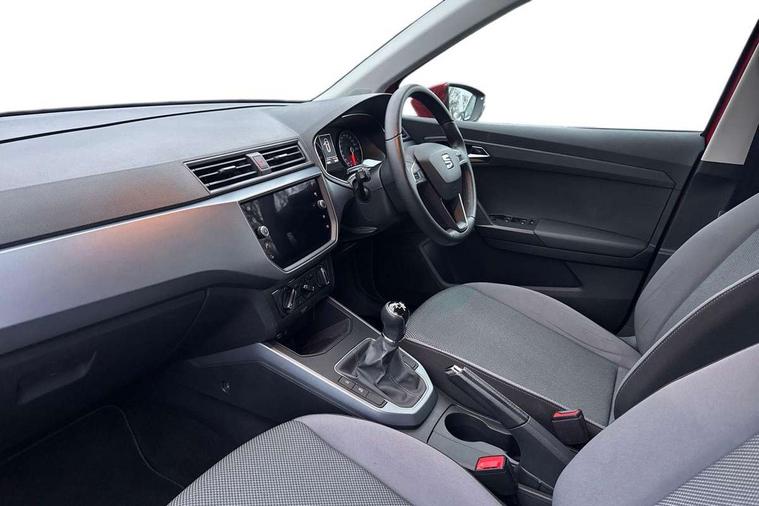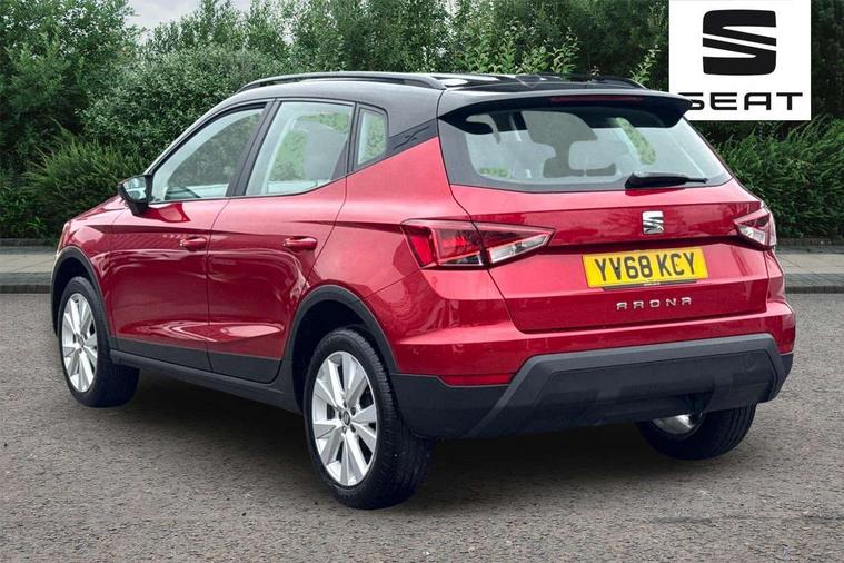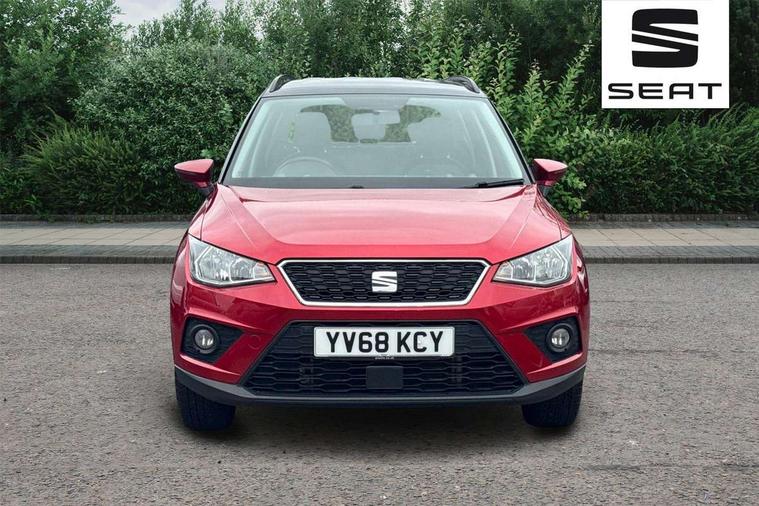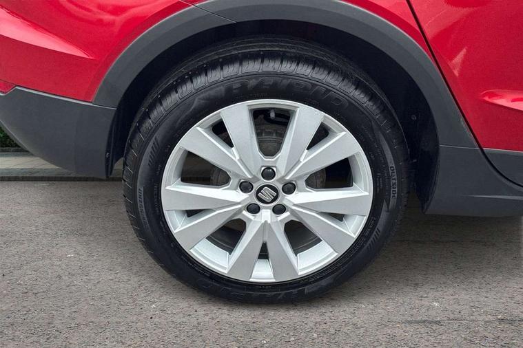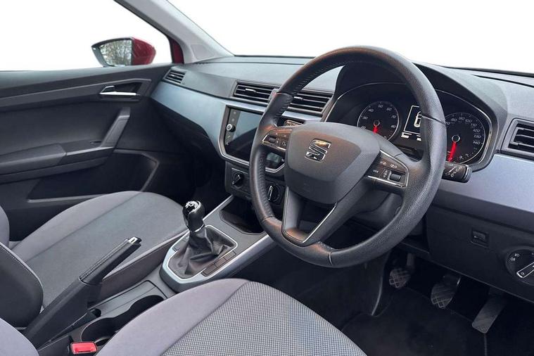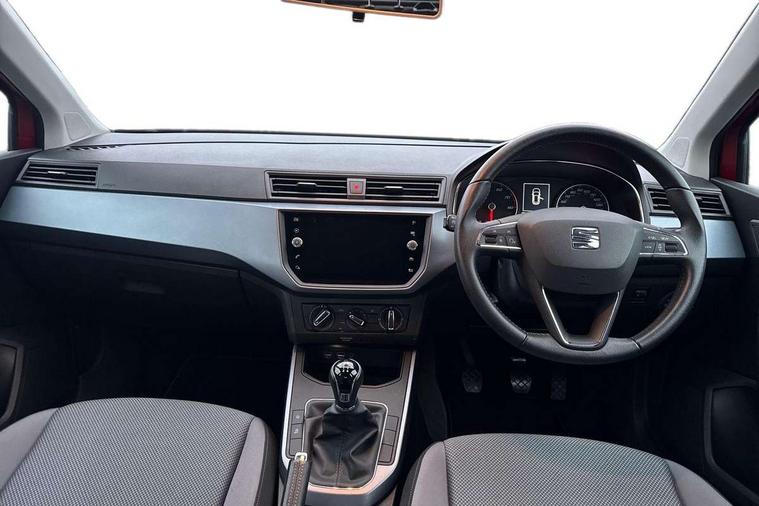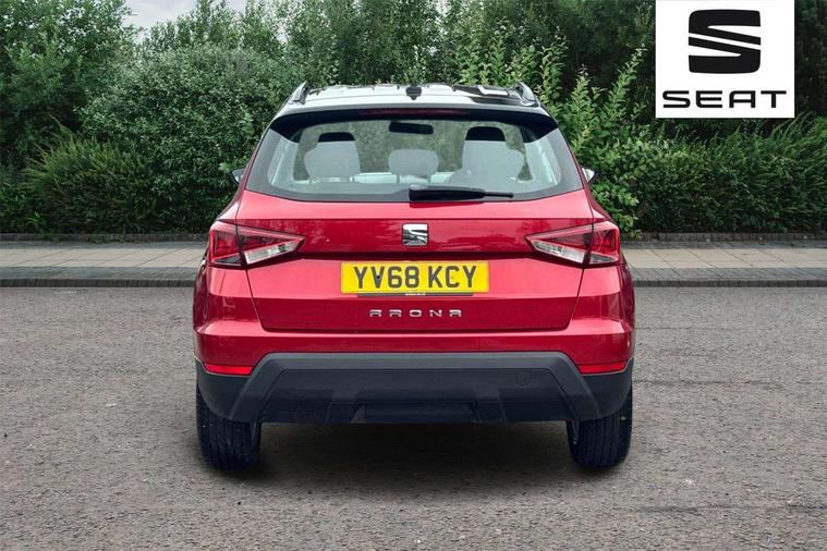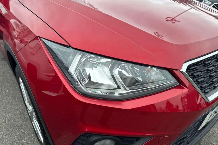 'Lights On' Reminder warning buzzer, Cruise control, Digital clock, Electric speed sensitive power steering, Front assistant collision mitigation, Full Link Smartphone Integration with Mirror Link, Apple Car Play, Google Android Auto, Low fuel warning light, Outside temperature display, Rear parking sensor, RPM counter, Trip computer, Comfort suspension, 6 speakers, Bluetooth interface for hands free and audio streaming, DAB Digital radio, SEAT USB media cable, Steering wheel mounted audio controls, Anti theft roof antenna, Automatic activation of hazard warning lights, Automatic headlights, Black roof rails, Black window surrounds, Body coloured bumpers, Body coloured door handle inserts, Chrome grille surround, Electric adjustable door mirrors, Electric front/rear windows with one touch/auto up/down, Electric headlight adjustment, Front fog lights with static cornering function, Halogen headlights, Hidden exhaust pipe, LED daytime running lights, LED licence plate lighting, LED tail lights, Rear fog lights, Rear window wash/wipe, Visible VIN plate, Windshield wiper with intermittent control and potentiometer, 2 cupholders, 3 rear height adjustable headrests, 60/40 split folding rear seat, Active head restraints, Air conditioning, Ambient interior lighting, Card holder, Cloth upholstery, Double boot floor, Driver and passenger sunvisors, Driver/front passenger seat height adjustment, Dust/pollen filter, Footwell ambient lighting, Front courtesy lights, Front reading light, Gear shift indicator, Height/reach adjustable steering column, Illuminated boot, Instrument lighting with brightness control, Isofix attachments on rear seats, Leather handbrake, Leather steering wheel and gear knob, Connectivity pack plus - Arona, 3 point seatbelts on all rear seats, ABS+EBA, Child locks on rear doors, Driver/Front Passenger airbags, Electronic stability control, Front and rear seatbelt reminder, Front side/curtain airbags, Height adjustable active front headrests, Hill hold control + Tyre Pressure monitor, Multi-Collision braking, Passenger airbag deactivate switch, Tiredness recognition system, Traction control, 2 folding remote keys with window open/close function, Immobiliser, Locking wheel bolts, Remote central locking + deadlocks, Interior chrome line trim, 17" Dynamic alloy wheels,