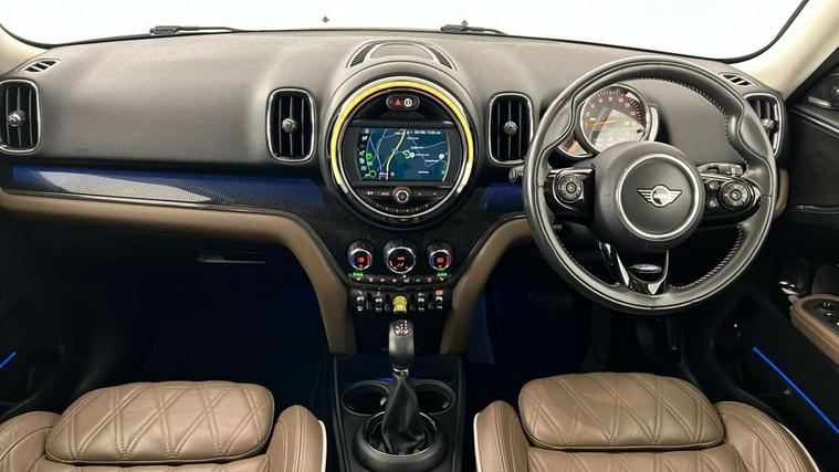 Active Guard incl speed limiting and lane departure functions with auto steering, and front collision warning with brake intervention, Automatic start/stop function with brake energy recuperation, eDrive button, Electro-mechanical speed dependant steering assistance, Instrument cluster, Mini E-call, MINI TeleServices, On board computer, Rear parking distance control, Automatic transmission, Charging flap on front left lower A-panel, Double Vanos system, Fully variable valve control, High precision injection, Performance Control, FM tuner and DAB digital radio, Bonnet scoop, Chrome border honeycomb structure radiator grille with S badge, Chrome fuel filler cap, Chrome line exterior, Day time driving lights, Dynamic brake lights, Electric windows, Heated rear window, Heated windscreen washer jets, Metal door sill strips with Cooper S imprint, Model logo, Model logo on Tailgate, Rain sensor with auto headlights, Rear fog lights, Rear window wiper, Side scuttle panel with integrated indicator, Split rear doors, Sun/heat protection glass, Twin exhaust tailpipe, White indicator lenses, 12V Accessory socket in centre console, 360L luggage compartment capacity, 4 lashing eyes in luggage compartment, 40:20:40 split folding rear seats, Charging cable, Chrome interior highlights, Cupholders, English handbook, Front headrests, Glove compartment, Height and length steering column adjustment, Isofix rear child seat preparation, Leather gearshift lever and handbrake gaiters, LED reading lights, vanity mirror lights, front foot well light and spotlight on front seats, Manual air conditioning, Mechanical seat adjustment, driver seat height adjust, forward/back and front seats backrest, MINI Yours fine walk nappa leather steering wheel with contrast stitching in silver and MINI Yours badge, Multifunction steering wheel, Passenger seat height adjuster, Rear headrests, Storage compartments in doors, Sunvisors with vanity mirrors, Excitement pack - Countryman, Navigation pack - Countryman, 2 tone horn, 3 point seatbelts on all seats, 6 Airbags - front, side, head and seat belt tensioners, Anti-lock braking system (ABS), DSC - Dynamic Stability Control, Electronic handbrake, Front and rear disc brakes, Hill start assist, Tyre pressure monitoring system, Alarm system with tilt sensor, monitoring doors, bonnet interior and tailgate, Auto drive away locking, Deadlocking function, Electronic vehicle immobiliser, Locking wheel bolts, Start/stop toggle with keyless go, Chrome line interior, Tool kit,