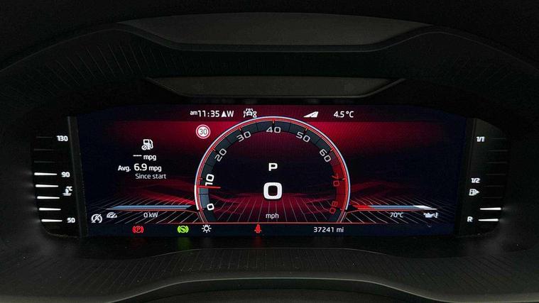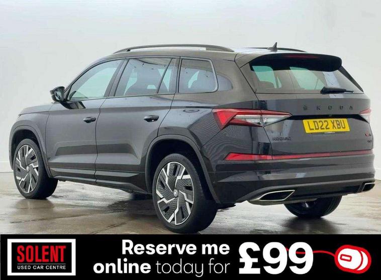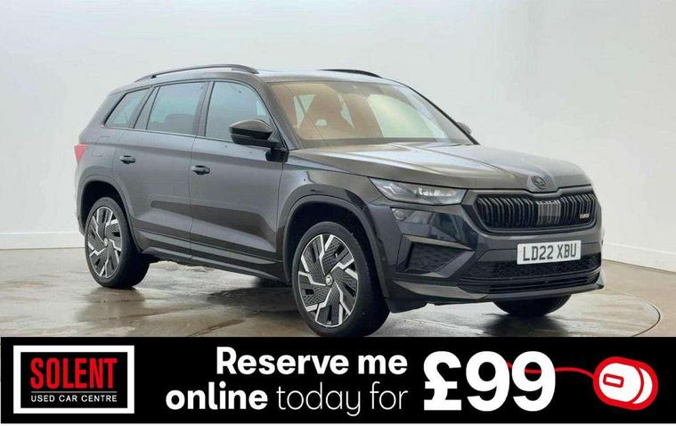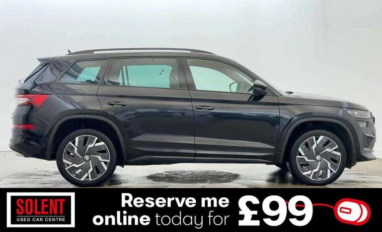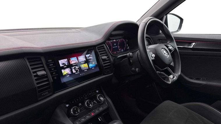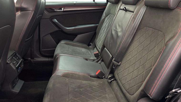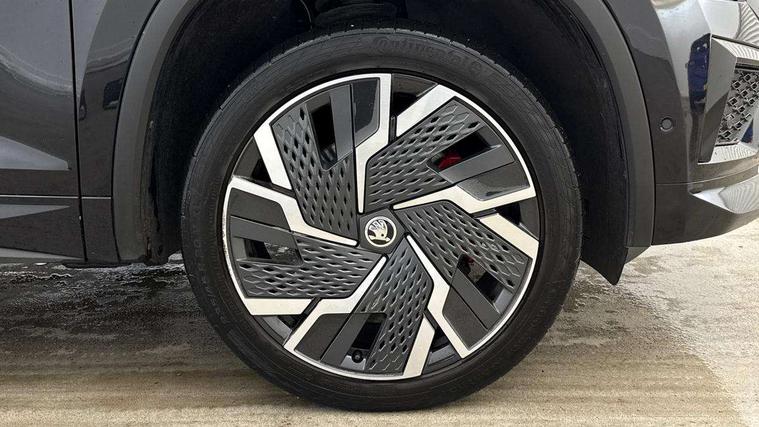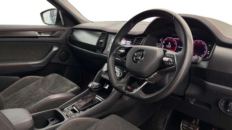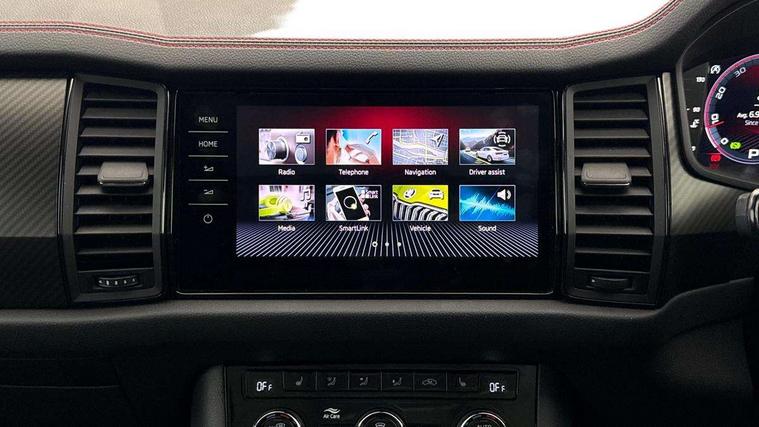 Bluetooth system, Columbus satellite navigation with 9.2" touchscreen, integrated Wi-Fi, web radio, Digital voice enhancement, E-call, ECO Stop/start function, Exterior temperature indicator, Progressive steering, Rear view camera, Smartlink wireless for apple carplay and wired for android auto, Speed limiter, Tailgate unlocking from outside, USB C Port x 2 in front centre console, Virtual Cockpit - 10.25" digital display, Wireless charging, Dynamic Chassis Control including off-road function, 8 Speakers, DAB Digital radio, Dynamic sound booster, Aero front windscreen wipers with intermittent function, Aero rear window wiper, Auto dimming rear view mirror, Black wheel arch surrounds, Body colour bumpers, Body colour door handles, Chrome exhaust tailpipe, Electric adjustable/heated/folding door mirrors, driver side auto dimming with boarding sports and memory function, Electric front and rear windows, Extended rear spoiler with finlets in gloss black, Front fog lights, Full LED matrix headlights with AFS (adaptive front light system), cornering function and AWL (all weather lighting system), Gloss black door mirrors, Gloss black roof rails, Heated rear window, LED daytime running lights, LED rear fog light, LED third brake light in rear spoiler, Light assistant (coming/leaving home/tunnel light), Off-road style lower front bumper element, Privacy glass, Rain and light sensors, Rear diffuser, Rear LED lights (high functionality) with welcome effect and dynamic indicators, Rear side wing doors, Safety reflectors on front and rear doors, vRS exterior design - vRS front and rear bumpers with vRS badging (gloss black on tailgate and chrome on radiator grille) + black window surround, Window control switches with black trim, Without engine designation, 12V socket in boot, 2 rails with 2 hooks, 2 seat bench in 3rd row, 3 seat bench in 2nd row, 4 foldable roof handles with rear coat hooks, 60:40 foldable rear seat with sliding adjustment and backrest angle adjustment, Aluminium pedals, Black roof headlining, Bottle holders in door panel in the 1.5 litre front and 1 litre rear, Cargo storage compartments, Chrome headlight control button, Chrome interior door handles, Coat hooks on B pillar, Covered storage compartment on driver side, Front centre armrest with storage compartment, cup holder and 12V socket, Front courtesy lights, Gear shift lever with chrome frame and black gloss insert with vRS logo, Height adjustable front headrests, Illuminated and cooled glovebox, Illuminated luggage compartment, Isofix child seat fittings in outer rear seats with top tether, Manually adjustable steering column, Microsuede door panels with vRS black stitching, Net programme in boot (1x horizontal Net, 2x vertical Nets), Overhead glasses storage compartment, Pollen filter, Rear centre armrest with cupholders, Single front passenger seat, Sliding trunk cover, Small Bags on the inner sides of the front backrests, Sports seats, Sunvisors with illuminated vanity mirrors, Three rear height adjustable headrests, Ticket holder on A Pillar, Umbrella in door panel, Variable boot floor, vRS red stitching in front and rear armrests and door panel armrests, LED Interior light pack - Kodiaq, Auto door release and activation of warning lights in the event of an accident, Child locks on rear doors, Driver and front passenger airbag with knee airbag and front passenger airbag deactivation, Electronic parking brake with hill start assist, Emergency rear braking signal, ESC (incl. ABS+MSR+ASR+EDS+HBA+DSR+RBS+MKB), Front assist with autonomous emergency braking, Front side airbags with curtain airbags, Fuel cut off safety device, Height adjustable front 3 point seatbelts + pretensioners, Hill hold control, Rear disc brakes, Red brake calipers, Safety vest holder in door, Seat belt reminder for all seats, Three point rear seat belts, Two tone horn, Tyre pressure monitor, Alarm with interior monitoring and tilt sensor with safe function, Anti-theft wheel bolts, Immobiliser, Keyless entry and start system (KESSY), Remote central locking with 2 keys, Black air vent surround, Carbon finish dashboard and door inserts, Red stitching in dashboard, 20" Sagitarius anthracite alloy wheels with aero covers, Temporary spare wheel (space saver),