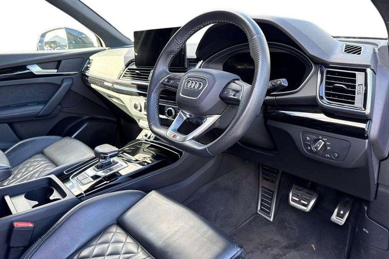 Audi connect safety and service (e-call), Audi connect with Amazon Alexa Integration, Audi drive select, Audi virtual cockpit plus with 12.3" screen and three different layout designs, Audi wireless smartphone interface, Automatic start-stop system with coasting functionality and efficiency programme, Bluetooth interface, Electro - mechanical power assisted steering, MMI navigation plus with 10.1" touch screen, Power tailgate, Reversing camera, Service interval indicator, Voice control system with Audi hotword activation "Hey Audi", Quattro on demand, S line sports suspension, 2 x USB charging port with aux input socket, DAB Digital radio, Acoustic windscreen, Audi beam with Audi rings logo, Audi matrix LED headlights with dynamic front and rear indicators, Audi rings at front and rear in black, Audi rings decal on rear doors, Auto dimming door mirrors, Auto dimming rear view mirror, Automatic headlights and windscreen wipers, Black door mirrors, Black roof rails, Body colour bumpers, Body colour underbody protection, Chrome plated exhaust trims, Daytime running lights, Door sills in Selenite silver, Electric adjustable/heated/folding door mirrors, Front air inlet surrounds in titanium black, Front and rear electric windows, Headlight washers, High gloss black B pillar trims and triangular rear door trim, High level LED brake light, Rear chrome trim strip below lights, Rear privacy glass and rear side windows, Rear side wing doors, Rear spoiler, Rear wiper, Roof bars, Without model and engine badging at rear, 3 rear headrests, 4 way electric lumbar support for driver and front passenger, 40:20:40 split folding 3 rear bench seat in 2nd row with rear centre armrest, Black cloth headlining, Comfort front centre armrest, Contrast stitching on seats, steering wheel and gear lever gaiter, Deluxe 3 zone electronic climate control, Electrically adjustable front seats, Fine Nappa leather upholstery with diamond pattern contrast stitching + front sport seats with S embossed logo, Front/rear floor mats, Gear lever in black leather, Heated front seats, Height adjustable front head restraints, Height/reach adjustable steering column, Illuminated door sill trims with S logo, ISOFIX child seat mounting and top tether, Luggage compartment cover, Rear seat bench plus, Removable luggage compartment floor, Single front passenger seat, Stainless steel pedals, Sunvisors with vanity mirrors, Black styling package - Q5 Edition 1, Extended interior upholstery pack - Q5, Extended LED Interior multi coloured Lighting Pack - Q5, 3 point seatbelts on all seats, 6 airbags - Driver, front passenger, curtain and side airbags, Electrically operated child locks on rear doors, Electromechanical parking brake, Electronic stabilisation control including ABS, ASR and EDL, Front and rear brake calipers painted in red, Front passenger airbag deactivation, Hill descent control, Hill hold assist, Multi collision brake assist, Pop-up bonnet for pedestrian protection, Pre sense city, Seat belt force limiter, Seatbelt monitoring, Tyre pressure warning, Warning triangle and first aid kit, Anti theft alarm, Anti-theft wheel bolts, Keyless Go access/ignition system, Remote central locking, Piano black finish inlay,