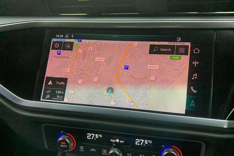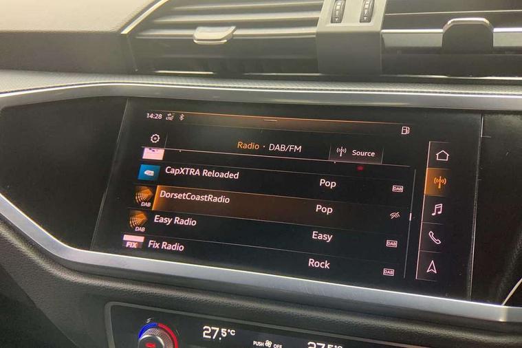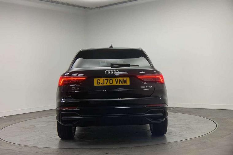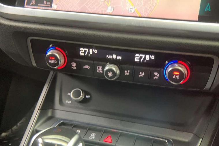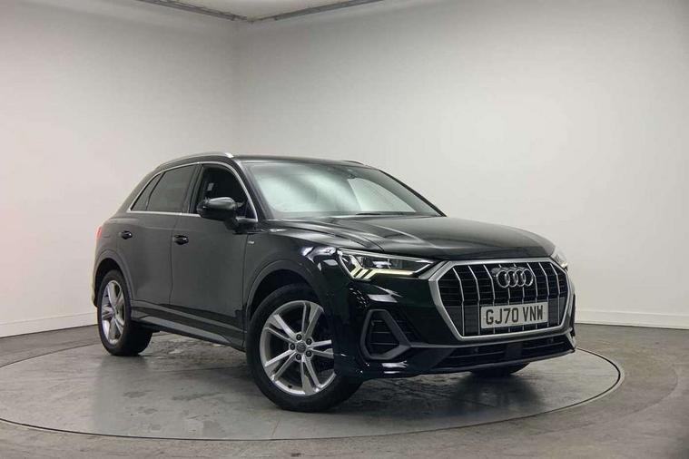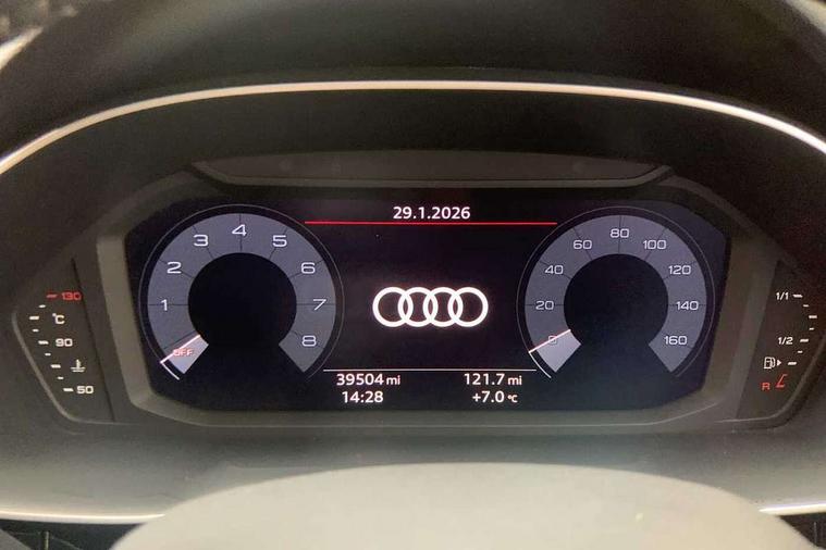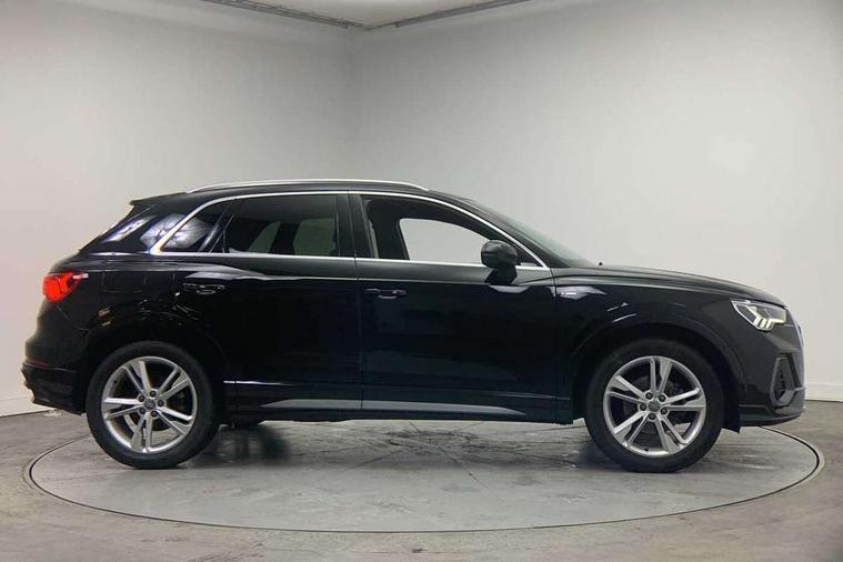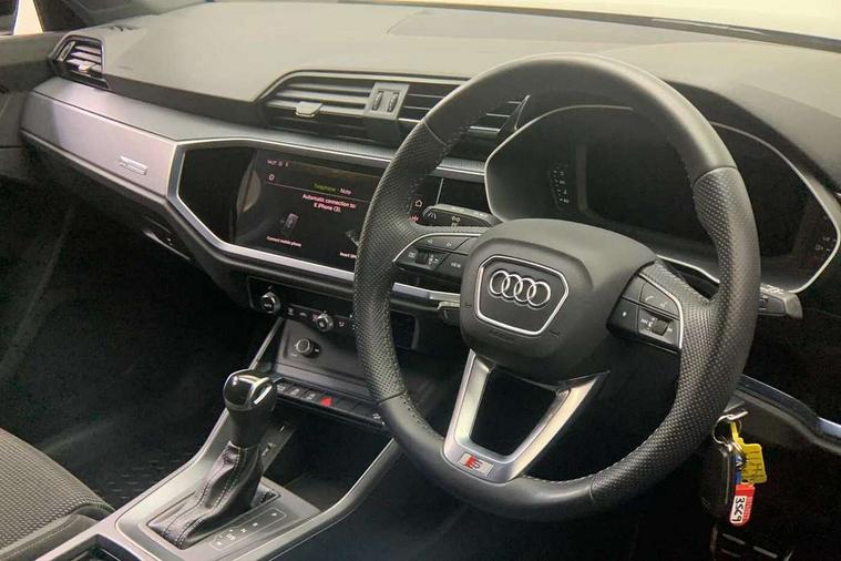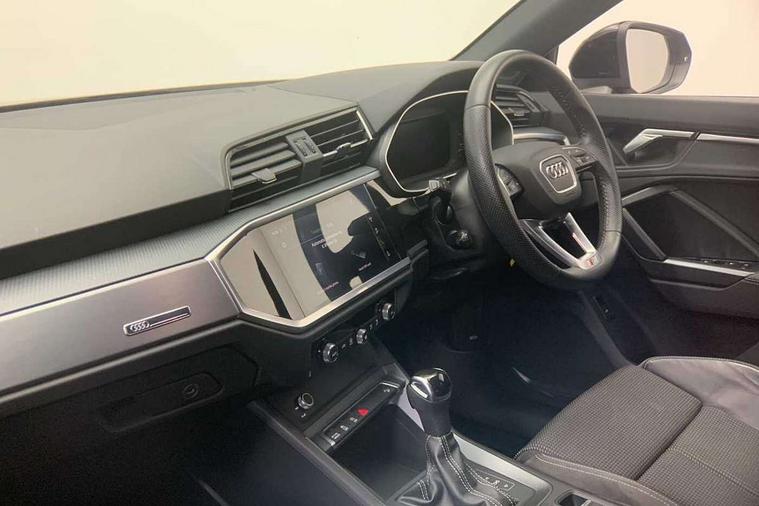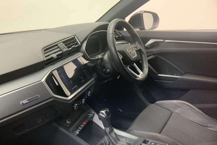 Audi connect safety and service (e-call), Audi drive select, Audi lane departure warning, Audi side assist, Audi Virtual Cockpit - 10.25" display, Bluetooth interface, Camera based traffic sign recognition, MMI Navigation Plus with high resolution 10.1 inch touchscreen colour display, Power operated tailgate, Progressive steering, Service interval indicator, Smartphone interface includes wireless Apple carplay/Android Auto, Start stop system with recuperation, Voice control system with natural language interaction, 48V Mild hybrid technology, Sports suspension, 1 x USB type C and 1 USB type A charging points, 6 passive loudspeakers, DAB digital radio module, Acoustic windscreen, Aluminium roof rails, Aluminium window trim, Auto dimming frameless rear view mirror, Body coloured bumpers, Electrically folding, adjustable and heated door mirrors with integrated LED side indicators and kerb view function for passenger side, Front and rear electric windows, Front fog lights, Front side air inlets in matt platinum grey, Front spoiler blade in matt platinum grey, Grille vertical bars in aluminium silver/Matt, High gloss black finish B and C pillars, LED headlights with LED daytime running lights and dynamic rear indicator, LED rear lights, Privacy glass dark tinted rear and rear-side windows (from B-pillar backwards), Rain and light sensors, Rear diffuser strip in matt titanium black, S line badges on front wings, S Line front and rear bumpers, Side skirt insert in matt Platinium grey, Silver chrome grille surround, Titanium black radiator grille, 12V socket in rear centre console, 40:20:40 folding with manual adjustment for 60:40 forwards/backwards position and backrest angle, Adjustable rear seat bench/backrest with centre armrest and cupholder, Black cloth headlining, Dual zone electronic climate control, Front and rear black floor mats with contrast stitching in rock grey, Front and rear headrests, Front and rear roof module including reading lights, Front centre armrest, Glove compartment lighting, Height and reach adjustable steering wheel, Illuminated door sill trims with S logo, ISOFIX child seat mounting for front passenger with airbag deactivation and outer rear seat including top tether attachment point for outer rear seats, Luggage compartment light, Manual front seats with height adjustment, Perforated leather gearknob, Stainless steel luggage compartment sill finisher, Stainless steel pedals, Non smoking pack - Q3, 3x3 point rear seatbelts, 6 airbags - Driver, front passenger, curtain and side windows, Audi pre-sense front with pedestrain and cyclist recognition, Electrically operated child locks on rear doors, Electromechanical parking brake, Electronic stabilisation control including ABS, ASR and EDL, Hill descent control, Hill hold assist, Pre sense basic, Seatbelt monitoring, Tyre pressure warning, Warning triangle and first aid kit, Anti theft alarm, Anti theft wheel bolts, Remote central locking, Dark matt brushed aluminium inlay, Detail dashboard around MMI touch colour display in glass look, black with surround in aluminium look, Leatherette door armrest, Tool kit, Tyre repair kit,