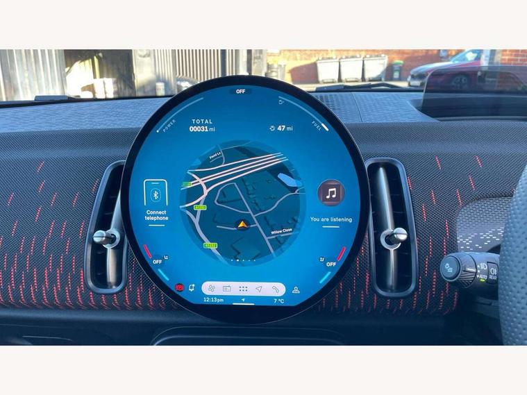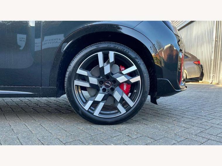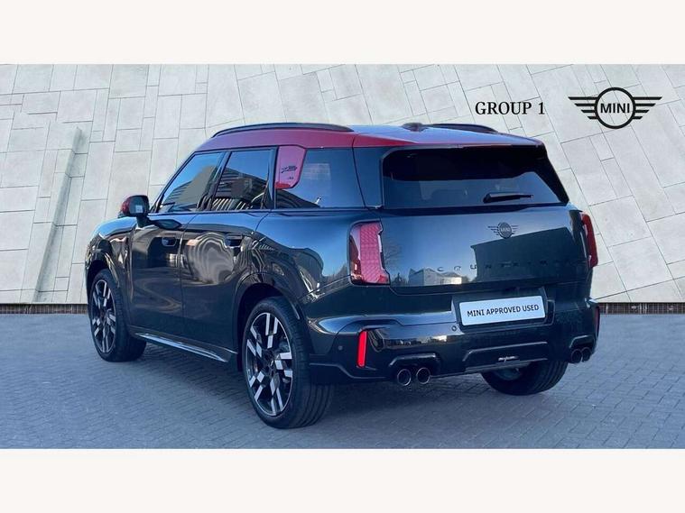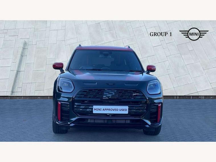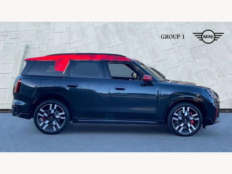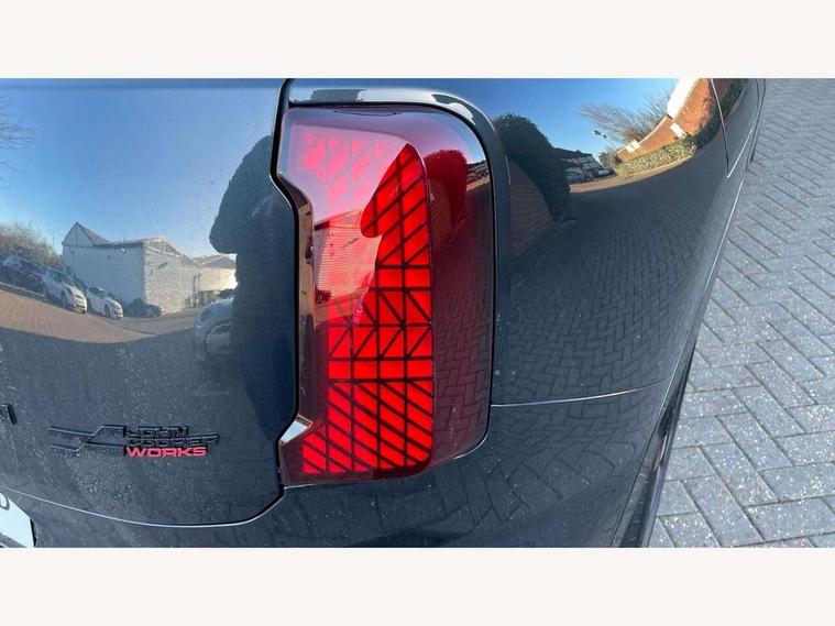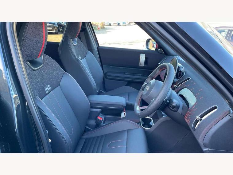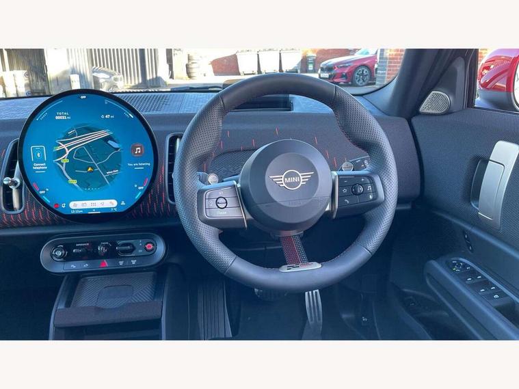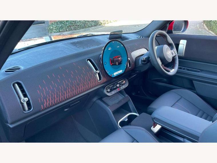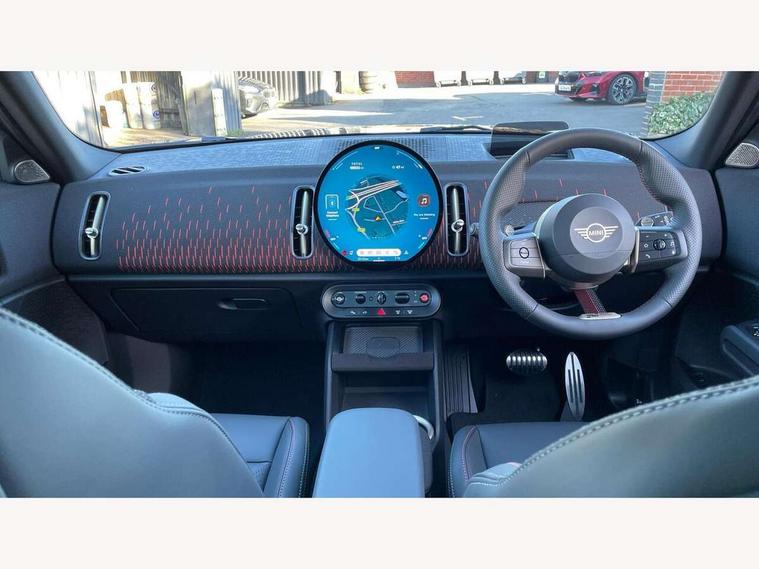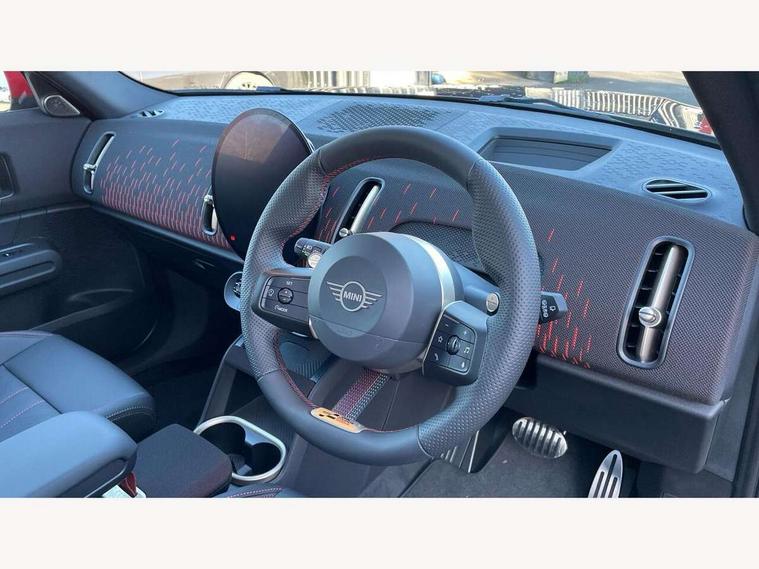 Bluetooth connection, Circular OLED Screen, Compatible mobile phone bluetooth with audio streaming, Cruise Control (DCC), Digital dashboard display, Driving assistant, Driving Assistant Plus Preparation, E-call, Electro-mechanical speed dependant steering assistance, MINI Experience Modes, MINI Head up display, Mini navigation system, MINI TeleServices, Parking assistant in camera and ultrasound based assistance system, rear view camera, parking aid and distance control, Adaptive suspension, Double clutch sports transmission, Larger capacity fuel tank, Quad exhaust system, DAB Digital radio, Harman Kardon surround sound system, Personal eSim, Auto tailgate, Electric adjustable heated door mirrors, Front and rear apron, Front and rear electric windows, Heated rear window, High beam assistant, High gloss hexagonal patterned grille surround, Interior rear-view mirror with automatic anti-dazzle function, LED daytime running lights, LED headlights with extended contents including Adaptable light signatures, LED rear lights, LED third brake light, Rain sensor with auto headlights, Rear roof spoiler with airblades, Rear side wing doors, Rear window wiper, Roof rails, 3 seat bench in 2nd row, 60/40 split rear bench seat, Anthracite headliner, Auto air conditioning, Driver and front passenger seat heating, Floor mats, Front armrest, Front headrests, Heated steering wheel, Height and length steering column adjustment, JCW Front sports seats, Lidded storage box in Black/Red knit, Luggage compartment separating net, Perforated Vescin steering wheel, Rear headrests, Seat adjustment for rear seats, Single front passenger seat, Sunvisors with vanity mirrors, Wireless charging tray, Interior and exterior mirror package - Mini Countryman, 3x3 point rear seat belts, 6 Airbags - front, side, head and seat belt tensioners, ABS, DSC - Dynamic Stability Control, Electronic handbrake, Electronic Stability Programme (ESP), Front ISOFIX (iSize), Hill descent control, Hill hold assist, Hill start assist, JCW logo in brake calipers, JCW Sport brakes with Chilli Red calipers, Manual rear child locks, Traction control, Tyre pressure monitoring system, Warning triangle, Alarm system with tilt sensor, monitoring doors, bonnet interior and tailgate, Auto drive away locking, Comfort access system, Deadlocking function, Electronic vehicle immobiliser, Locking wheel bolts, Remote control locking, Start/stop toggle with keyless go, 19" JCW Runway Spoke Black alloy wheels, Tyre repair kit plus,