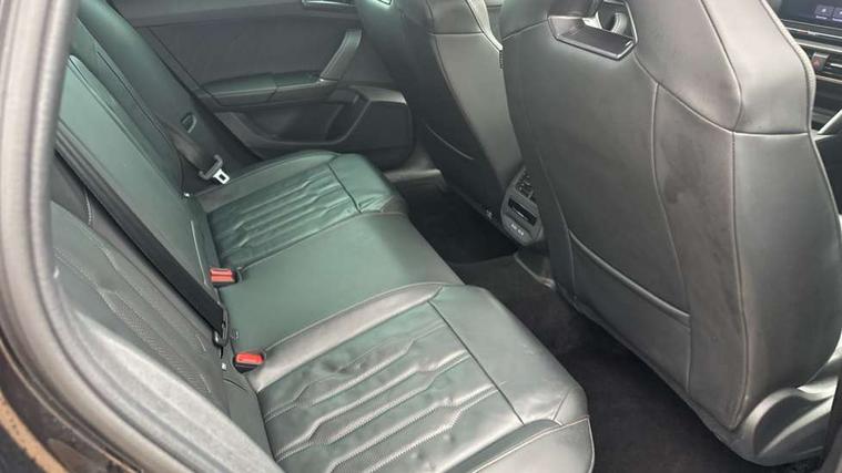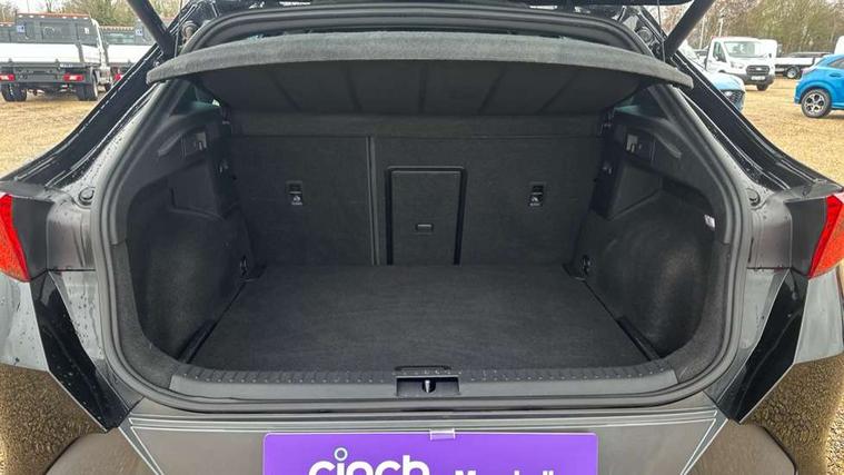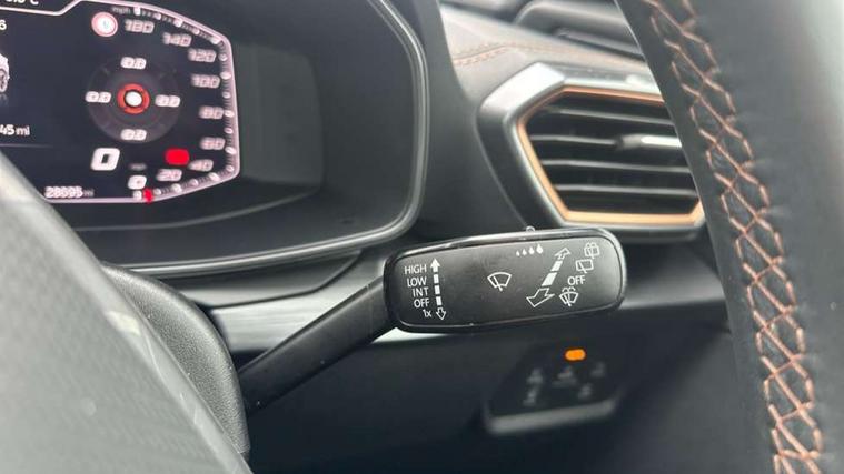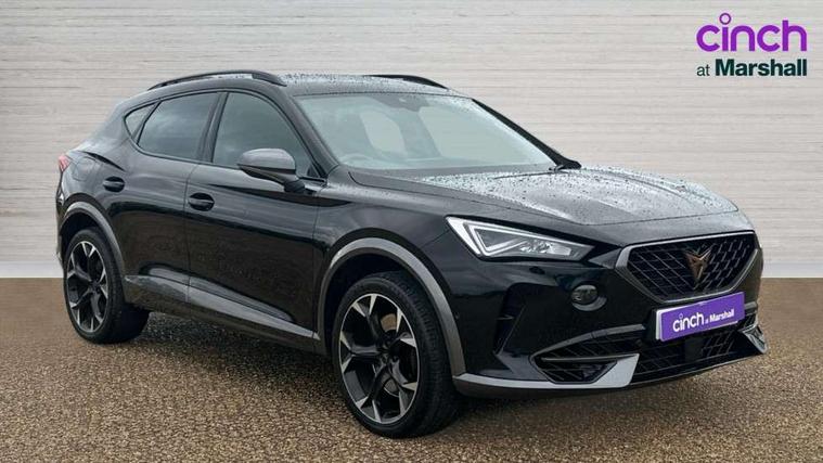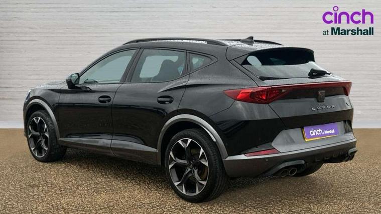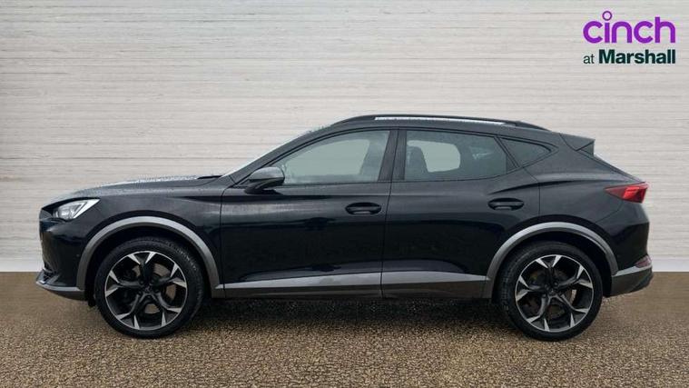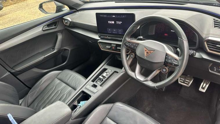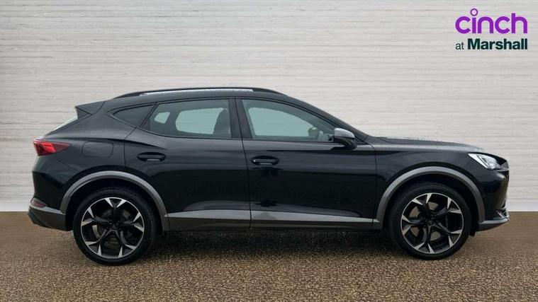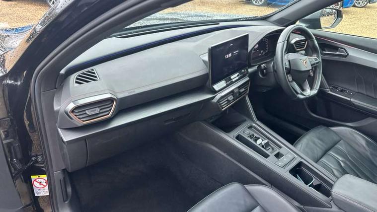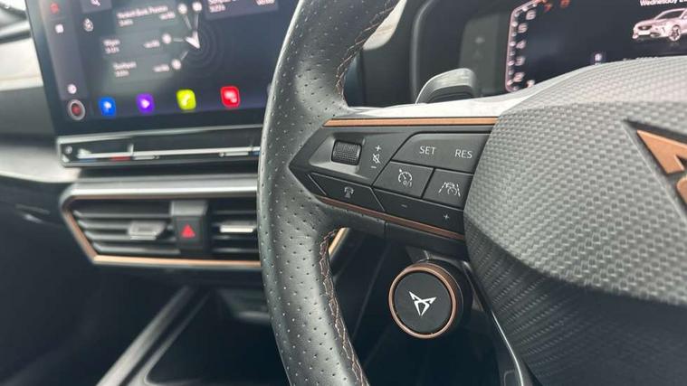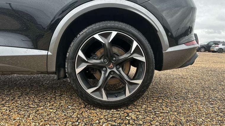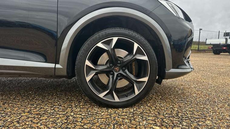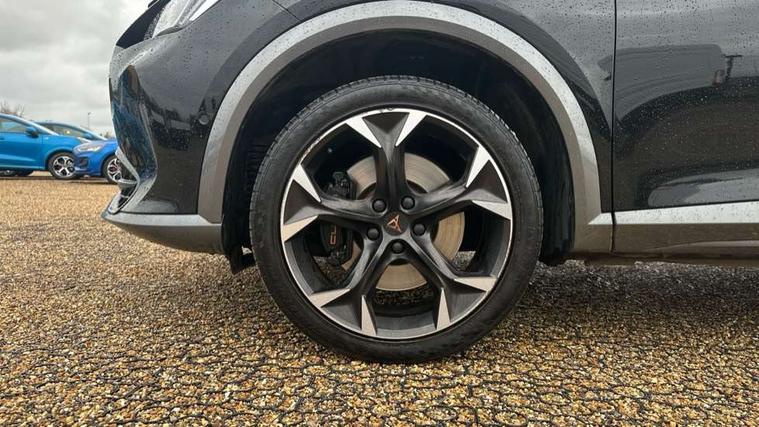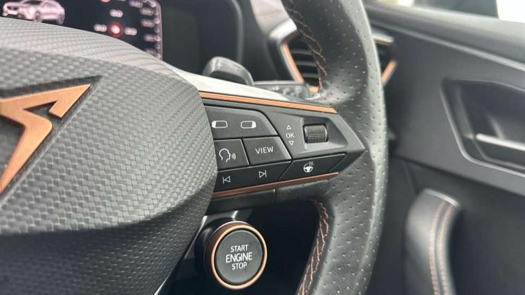 Digital cockpit and configurable dashboard, Driver alert system, Dynamic chassis control with driving profile selection (Comfort, Sport, CUPRA, Individual), Forward collision warning with automatic braking, Lane assist, Navigation system with 12'' Touchscreen Display, Park assist (inc front/rear parking sensors), Predictive adaptive cruise control with speed limiter, Rear view camera, RPM, trip computer, outside temp gauge, instrument light brightness, low fuel warning light, lights on reminder, gearshift indicator, Service interval indicator, Speed sensitive power steering, Start/stop system with regenerative braking, Virtual pedal and electric tailgate, Voice control system, Wireless apple carplay, Wireless phone charger, Electronic locking differential and dynamic traction support, Sports suspension with front shock absoption, 2 front and 2 rear USB type C sockets, Auxiliary input socket, DAB radio, Auto dimming rear view mirror, Body colour door handles, Body coloured bumpers, Dark grey wing mirror, Daytime running light with automatic headlight control and coming home feature, Dynamic headlight range control, Electric front/rear windows, Electrically adjustable heated and folding door mirrors with memory function, Front fog lamps with cornering function, Gloss black roof rails and window surrounds, LED Headlights, LED Taillights with dynamic indicator, Rain sensing wipers, Rear diffuser with twin exhaust pipe on each side, Rear side wing doors, Rear wash/wipe, Sports bumpers, Third brake light, Tinted rear windows, VZ logo rear badging, Welcome lights, 12v power supply in centre console, 12V socket, 12v socket in loadspace, 2 front and 2 rear reading lights, 230V socket, 3 seat bench in 2nd row, 60/40 split rear bench seat with armrest and mechanical seat release, Black headlining, Cupra sports pedals, Dust/pollen filter, Front and rear head restraints, Front centre armrest, Height/reach adjust steering wheel, Illuminated interior front door sills, Illuminated sunvisor with mirror, Isofix, Leather heated multi-function sports steering wheel with start stop, CUPRA mode button and gear shift paddles, Luggage tie-down hooks, Single front passenger seat, Three zone climate control with control panel in rear, Variable luggage/load compartment floor, Wraparound lighting, Genuine Nappa leather Pack - Cupra, Safety and driving pack (XL) - Formentor, 3 point seatbelts on all rear seats, ABS, Brake control system - ESC and brake booster, Child proof door locks, Driver and front passenger airbags with front passenger airbag de-activation, Electronic parking brake, Front and rear disc brakes, Front side curtain airbags, Hill hold control, Public e-call, Seat belt reminder for front and rear seats, Tyre pressure monitoring system, Anti theft alarm system, Keyless entry and start system (KESSY), Locking wheel bolts, Copper and aluminium interior detailing, 19" 'Exclusive' machined sport matte black and silver alloy wheels, Space saver spare wheel,