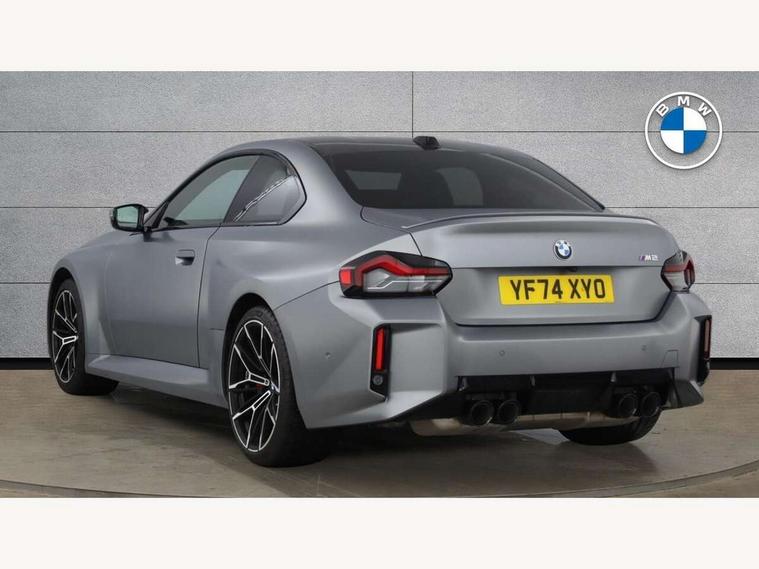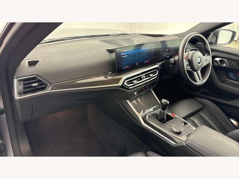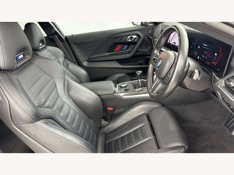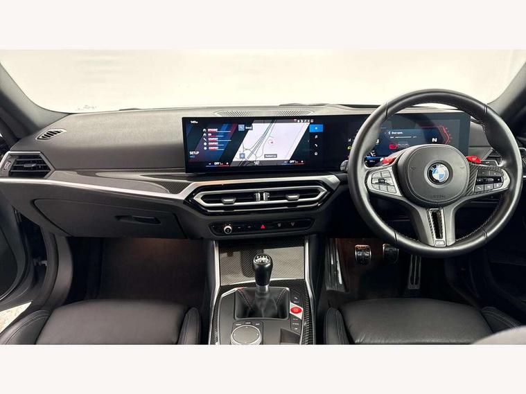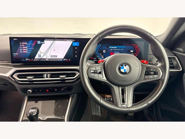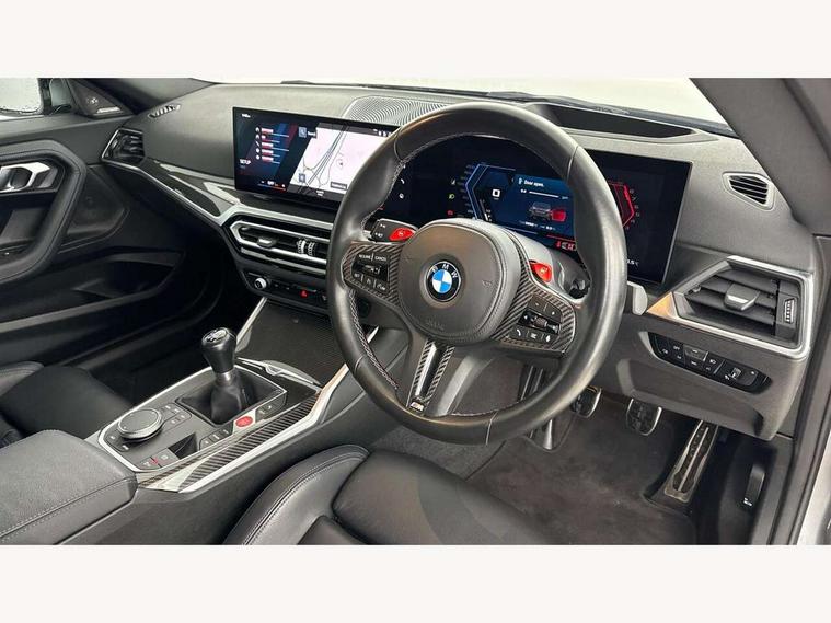 BMW ConnectedDrive online services, BMW legal emergency call, BMW Teleservices, Check control system, Configurable dashboard display, Cruise control with braking function, Digital owner's manual, Drive off assistant, Driver attention warning, Engine start button, Exterior temperature display, Live Cockpit Pro with head up display including 12.3" instrument cluster and 14.9" central display, M drive: DSC mode, engine characteristics, M Servotronic, M Drivelogic, adaptive M suspension, brake characteristics, M Sound Control, Oil sensor for level and grade, On board diagnostics, Parking assistant with reversing assistant, active PDC, lateral parking aid and rear view camera, PAS, Service interval indicator, Speed limiter, Start/stop system, Travel data recorder, Trip computer, Voice control for audio, climate, telephone, navigation, Widescreen display, M Adaptive suspension, M Drive Professional including track mode, laptimer, traction control & Drift analyser, M Sport differential, DAB tuner, Harman/Kardon surround sound system, USB port, Adaptive LED Headlights, Automatic headlamp activation, Automatic headlamp levelling, BMW Individual shadowline lights, Door mirror integrated indicators, Dynamic brake lights, Electric adjustable heated door mirrors, Extended High-gloss shadowline exterior trim: high-gloss black mirror caps and rear spoiler, tailpipe finishers in black chrome, Fading support, Follow me home headlights, Front and rear bumper system, Front electric windows, Headlight beam throw control, Heat protection, sun protection glazing, High beam assistant, Illuminated M highlighters, Interior rear view electrochromatic mirror with automatic anti dazzle function, LED 3rd brake light, LED daytime running lights, LED indicator lights, LED number plate light, LED rear lights, M carbon fibre roof, M high gloss shadowline exterior trim in mirror triangle cover, mirror cover panel, mirror bezel and window border, Mirror glass aspheric on driver's side, convex on passenger side, Rain sensor, Rear boot, Sun protection glass: darkened glass for rear screen and rear side windows, Variable front intermittent wipers, Welcome lighting, 12V power socket in front centre console with blanking plug, 2 cupholders, 2 rear head restraints, 2 rear seats, 3 spoke leather M multi-function steering wheel, Ambient lighting, Black velour front and rear floor mats, Carbon fibre interior trim including carbon applications on the steering wheel, Compartment in front of cupholder, Driver/passenger electric lumbar adjustment, Electrically adjustable front seats - driver seat with memory, Folding rear seat head rests, Front and rear door exit lights, Front and rear footwell lights, Front centre armrest, Front door pockets with bottle holders, Front door sill strips with aluminium inlays and M2 labelling, Front interior light, Front M Sport seats, Front reading lights, Glove compartment, Glovebox light, Heated front seats, Height adjustable front headrests, Illuminated armrest storage compartment, Illuminated M accents in front door, Isofix child seat for two outer rear seats, Luggage compartment lighting, M Anthracite headlining, Manually adjustable steering column, Rear armrest, Single front passenger seat, Steering column rake adjustment, Storage compartment in rear doors, Storage tray and compartment with cover in centre console, Through loading system with 40/20/40 split folding rear seat, Two zone automatic air conditioning, Vanity mirror lights, Connected package professional - M2, Extended storage pack - M2, Interior and exterior mirror pack - M2, 4 x 3 point seatbelts, ABS/EBD, Automatic Stability Control (ASC), Cornering brake control (CBC), Crash sensor, Curtain airbags, Driver/Front Passenger airbags, Dry braking, DSC - Dynamic Stability Control, Dynamic brake control, Electromechanical parking brake, Emergency door unlock, Front passenger airbag deactivation, Height adjustable front seatbelts, M seat belts, Seatbelt load limiter, Seatbelt pretensioners with load limiters, Seatbelt reminder, Tyre pressure sensor, Alarm system, Central locking, Drive away door locking, Immobiliser, Remote central locking, Tyre repair kit,