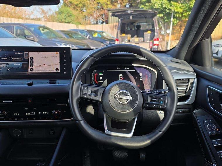 Advanced windscreen head up display, Blind spot warning, Drive modes (sport, normal, eco), e-Pedal step, Electric speed sensitive power steering, Emergency and breakdown call, Front and rear parking sensors, Full Digital 12.3" TFT Digital Combimeter, Google maps services - search, weather, 3D maps and Google street view, Hands free power tailgate, Idle stop/start system, Intelligent around view monitor, Intelligent Cruise control (ICC), Intelligent driver alert system, Intelligent forward collision warning, Intelligent lane intervention, Lane departure prevention, Lane departure warning system, Lane keep assist, Moving object detection, Nissan connect 12.3 inch touchscreen infotainment system, Nissan connect navigation, Pro pilot park assist, Push button starter, Rear cross traffic alert, Rear view camera, Remote control services - door locks, lights, horn and car locator, Telematics - notifications and connectivity services, TomTom live traffic services, Traffic sign recognition with legal speed adjustment, Trip computer, Virtual personal assistant and firmware over the air capability, Wireless Apple CarPlay and wired Android Auto, Wireless charging pad, 10 Bose speakers - 2 tweeters, 6 high and medium frequency door speakers and 2 in subwoofer, AM/FM audio system with DAB, Bluetooth audio streaming, Bose acoustimass bass box, Digital amplifier, Front USB connections (Type-A and Type-C), Rear USB charging only ports (Type-A and Type-C), Auto dimming rear view mirror, Auto rear wiper when reversing, Automatic hazard signal with emergency stop signal, Body colour mirror caps, Body coloured door handles, Bodyside mouldings, Chrome side window finisher, Door handle with button, Door mirror memory, e-POWER badging, Electric auto folding door mirrors, Electrically adjustable and heated door mirrors with LED turn indicator, Follow me home headlights, Front and rear LED turning signals, Headlights auto levelling system, Intelligent auto headlights, LED 3rd brake light, LED daytime running lights, LED front fog lights, LED headlights with adaptive driving beam, LED rear lights, One touch front and rear electric windows with remote opening and closing, Privacy glass, Rear bumper with graphite insert, Rear reversing light (bulb lighting), Rear roof spoiler, Rear side wing doors, Rear styling plate, Reverse tilting door mirrors, Shark fin antenna, Splash free rain sensing wipers, Super UV and infrared cut glass, Thermaclear heated windscreen, Three blink turn signal, 12v power socket in dashboard and luggage, 2x Rear coat hooks, 3 bench rear seats in 2nd row, 3 rear headrests, 4 folding assist grip, 6 Luggage hooks - 4 on floor, 2 on side, 60/40 split folding rear seat bench, Ambient lighting around centre console, Ambient lighting in front doors, Centre console storage tray, Chrome interior door handles, Dark black/blueish PVC wrapping, Dark headlining, Driver and front passenger sunvisors with illuminated vanity mirrors, Driver seat back pocket, Dual zone automatic climate control with pollen filter, e-POWER shifter, Electric 4-way lumbar support for drivers seat, Electric adjustable 4 way lumbar support for passenger seat, Electrically adjustable driver seat with massage and memory functions, Front and rear door storage, Front centre console and armrest, Front cupholders x 2, Front door with bottle holders, Glovebox with light, Hard trunk cover, Heated front seats, Heated steering wheel, Height adjustable driver's seat, Height adjustable front headrests, Height adjustable passenger seat, Leather steering wheel, Luggage board system, Luggage space lighting, Manually adjustable passenger (slide recline + lifter), Multifunction steering wheel, Passenger seat back pocket, Quilted premium leather upholstery, Rear armrest with 2 cupholders, Rear door bottle holders, Single front passenger seat, Soft PVC kneepad, Steering wheel switches, Tilt/telescopic adjustable steering wheel, Two rear isofix child seat anchorage points with top tether, Welcome light and doors with console tray ambient lighting, Glass roof pack with roof rails - Qashqai, 3x3 point rear seatbelt pretensioners + load limiters, ABS with EBD and brake assist, Active brake limited slip, Auto hold function, Child locks on rear doors, Curtain and front side, far side airbags, Driver and passenger airbags, Driver, passenger and 2nd row rear seat belt reminder, Electronic parking brake, Front seatbelt pretensioners + load limiters, Height adjustable front seatbelts, Hill start assist, Intelligent blind spot intervention, Intelligent front emergency braking with pedestrian, cyclist recognition and junction assist, Intelligent rear automatic braking, Tyre pressure monitoring system, Vehicle dynamic control, Advance intelligent key with driver memory storage (seats, mirrors, audio), Capless fuel filler, Engine immobiliser, Remote central door locking with deadlocking, Thatcham Cat.1 alarm, Interior instrumental panel C finisher, 20" Diamond cut alloy wheels, Tyre puncture repair kit,