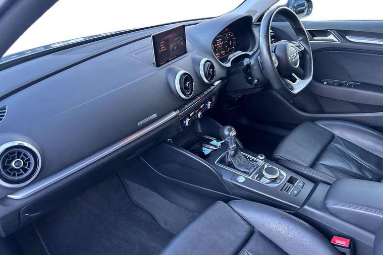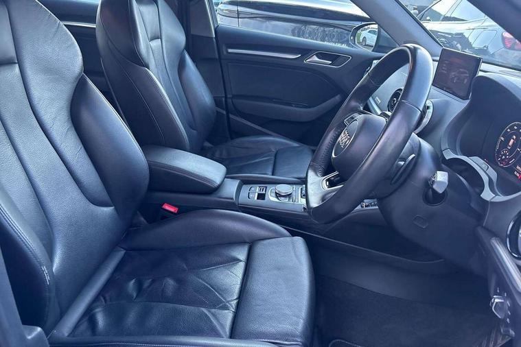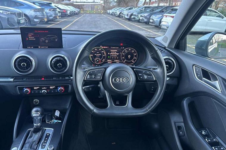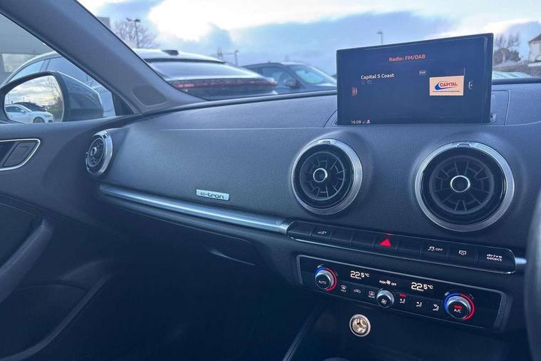 Audi active lane assist, Audi drive select, Audi smartphone interface, Automatic start/stop system, Colour driver's information system display, Cruise control, Dynamic route guidance with TMC pro, Electro - mechanical power assisted steering, Email and text messages, EV button, Integrated navigation with 3D display, Mobile telephone preparation - bluetooth interface, Service interval indicator, Speed limit display, Voice control system, Voice recognition for navigation system, Dynamic suspension, Mode 3 Type 2 charging cable for home wall box or public charging and 3 pin UK domestic charging cable, 10 GB hard disk, 2 USB interfaces and Aux-In jack, 2 x SDXC card reader, Audi music interface, CD/DVD player, DAB Digital radio, MMI radio plus with 7" colour MMI screen and MMI controller, Online entertainment, Aluminium window trim, Auto dimming interior rear view mirror, Body colour bumpers, Body colour door mirrors, Body colour roof spoiler with aerodynamic inserts in high gloss black, Chrome exhaust tailpipes, e-tron badging on front wing and front grille, Electric front windows, Electric rear windows, Electrically adjustable and heated door mirrors with integrated LED side indicators, Heated windscreen washer jets, High beam assist, Light and rain sensors, Matt black radiator grille, Rear wiper, Sport specific side air inlet grille and diffuser insert, Vehicle charging socket behind the Audi rings on the bonnet, 3 adjustable rear headrests, 60/40 split folding rear seat, Adjustable front centre armrest, Driver and front passenger illuminated vanity mirrors, Dual zone electronic climate control, Flat bottom 3 spoke multifunction leather sport steering wheel with gearshift paddles, Front and rear interior lights with delay, Front/rear floor mats, Height and reach adjustable steering wheel, Isofix child seat preparation for front passenger/outer rear seats inc passenger airbag deactivation including top tether, Lashing point in luggage compartment, Manual height adjustable front seats, Rock grey headlining, Storage compartments in doors side trims, centre console and under front drivers seat, Tool kit, Interior lighting pack - A3 e-tron, Non smoking pack - A3, Storage and luggage pack - A3/RS3, Technology pack - A3, 3 point seatbelts on all seats, ABS/EBD, Active bonnet, Active front headrests, Airbags - front driver/passenger, front & rear side, curtain, drivers knee, ASR, Brake recuperation, EDL, Electromechanical parking brake, ESC - Electronic Stability Control + traction control, Front passenger airbag deactivation, Hill hold assist, Manual rear child locks, Multi-Collision braking, Pre-sense front with pedestrian recognition, Seatbelt warning, Tyre pressure warning, Warning triangle and first aid kit, Advanced key, Anti theft alarm, Anti-theft wheel bolts, Remote control central locking, Thatcham category 1 alarm + immobiliser, Aluminium air vent surrounds, Aluminium trim elements, Door sill trims with Aluminium inlay and e-tron logo, 17" 5 Arm design alloy wheels, Tyre repair kit,