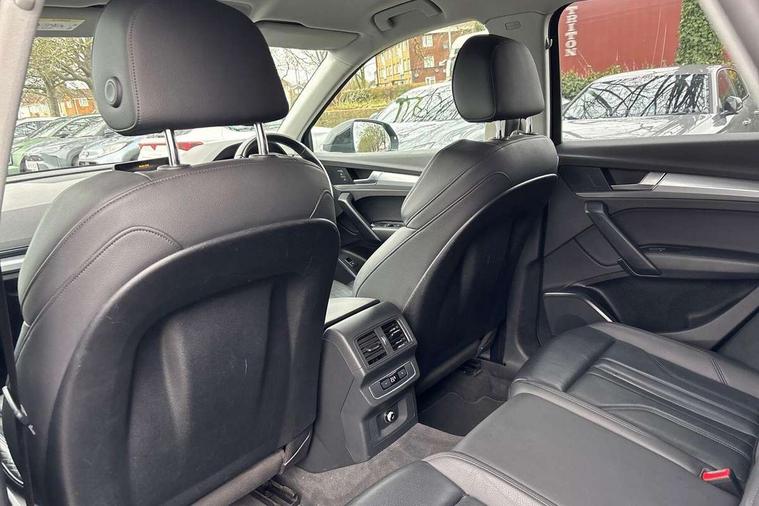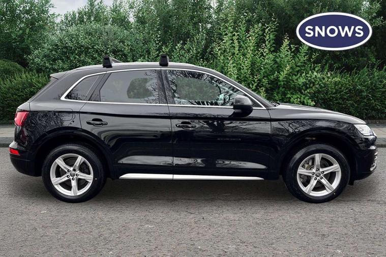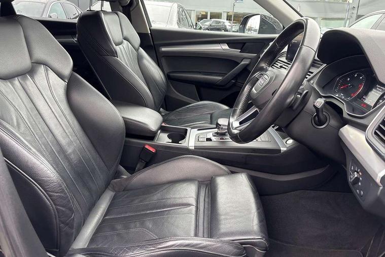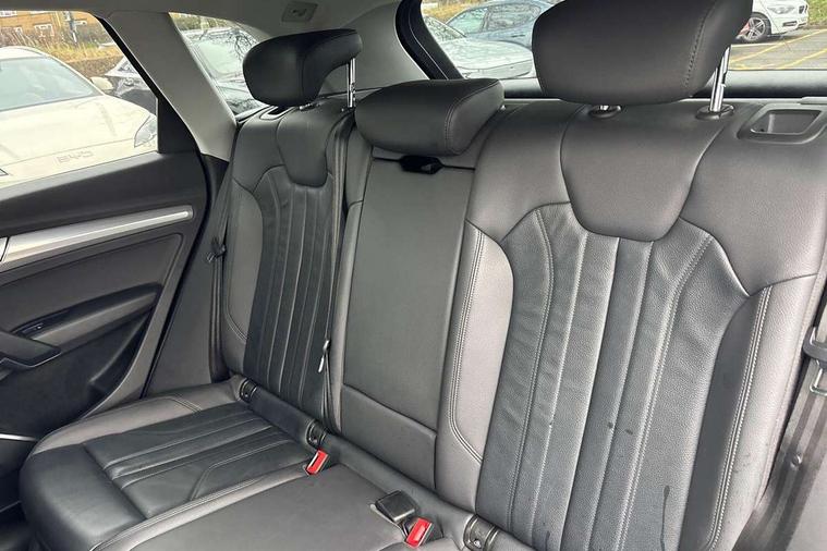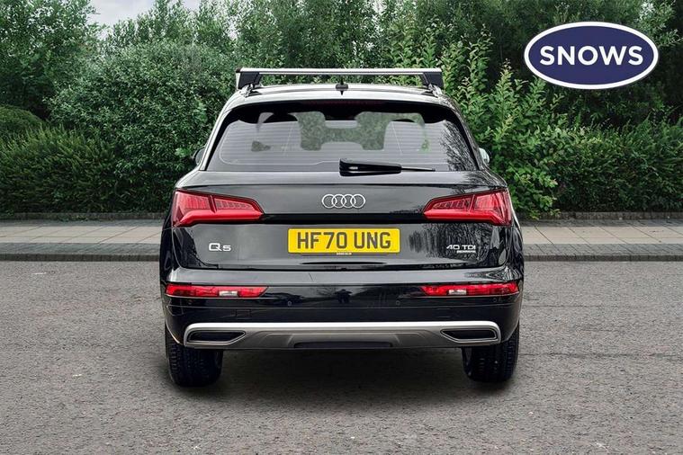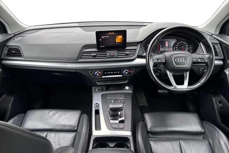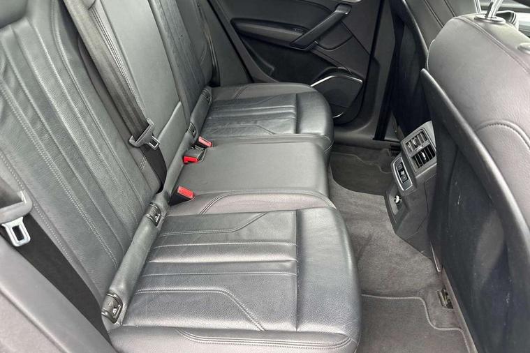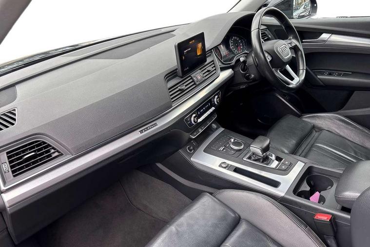7" Colour driver information system, Audi connect safety and service (e-call), Audi drive select, Audi parking system plus with front and rear sensors, Audi Pre sense collision avoidance, Audi smartphone interface, Automatic start-stop system with coasting functionality and efficiency programme, Cruise control + speed limiter, Electro - mechanical power assisted steering, MMI Navigation, Mobile telephone preparation - bluetooth interface, Power tailgate, Service interval indicator, Voice control system, Diesel particulate filter, Dynamic suspension, Quattro on demand, 2 x USB charging port with aux input socket, 2x SD card slot, CD player, DAB Digital radio, MMI radio plus with 7" colour MMI screen and MMI controller, Acoustic windscreen, Air inlets in matt titanium black with blades in matt aluminium silver, Aluminium roof rails, Auto dimming rear view mirror, Automatic headlight levelling, Body colour bumpers, Body colour door mirrors, Chrome exhaust tailpipe, Electric adjustable/heated/folding door mirrors, Front and rear electric windows, LED rear lights, Light and rain sensor for auto activation of lights and windscreen wipers, Loading sill protector in stainless steel, Matt selenite silver underbody protection, Privacy glass with front acoustic glazing, Rear diffuser strip in selenite silver, Rear spoiler, Rear wiper, Side skirts in matt selenite silver, Twilight grey matt radiator grille with matt aluminium horizontal chrome struts, Xenon headlights with LED Daytime running light, 3 rear headrests, 3 spoke high multi-function leather steering wheel with shift paddles, 40:20:40 split folding rear seat with rear centre armrest, Cloth headlining, Deluxe 3 zone electronic climate control, Door sills trims with aluminium inlays, Front centre armrest, Front/rear floor mats, Heated front seats, Height adjustable front head restraints, Height/reach adjustable steering column, ISOFIX child seat mounting and top tether, Luggage compartment carpet, Manual seat adjustment with 4-way electric lumbar support, Removable luggage compartment floor, Sunvisors with vanity mirrors, Trunk roller cover, High gloss pack - Q5, Non Smokers pack, 3 point seatbelts on all seats, 6 airbags - Driver, front passenger, curtain and side airbags, Electromechanical parking brake, Electronic stabilisation control including ABS, ASR and EDL, Front passenger airbag deactivation, Hill descent control, Hill hold assist, Multi collision brake assist, Pop-up bonnet for pedestrian protection, Pre sense city, Seat belt force limiter, Seatbelt monitoring, Tyre pressure warning, Warning triangle and first aid kit, Anti theft alarm, Anti-theft wheel bolts, Keyless Go access/ignition system, Remote central locking, Aluminium rhombus inlay, Tool kit,