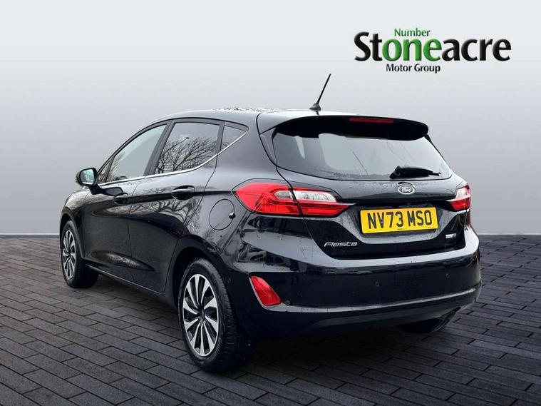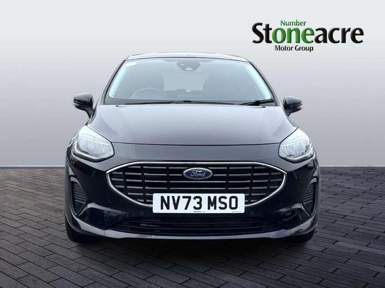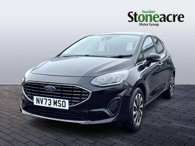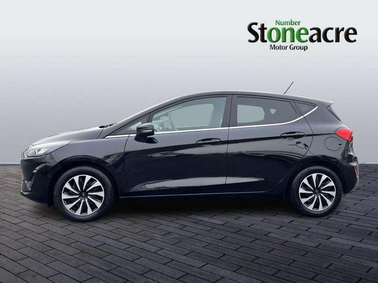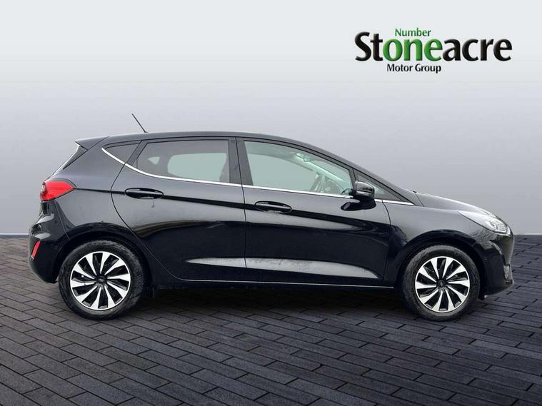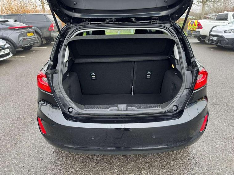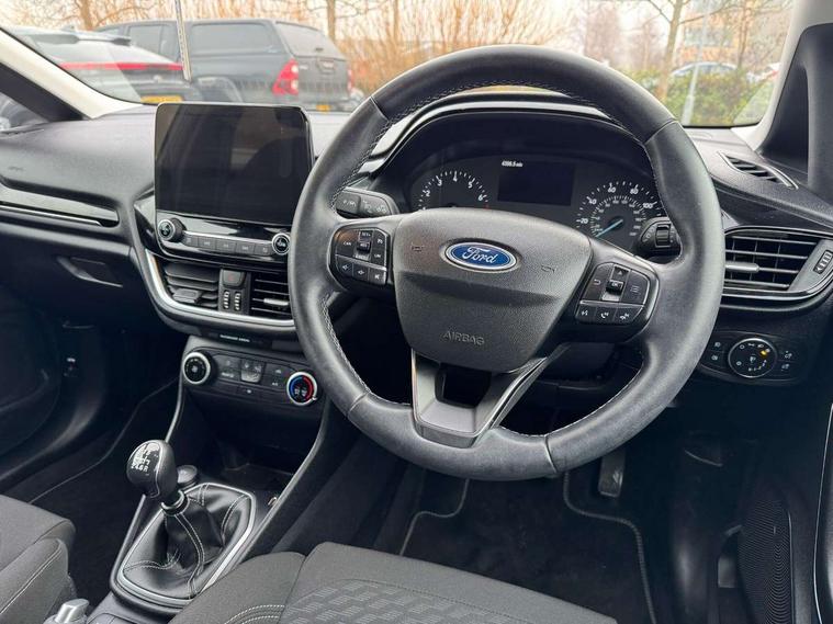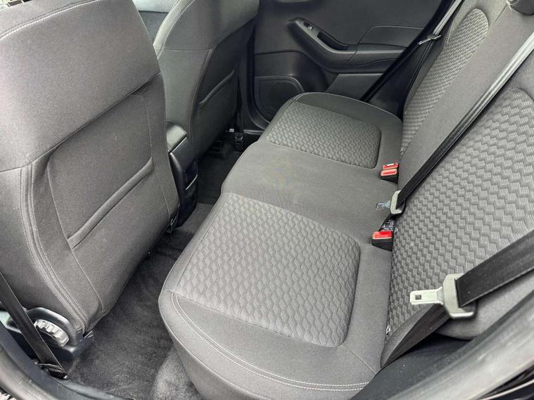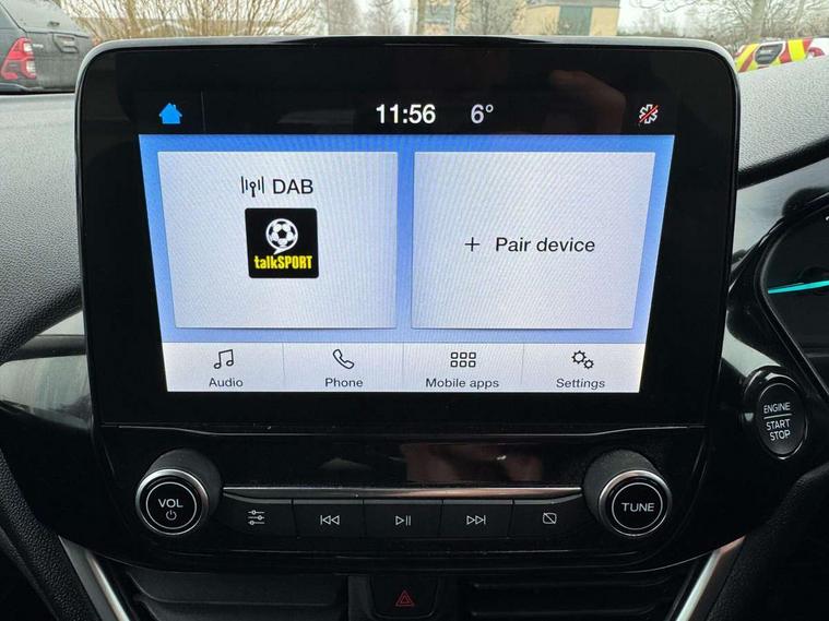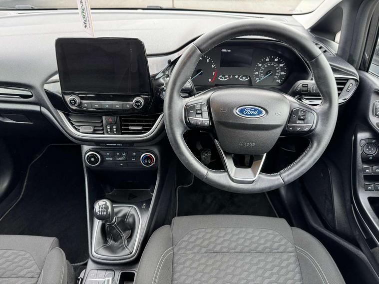 Bluetooth system, Electric power steering, Ford easy fuel, Ford SYNC 3 Navigation system incl 8" touchscreen, 7 speakers, FordPass connect, Apple carplay, android auto, voice control and emergency assistance, Rear parking distance sensors, Selectable drive modes (Normal, Sport, Track), Trip computer, 2 USB ports, Auxiliary input socket, DAB Digital radio, Steering wheel mounted controls, Body colour bumpers, Body colour door handles, Body colour rear spoiler, Body coloured electrically operated and heated door mirrors with side indicators, Chrome beltline trim, Chrome front grille, Chrome lower window surround, Cornering front fog lights, Electric front windows/one touch facility, Electric rear windows, Quickclear heated windscreen, Rain sensing wipers and auto dimming rear view mirror, Rear privacy glass, Rear wiper, 3 spoke leather trimmed steering wheel with audio control, 60/40 split folding rear seat, Adjustable head restraints, Boot carpet, Centre console with opening armrest, 2x cupholders, 12v and USB, Chrome inner door handles, Cloth upholstery, Footwell illumination, Front floor mats in velour, Front map reading lights, Front seat and rear pockets, Illuminated glovebox, Leather gaiter, Load area light, Luxury woven headliner, Manual 2 way passenger seat adjust, Manual 4-way driver seat adjust, Manual air conditioning, Overhead console with sunglasses holder, Pollen filter, Rake/reach adjustable steering wheel, Sensico wrapped steering wheel, NCAP Pack - Fiesta, 3 point seatbelts on all rear seats, ABS+EBA, Curtain airbags, Driver and passenger airbags, Drivers knee airbag, Electronic stability control with hill start assist, Front passenger airbag deactivation, Front side airbags, Seatbelt warning, Two tone horn, Tyre pressure monitoring system, Keyless start with 'Ford Power' starter button, MyKey system, Remote central locking & engine immobiliser, Thatcham Cat.1 alarm, 16" 10 spoke alloy wheels,