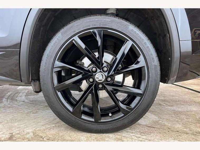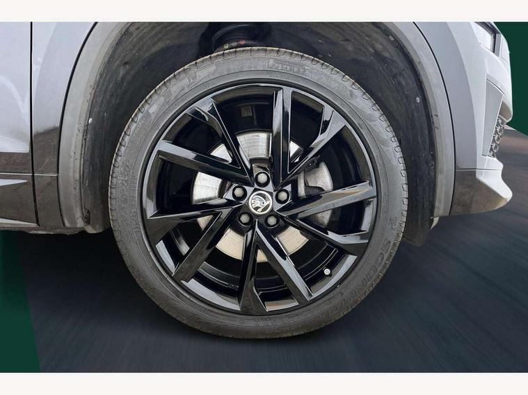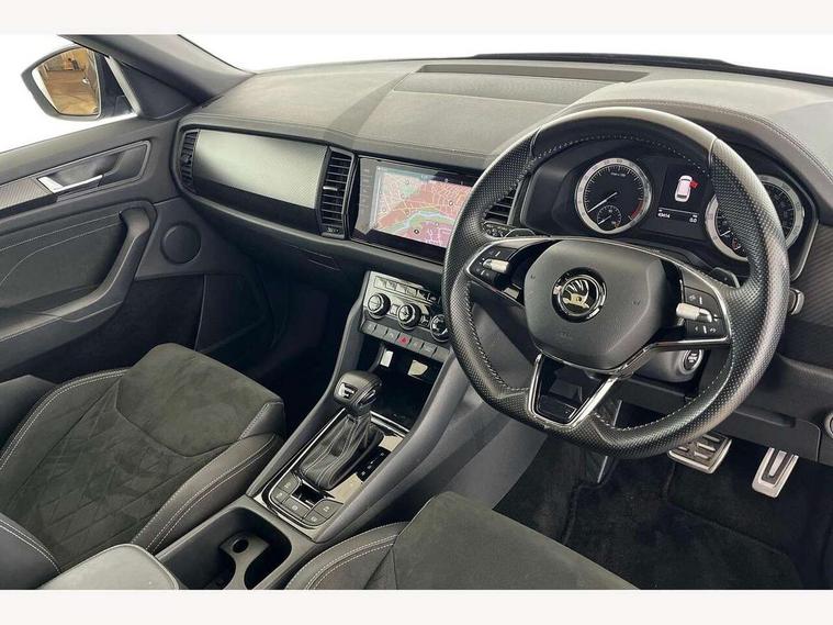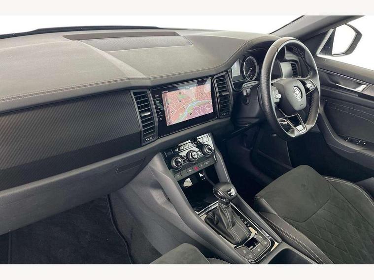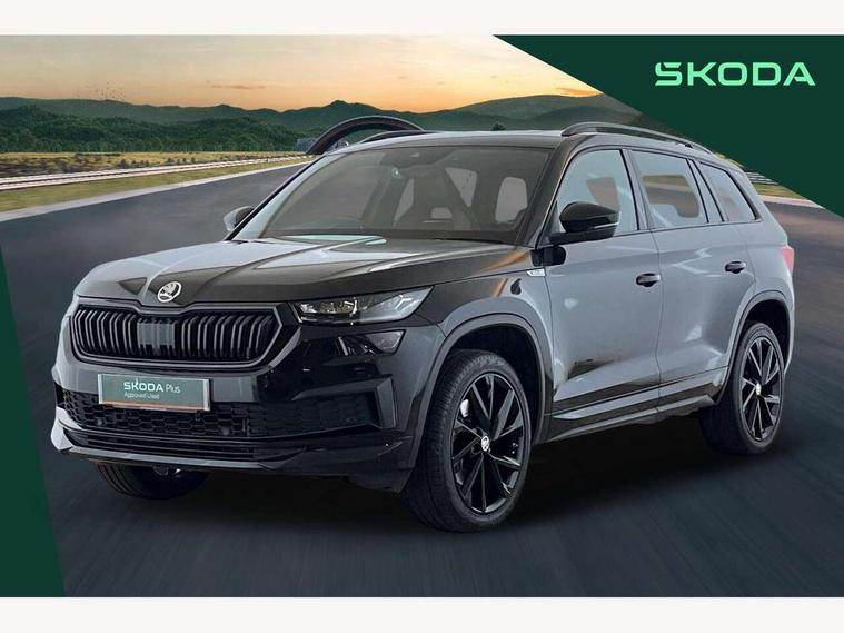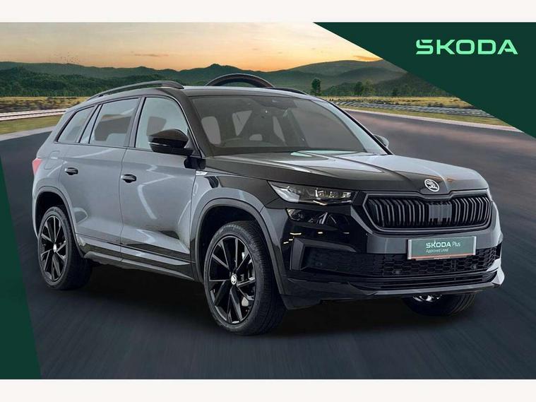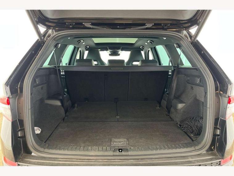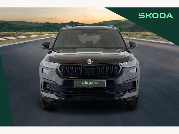 Bluetooth system, Columbus satellite navigation with 9.2" touchscreen, integrated Wi-Fi, web radio, Digital voice enhancement, E-call, ECO Stop/start function, Exterior temperature indicator, Progressive steering, Rear view camera, Smartlink wireless for apple carplay and wired for android auto, Speed limiter, USB C Port x 2 in front centre console, Wireless charging, 8 speakers, DAB Digital radio, Aero front windscreen wipers with intermittent function, Aero rear window wiper, Auto dimming rear view mirror, Black roof rails, Black sports styling including front grille and window surrounds, Black wheel arch surrounds, Body colour bumpers, Body colour door handles, Electric adjustable/heated/folding door mirrors, driver side auto dimming with boarding sports and memory function, Electric front and rear windows, Extended rear spoiler with finlets in gloss black, Front fog lights, Full LED matrix headlights with AFS (adaptive front light system), cornering function and AWL (all weather lighting system), Gloss black door mirrors, Headlight washers, Heated rear window, Invisible tailpipe, LED daytime running lights, LED rear fog light, LED third brake light in rear spoiler, Light assistant (coming/leaving home/tunnel light), Off-road style lower front bumper element, Privacy glass, Rain and light sensors, Rear diffuser, Rear LED lights (high functionality) with welcome effect and dynamic indicators, Rear side wing doors, Safety reflectors on front and rear doors, Sportline badge on front fender, Sports front and rear bumpers including lower rear chrome strip, Tailgate lettering in Black, Window control switches with black trim, Without engine designation, 12V socket in boot, 2 rails with 2 hooks, 2 seat bench in 3rd row, 3 seat bench in 2nd row, 4 foldable roof handles with rear coat hooks, 60:40 foldable rear seat with sliding adjustment and backrest angle adjustment, Aluminium pedals, Black roof headlining, Bottle holders in door panel in the 1.5 litre front and 1 litre rear, Cargo storage compartments, Chrome headlight control button, Chrome interior door handles, Coat hooks on B pillar, Covered storage compartment on driver side, Front centre armrest with storage compartment, cup holder and 12V socket, Front courtesy lights, Gear shift lever with chrome frame and black gloss insert, Grey stitching in front and rear armrests and door armrests + door inserts, Height adjustable front headrests, Illuminated and cooled glovebox, Illuminated luggage compartment, Isofix child seat fittings in outer rear seats with top tether, Manually adjustable steering column, Microsuede door panels, Net programme in boot (1x horizontal Net, 2x vertical Nets), Overhead glasses storage compartment, Pollen filter, Rear centre armrest with cupholders, Single front passenger seat, Sliding trunk cover, Small Bags on the inner sides of the front backrests, Sports seats, Sunvisors with illuminated vanity mirrors, Three rear height adjustable headrests, Ticket holder on A Pillar, Umbrella in door panel, Variable boot floor, LED Interior light pack - Kodiaq, Auto door release and activation of warning lights, Child locks on rear doors, Driver and front passenger airbag with knee airbag and front passenger airbag deactivation, Electronic parking brake with hill start assist, Emergency rear braking signal, ESC (incl. ABS+MSR+ASR+EDS+HBA+DSR+RBS+MKB), Front assist with autonomous emergency braking, Front side airbags with curtain airbags, Fuel cut off safety device, Height adjustable front 3 point seatbelts + pretensioners, Hill hold control, Rear disc brakes, Safety vest holder in door, Seat belt reminder for all seats, Tailgate unlocking from outside, Three point rear seat belts, Two tone horn, Tyre pressure monitor, Alarm with interior monitoring and tilt sensor with safe function, Anti-theft wheel bolts, Immobiliser, Keyless entry and start system (KESSY), Remote central locking with 2 keys, Black air vent surround, Carbon finish dashboard and door inserts, Grey stitching in dashboard, 20" Vega Anthracite alloy wheels, Temporary spare wheel (space saver),