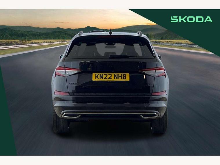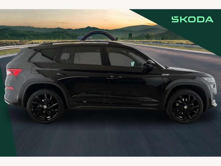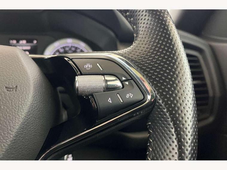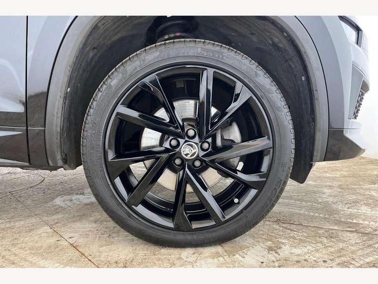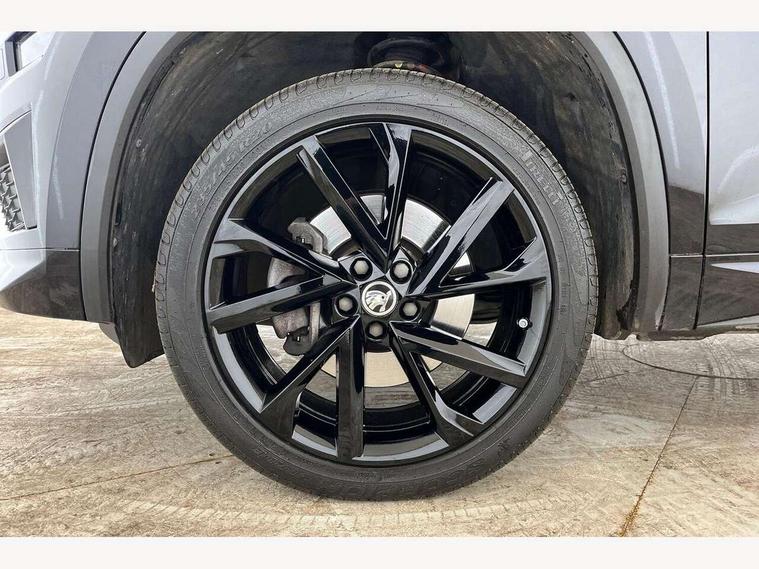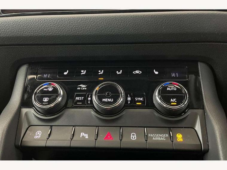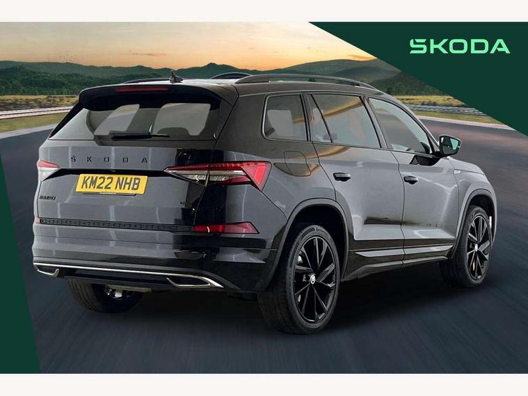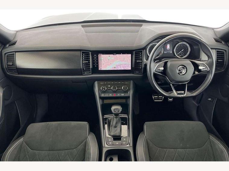 Bluetooth system, Columbus satellite navigation with 9.2" touchscreen, integrated Wi-Fi, web radio, Digital voice enhancement, E-call, ECO Stop/start function, Exterior temperature indicator, Progressive steering, Rear view camera, Smartlink wireless for apple carplay and wired for android auto, Speed limiter, USB C Port x 2 in front centre console, Wireless charging, 8 speakers, DAB Digital radio, Aero front windscreen wipers with intermittent function, Aero rear window wiper, Auto dimming rear view mirror, Black roof rails, Black sports styling including front grille and window surrounds, Black wheel arch surrounds, Body colour bumpers, Body colour door handles, Electric adjustable/heated/folding door mirrors, driver side auto dimming with boarding sports and memory function, Electric front and rear windows, Extended rear spoiler with finlets in gloss black, Front fog lights, Full LED matrix headlights with AFS (adaptive front light system), cornering function and AWL (all weather lighting system), Gloss black door mirrors, Headlight washers, Heated rear window, Invisible tailpipe, LED daytime running lights, LED rear fog light, LED third brake light in rear spoiler, Light assistant (coming/leaving home/tunnel light), Off-road style lower front bumper element, Privacy glass, Rain and light sensors, Rear diffuser, Rear LED lights (high functionality) with welcome effect and dynamic indicators, Rear side wing doors, Safety reflectors on front and rear doors, Sportline badge on front fender, Sports front and rear bumpers including lower rear chrome strip, Tailgate lettering in Black, Window control switches with black trim, Without engine designation, 12V socket in boot, 2 rails with 2 hooks, 2 seat bench in 3rd row, 3 seat bench in 2nd row, 4 foldable roof handles with rear coat hooks, 60:40 foldable rear seat with sliding adjustment and backrest angle adjustment, Aluminium pedals, Black roof headlining, Bottle holders in door panel in the 1.5 litre front and 1 litre rear, Cargo storage compartments, Chrome headlight control button, Chrome interior door handles, Coat hooks on B pillar, Covered storage compartment on driver side, Front centre armrest with storage compartment, cup holder and 12V socket, Front courtesy lights, Gear shift lever with chrome frame and black gloss insert, Grey stitching in front and rear armrests and door armrests + door inserts, Height adjustable front headrests, Illuminated and cooled glovebox, Illuminated luggage compartment, Isofix child seat fittings in outer rear seats with top tether, Manually adjustable steering column, Microsuede door panels, Net programme in boot (1x horizontal Net, 2x vertical Nets), Overhead glasses storage compartment, Pollen filter, Rear centre armrest with cupholders, Single front passenger seat, Sliding trunk cover, Small Bags on the inner sides of the front backrests, Sports seats, Sunvisors with illuminated vanity mirrors, Three rear height adjustable headrests, Ticket holder on A Pillar, Umbrella in door panel, Variable boot floor, LED Interior light pack - Kodiaq, Auto door release and activation of warning lights, Child locks on rear doors, Driver and front passenger airbag with knee airbag and front passenger airbag deactivation, Electronic parking brake with hill start assist, Emergency rear braking signal, ESC (incl. ABS+MSR+ASR+EDS+HBA+DSR+RBS+MKB), Front assist with autonomous emergency braking, Front side airbags with curtain airbags, Fuel cut off safety device, Height adjustable front 3 point seatbelts + pretensioners, Hill hold control, Rear disc brakes, Safety vest holder in door, Seat belt reminder for all seats, Tailgate unlocking from outside, Three point rear seat belts, Two tone horn, Tyre pressure monitor, Alarm with interior monitoring and tilt sensor with safe function, Anti-theft wheel bolts, Immobiliser, Keyless entry and start system (KESSY), Remote central locking with 2 keys, Black air vent surround, Carbon finish dashboard and door inserts, Grey stitching in dashboard, 20" Vega Anthracite alloy wheels, Temporary spare wheel (space saver),