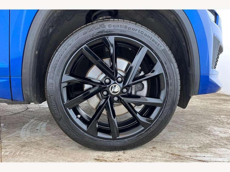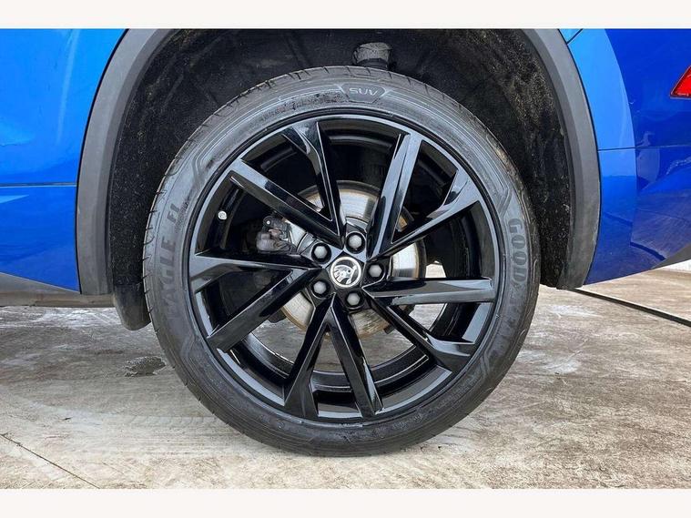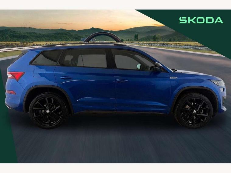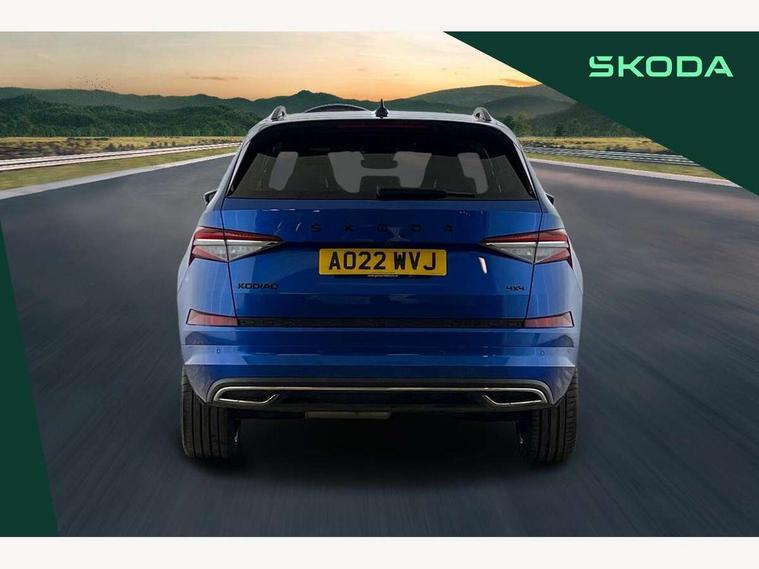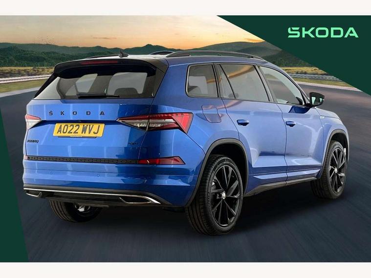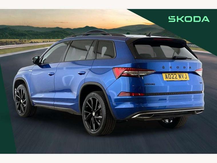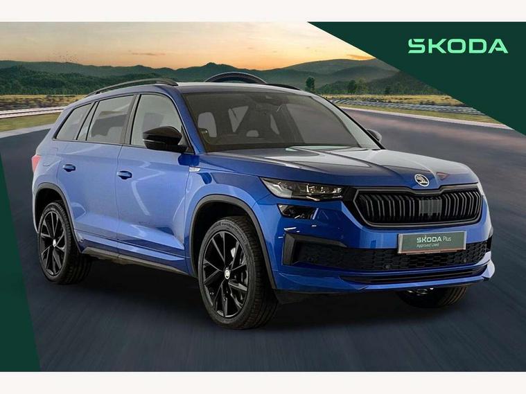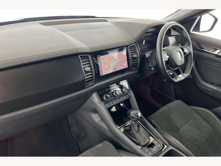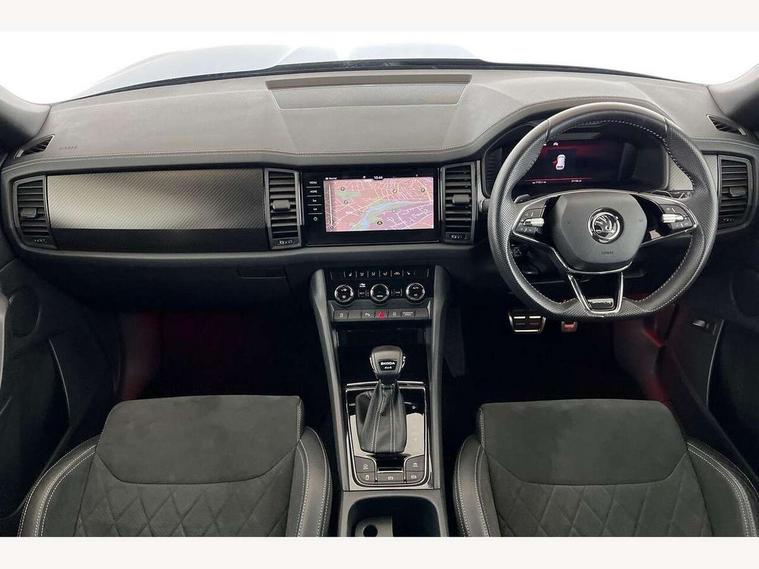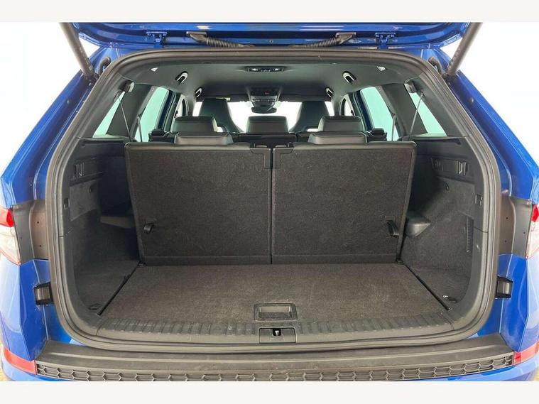 Bluetooth system, Columbus satellite navigation with 9.2" touchscreen, integrated Wi-Fi, web radio, Digital voice enhancement, E-call, ECO Stop/start function, Exterior temperature indicator, Progressive steering, Rear view camera, Smartlink wireless for apple carplay and wired for android auto, Speed limiter, Tailgate unlocking from outside, USB C Port x 2 in front centre console, Wireless charging, 8 Speakers, DAB Digital radio, Aero front windscreen wipers with intermittent function, Aero rear window wiper, Auto dimming rear view mirror, Black roof rails, Black sports styling including front grille and window surrounds, Black wheel arch surrounds, Body colour bumpers, Body colour door handles, Electric adjustable/heated/folding door mirrors, driver side auto dimming with boarding sports and memory function, Electric front and rear windows, Extended rear spoiler with finlets in gloss black, Front fog lights, Full LED matrix headlights with AFS (adaptive front light system), cornering function and AWL (all weather lighting system), Gloss black door mirrors, Headlight washers, Heated rear window, Invisible tailpipe, LED daytime running lights, LED rear fog light, LED third brake light in rear spoiler, Light assistant (coming/leaving home/tunnel light), Off-road style lower front bumper element, Privacy glass, Rain and light sensors, Rear diffuser, Rear LED lights (high functionality) with welcome effect and dynamic indicators, Rear side wing doors, Safety reflectors on front and rear doors, Sportline badge on front fender, Sports front and rear bumpers including lower rear chrome strip, Tailgate lettering in Black, Window control switches with black trim, Without engine designation, 12V socket in boot, 2 rails with 2 hooks, 2 seat bench in 3rd row, 3 seat bench in 2nd row, 4 foldable roof handles with rear coat hooks, 60:40 foldable rear seat with sliding adjustment and backrest angle adjustment, Aluminium pedals, Black roof headlining, Bottle holders in door panel in the 1.5 litre front and 1 litre rear, Cargo storage compartments, Chrome headlight control button, Chrome interior door handles, Coat hooks on B pillar, Covered storage compartment on driver side, Front centre armrest with storage compartment, cup holder and 12V socket, Front courtesy lights, Gear shift lever with chrome frame and black gloss insert, Grey stitching in front and rear armrests and door armrests + door inserts, Height adjustable front headrests, Illuminated and cooled glovebox, Illuminated luggage compartment, Isofix child seat fittings in outer rear seats with top tether, Manually adjustable steering column, Microsuede door panels, Net programme in boot (1x horizontal Net, 2x vertical Nets), Overhead glasses storage compartment, Pollen filter, Rear centre armrest with cupholders, Single front passenger seat, Sliding trunk cover, Small Bags on the inner sides of the front backrests, Sports seats, Sunvisors with illuminated vanity mirrors, Three rear height adjustable headrests, Ticket holder on A Pillar, Umbrella in door panel, Variable boot floor, LED Interior light pack - Kodiaq, Auto door release and activation of warning lights in the event of an accident, Child locks on rear doors, Driver and front passenger airbag with knee airbag and front passenger airbag deactivation, Electronic parking brake with hill start assist, Emergency rear braking signal, ESC (incl. ABS+MSR+ASR+EDS+HBA+DSR+RBS+MKB), Front assist with autonomous emergency braking, Front side airbags with curtain airbags, Fuel cut off safety device, Height adjustable front 3 point seatbelts + pretensioners, Hill hold control, Rear disc brakes, Safety vest holder in door, Seat belt reminder for all seats, Three point rear seat belts, Two tone horn, Tyre pressure monitor, Alarm with interior monitoring and tilt sensor with safe function, Anti-theft wheel bolts, Immobiliser, Keyless entry and start system (KESSY), Remote central locking with 2 keys, Black air vent surround, Carbon finish dashboard and door inserts, Grey stitching in dashboard, 20" Vega Anthracite alloy wheels, Temporary spare wheel (space saver),
