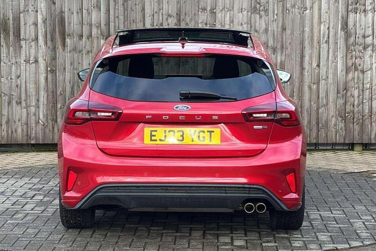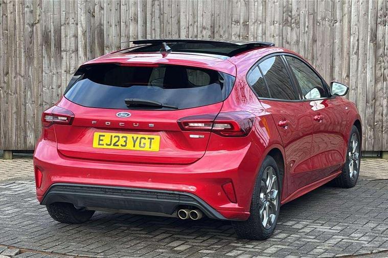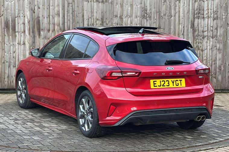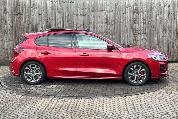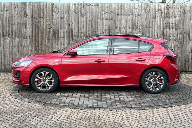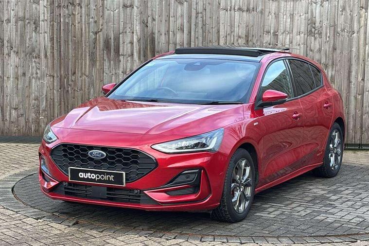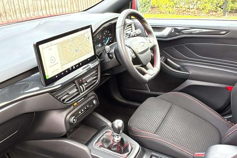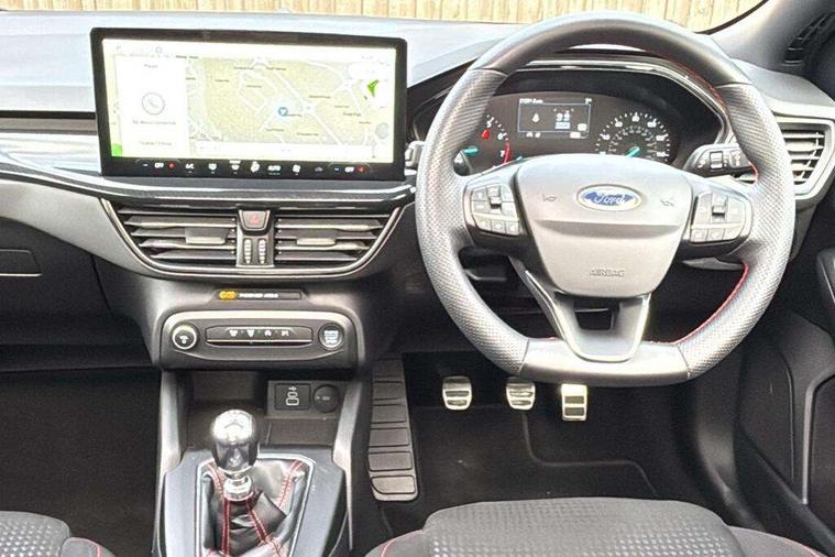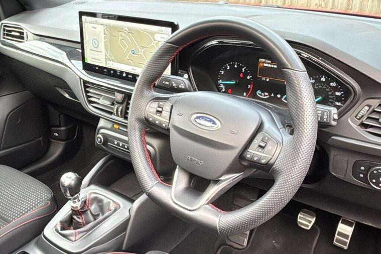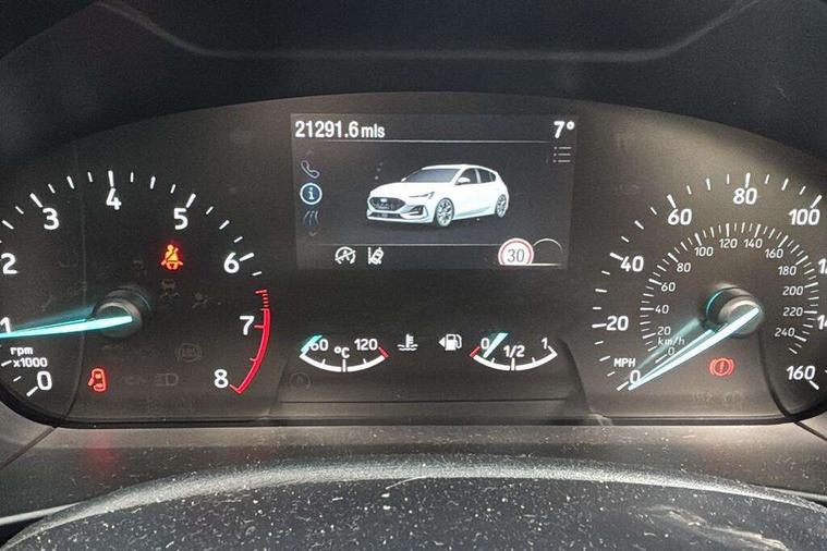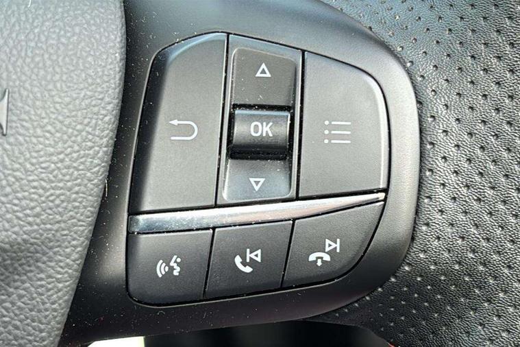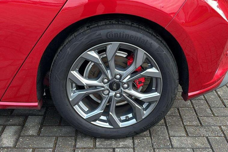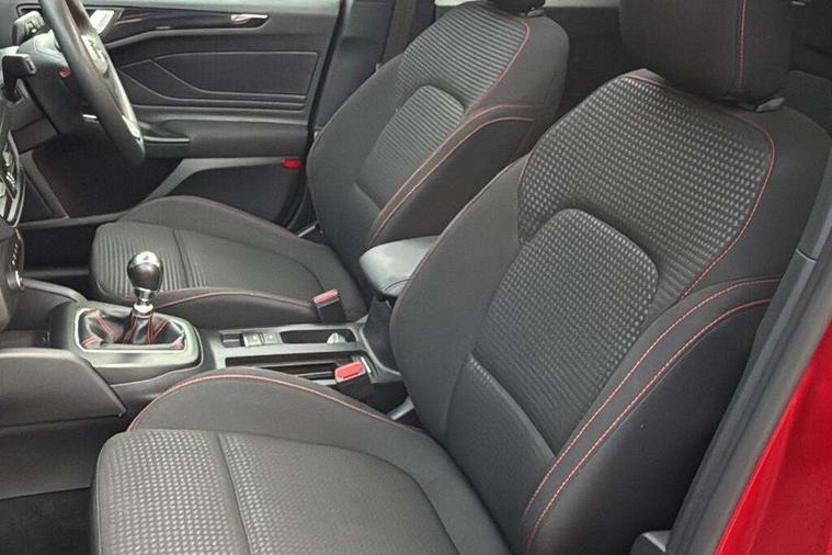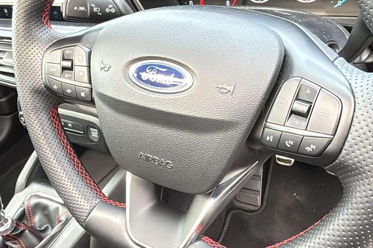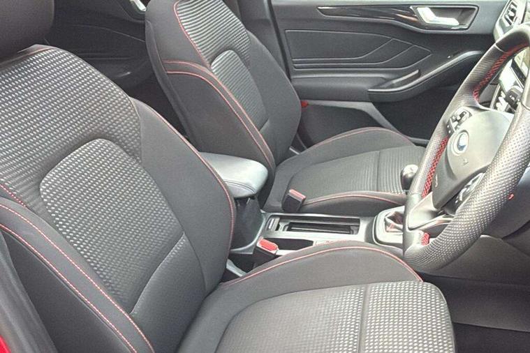 4.2" TFT coloured cluster, Bluetooth system, Digital clock, E-call, Easy fuel capless refuelling system, Eco mode, Ford SYNC 3 navigation with 8" TFT touchscreen, DAB radio and app link Android auto/Apple carplay, Intelligent speed assist, Lane keeping system - lane keeping alert and lane keeping aid, PAS, Selectable drive mode, Trip computer, Sports tuned suspension, 2 USB ports, Aux input, Auto dimming rear view mirror, Auto headlamps (on/off), Automatic rain sensing wipers, Body colour large rear spoiler, Body coloured bumpers, Body coloured door handles, Body coloured electrically operated and heated door mirrors with side indicators, Electrically operated front and rear windows with one touch opening and closing, Front variable intermittent wipers with electric wash, Heated rear window, LED daytime running lamp, LED front fog lamps with cornering function, LED reflector headlamps, Polished twin tailpipe, Power folding door mirrors, Quickclear heated windscreen, Rear privacy glass, Rear side wing doors, ST-Line upper and lower grille with full body styling kit and wing badges, Tailgate wash/wipe, Third brake light, 3 seat bench in 2nd row, 3 spoke flat bottomed Sensico steering wheel with red stitching, Aluminium gear knob, Cloth upholstery, Dark headliner, Driver's lumbar support, Front floor mats, Height adjustable front headrests, Isofix child seat preparation, Manual air conditioning, Reach + rake adjustable steering column, Rear centre headrest, Single front passenger seat, 3x3 point rear seatbelts, ABS+Electronic Brake force Distribution, Auto hold function, Driver airbag, Electronic parking brake, Electronic stability control, Front and rear seatbelt reminder, Front inertia reel height adjustable seatbelts with pre-tensioners, Front passenger airbag, Front side airbags, Hill start assist, Manual rear child locks, Passenger airbag deactivate switch, Post collision braking, Pre collision assist with autonomous emergency braking and pedestrian/cyclist detection, Side curtain airbags, Three rear inertia reel lap/diagonal seatbelts, Tyre pressure monitoring system, Ford keyfree system with Keyless entry and keyless start/sleep mode key fob, MyKey system, Remote central locking & engine immobiliser, Thatcham category 1 alarm, 17" 5x2 spoke alloy wheels with rock metallic finish, Mini steel spare wheel,