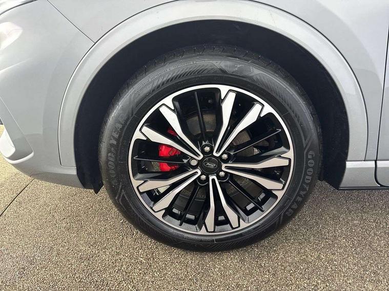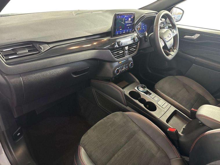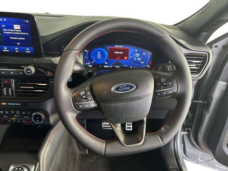 12.3" digital colour instrument cluster, Ford easy fuel, Ford SYNC 3 with 8" TFT LCD touchscreen, App Link, andriod auto/apple carPlay, emergency assistance and navigation with Ford pass connect, Front and rear parking sensors, Hands free power tailgate, Lane keeping aid with lane departure warning, Power assist steering, Rear view camera, Selectable drive modes, Service interval indicator, Sports suspension, Twist beam rear suspension, B&O premium audio system with 10 speakers and subwoofer, 2 USB ports, DAB radio/CD, Auto headlamps with high and low beam, Black roof rails, Day/night rear view mirror, Front LED fog lamps, Large rear spoiler, LED daytime running lights, LED rear lights, Power folding heated door mirrors with puddle lights, Power front/rear windows with global close, Power opening panoramic roof, Privacy glass, Quickclear heated windscreen, Rear side wing doors, Rear wiper, ST Line body styling kit with unique front and rear fascia and bumper, rear painted diffuser, front painted skid plates, dark mesh upper grille, ST Line front scuff plates, Third brake light, Twin exhausts, 10 way power adjustable drivers seat, 2nd row sliding seats with 60:40 split, 8 way manual passenger seat including lumbar support and height adjust, Alloy pedals, Centre console with electronic parking brake, Dark headlining and pillars, Electronic automatic temperature control (EATC), Flat bottomed leather steering wheel in sensico with red stitching, Front and rear head restraints, Heated passenger and driver seats, Heated rear seats, Heated steering wheel, Partial premium touch sensico leather upholstery with black cloth inserts and red stitching, Rear charging point, Single front passenger seat, Sports seats, ST Line front and rear floor mats, 3x3 point rear seatbelts, Airbags - front driver/passenger, front and rear curtain, Drivers knee airbag, Electronic stability control (ESC) and ABS, Ford MyKey Gen 2 safety system, Manual child proof rear door locks, Post collision braking, Pre collision assist with autonomous emergency braking, Rear seat Occupancy alert, Red brake calipers, Tyre pressure monitoring system, Engine immobiliser, Keyless entry and Ford power start button (Keyless start), Locking wheel nuts, Remote powered central double locking doors, Thatcham category 1 alarm,