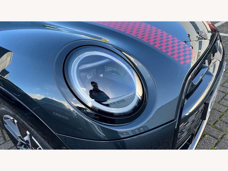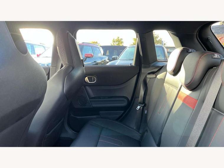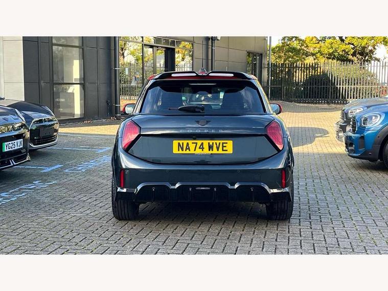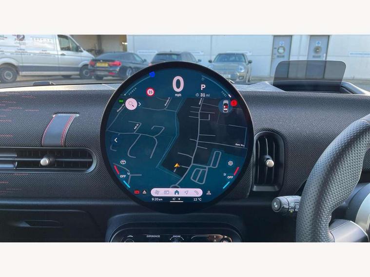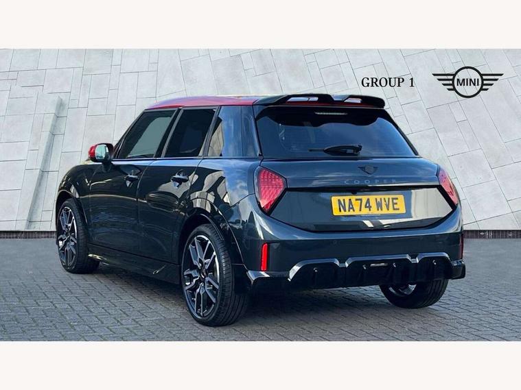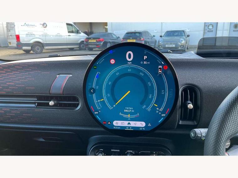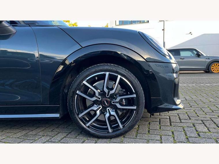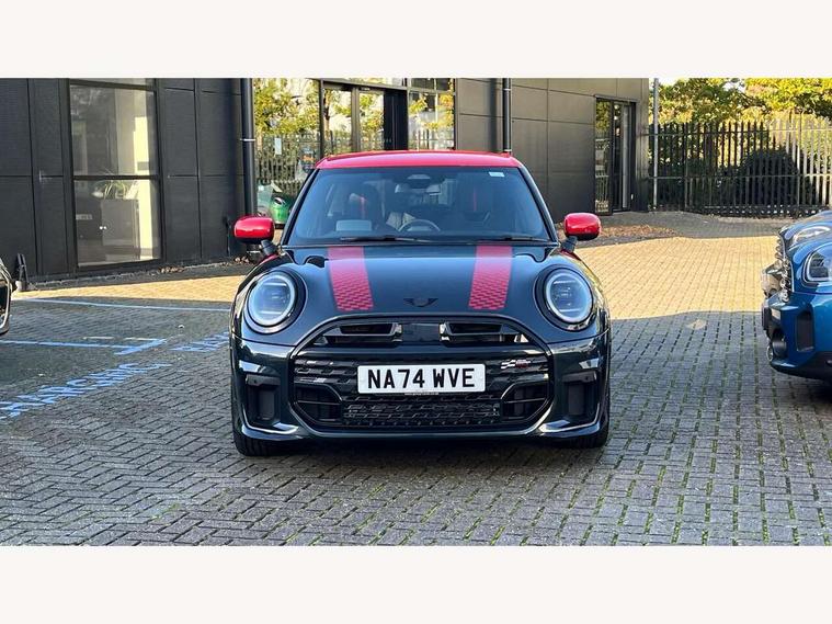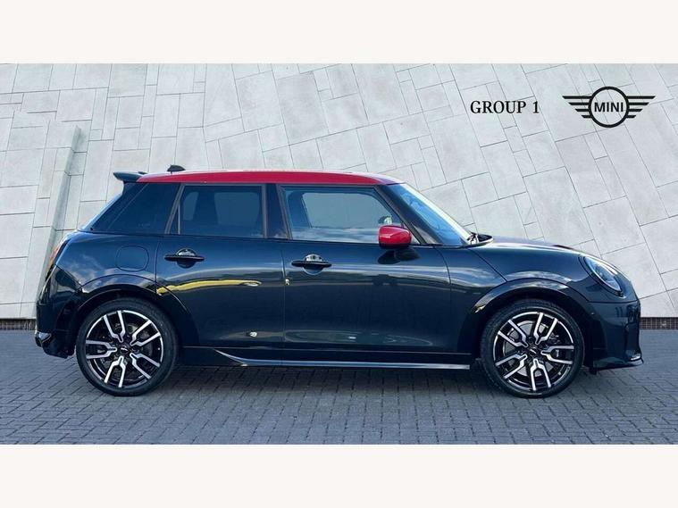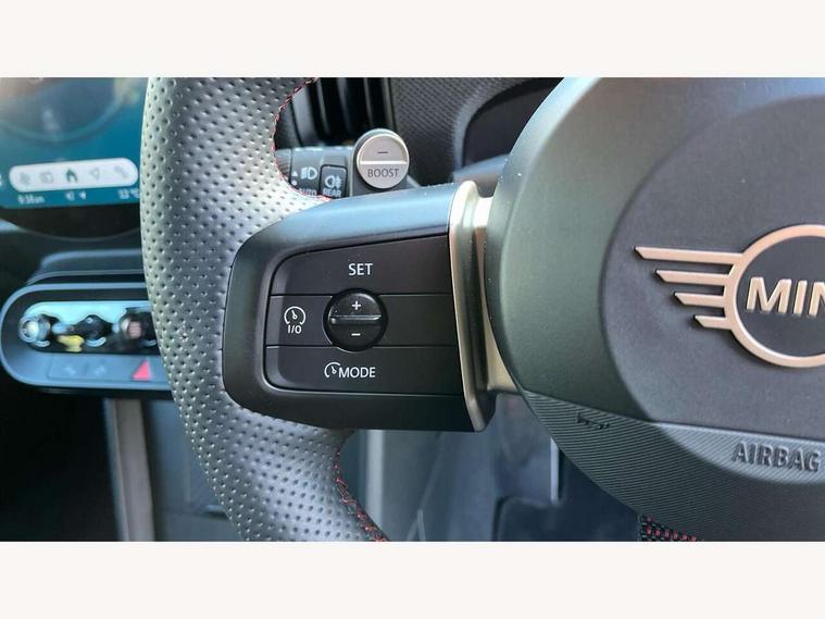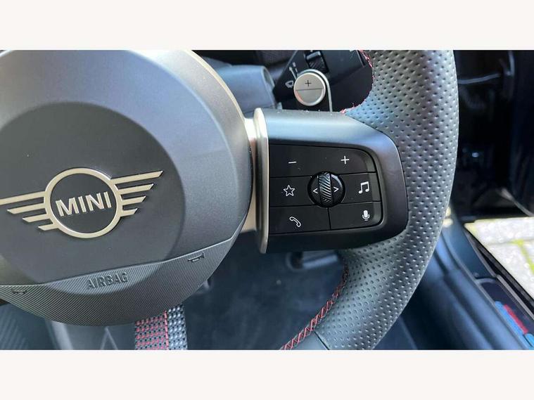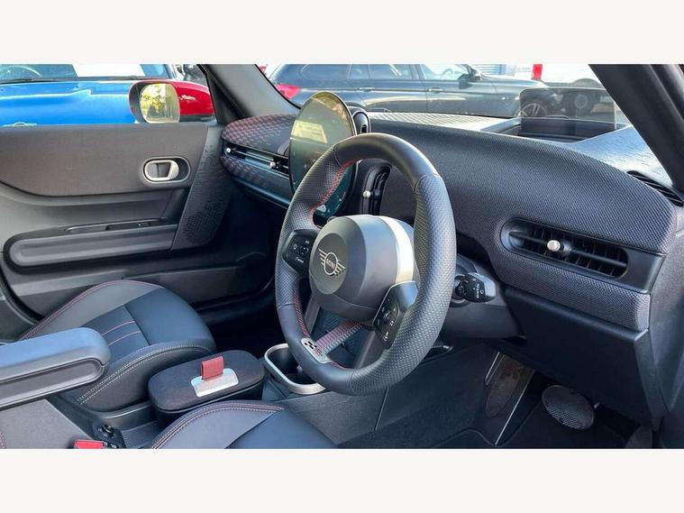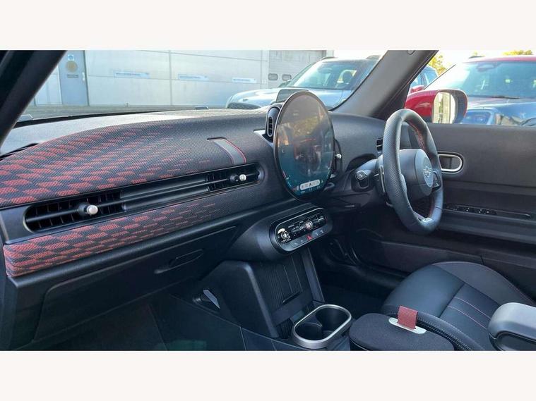 Central toggle bar, Circular OLED Screen, Compatible mobile phone bluetooth with audio streaming, Cruise control, Digital instrument cluster, Electro-mechanical speed dependant steering assistance, Emergency call service, MINI Experience Modes, Mini navigation system, On board computer, Service interval indicator, 7 speed steptronic sport transmission with double clutch, Adaptive suspension, DAB Digital radio, Personal eSim, Auto headlights, Electric adjustable heated door mirrors, Electric front+rear windows, Front and rear apron, Heated rear window, Heated windscreen washer jets, High gloss hexagonal patterned grille surround, LED daytime running lights, LED Headlights, LED indicator lights, LED rear lights, Rain sensor window wipers, Rear fog lights, Rear roof spoiler with airblades, Rear side wing doors, Rear window wiper, 2 zone automatic air conditioning, 3 seat bench in 2nd row, 60/40 rear seat bench, Ambient lighting, Black lower band in high gloss, Cupholders, Dark headliner, Floor mats, Front and rear head restraints, Front compact armrest, Heated steering wheel, Height adjustable passenger seat, Lidded storage box in Black/Red knit, Luggage compartment lighting, Partially perforated vescin steering wheel with red accent, black/red decorative strap, Single front passenger seat, Steering wheel paddle shift, Sunvisors with vanity mirrors, Vescin/Cord upholstery, Driving assistant pack - Cooper Hatchback, Park assistant pack - Cooper Hatchback, 3 point seatbelts on all five seats, 6 Airbags - front, side, head and seat belt tensioners, Acoustic pedestrian protection, Anti-lock braking system (ABS), Brake caliper in Black with JCW badge, Child locks on rear doors, DSC - Dynamic Stability Control, Electronic parking brake, Front and rear disc brakes, Front ISOFIX (iSize), Front passenger airbag deactivation, JCW Sport Brakes, Traction control, Tyre pressure monitoring system, Alarm, Immobiliser, Remote central locking, Black/Red decorative dash strap, JCW Black/Red dashboard knit, Tyre repair kit,