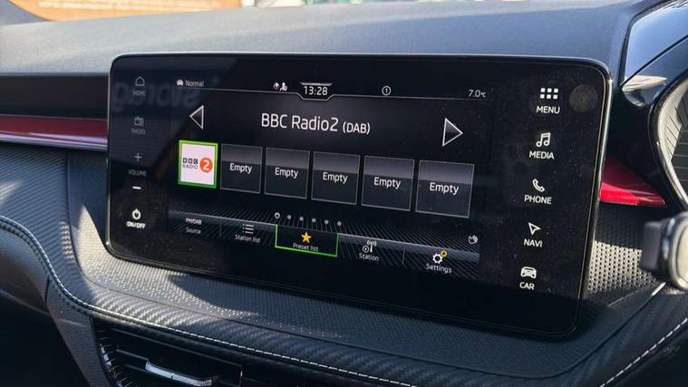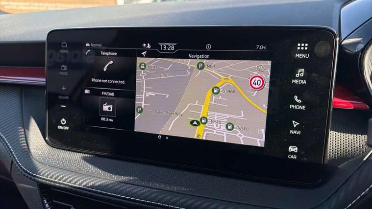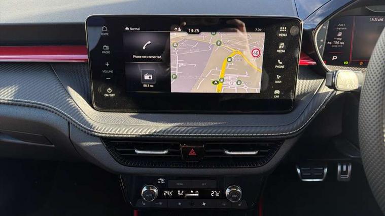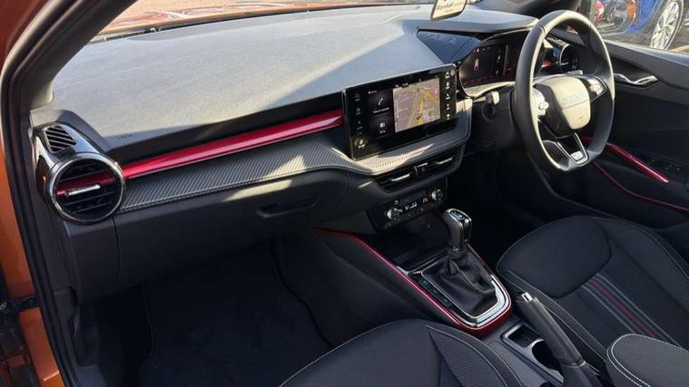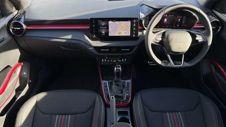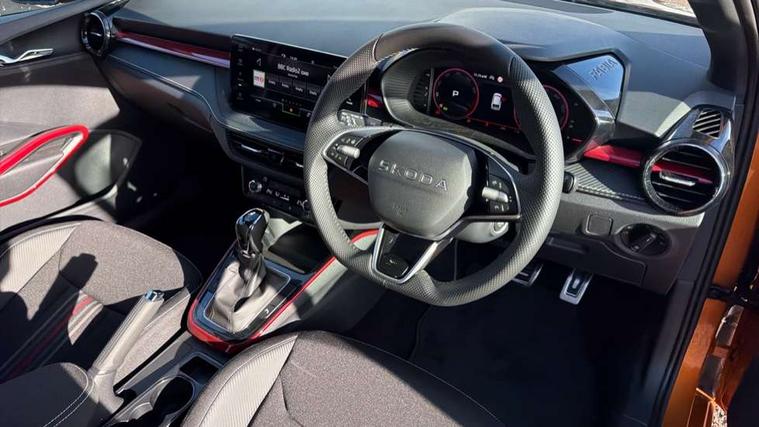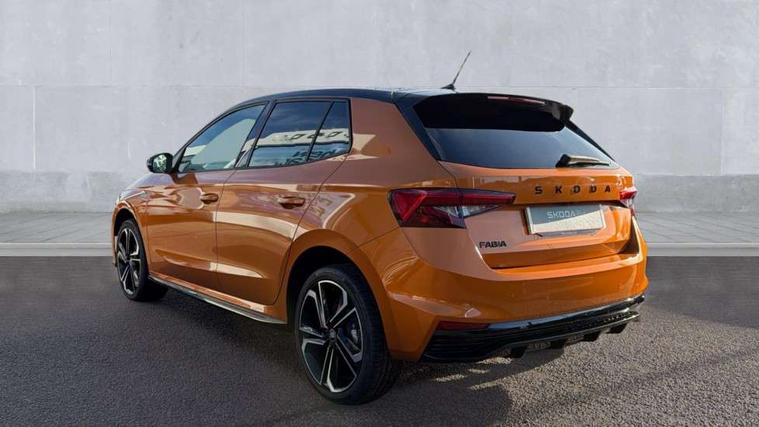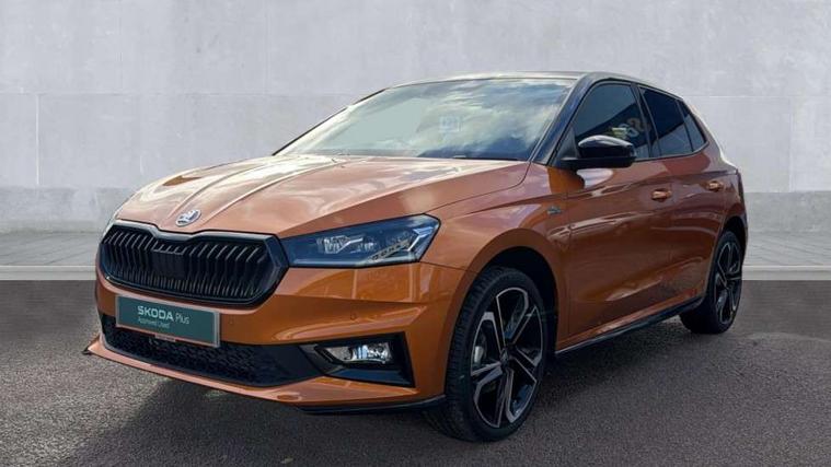Advanced driver attention and drowsiness monitor, Bluetooth connection, Driver alert system, Electromechanical power steering, Exterior temperature gauge, Service interval indicator, Traffic sign recognition, Virtual cockpit with 10.25" colour display, Wireless SmartLink for Apple CarPlay and Android Auto, 6 Speakers (4 in front and 2 in rear), 9.2" colour display skoda navigation system with voice control and web radio, Auxiliary socket for external MP3 player, DAB digital radio reception, Auto dimming rear view mirror, Black radiator grille, Body coloured bumpers, Chrome window surround, Door mirror integrated indicators, Dynamic headlight range control, Front and rear electric windows, Front window wiper intermittent control, Ice scraper in fuel cap, LED 3rd brake light, LED daytime running lights with coming and leaving home feature, LED rear lights, Monte Carlo badging, Privacy glass, Rear LED fog light, Rear side wing doors, Rear window wiper with washing nozzles, Roof mounted spoiler, SKODA tailgate lettering in black, Sports bumpers, Unique dark chrome design logo on alloy wheels, 2 LED reading lights in front and rear, 3 rear headrests, Aluminium pedals, Backrest split and folding, Black headlining, Central console with fixed cup holder and storage box, Chrome handbrake release button, Door sills with fabia badging, Dual zone air conditioning with climatronic electronic control, Fabric/artificial leather upholstery, Front centre armrest, Front sports seats, Gearshift knob/handle in leather, Hand brake lever handle in leather, Height adjustable front headrests, Height adjustable front seats, Height adjustable steering wheel, ISOFIX and TopTether anchorage points to the outer rear seats, ISOFIX and TopTether on the front passenger seat, Luggage compartment lighting, Manually adjustable lumbar support in front seats, Metallic red interior door handles, Pollen filter, Rear seat bench unsplit, Single front passenger seat, Skoda lettering on steering wheel, Sun visors with mirror and airbag label on passenger side, Textile floor mats, Ticket holder, Umbrella in drivers door, Ambient lighting pack - Fabia Hatchback, Convenience pack - Fabia, Light and view pack plus - Fabia, 3-point height adjustable front seats belts with pretensioner and force limiter, Automatic warning lights in case of crash, Driver and passengers airbag with switch off function, e-Call+, ESC including ABS, MSR, ASR, EDS, HBA and XDS, Front and rear seat belt warning, FRONT ASSIST (AEB City and AEB Inter Urban), Front side airbags, Head airbags, Hill hold control, One tone horn, Pedestrian protection, Three rear 3-points safety seat belts with pretensioner and force limiter including stop function for outer rear seat belts, Tyre pressure monitoring system, Anti-theft alarm system including immobiliser, interior monitoring, backup horn, and towing protection, Central locking with radio remote control, interior controls, SAFE function and 2 foldable keys, Carbon effect door and side trim panels, Carbon effect lower decorative trim with white stitching, Grain satin black central console cover, Monte carlo air vents, Red metallic upper decorative trim, Anti-theft wheel bolts protection, Super-low rolling resistance tyres,