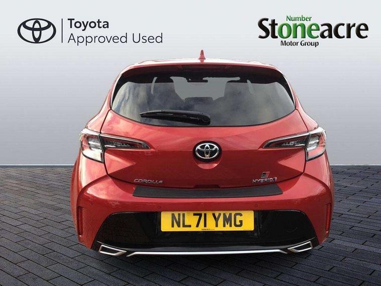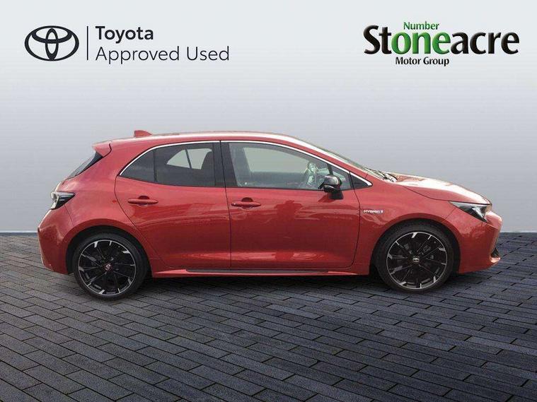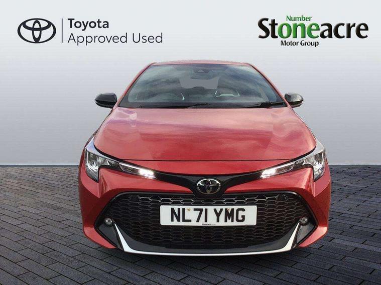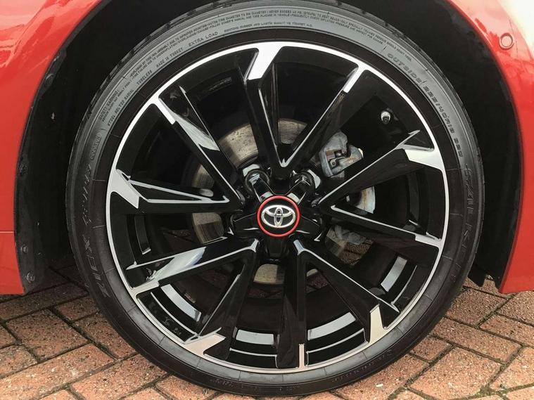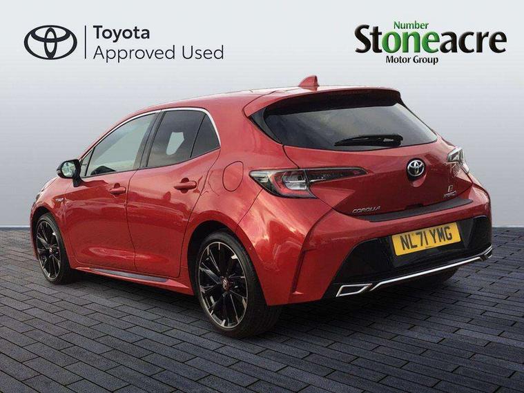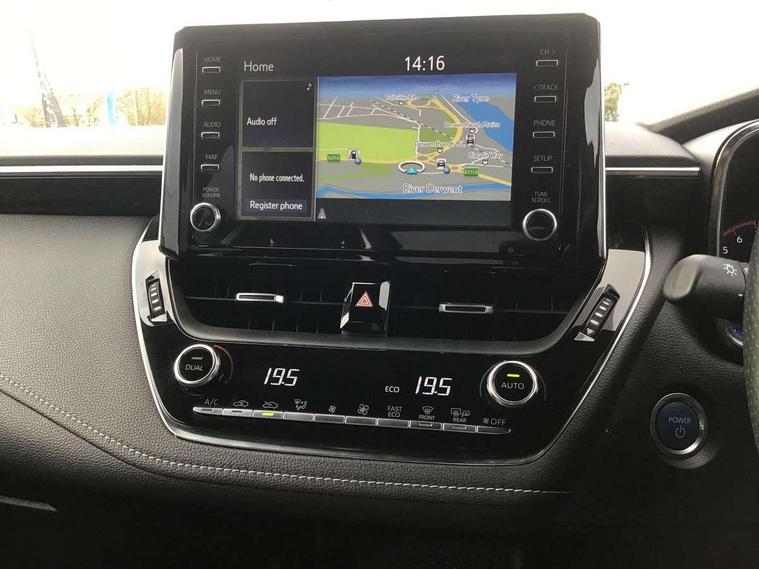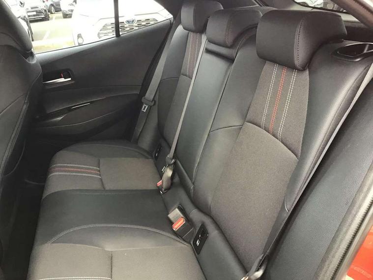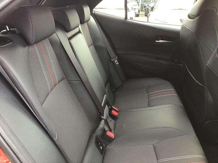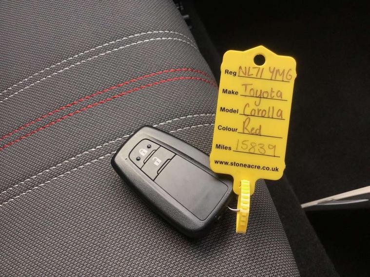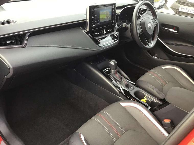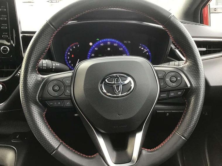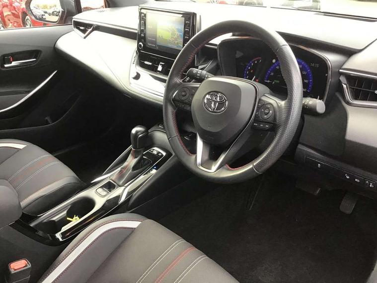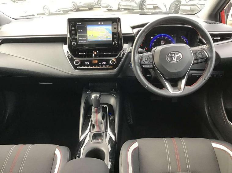 7" Multi information display screen, Bluetooth telephone connectivity, Connected car functionality upgrade, tracker, remote status and e-care, Dynamic radar cruise control (with RSA) including switch on steering wheel, E-call, Electrically assisted power steering, EV drive indicator, Head up Display, Intelligent park assist, Lane Departure Alert (LDA) switch on steering wheel, Memory on adjustable speed limiter, Push button start, Reversing camera, Smartphone integration with Apple CarPlay and Android auto, Gasoline particulate filter, Vehicle Stability Control (VSC), 6 speakers, 8" Touchscreen with MM19 Multimedia system and voice recognition, AM/FM radio, DAB Digital radio, Toyota touch 2 with go navigation system, USB and Aux in connectors + 12V front outlet, Anti-jam protection on power windows, Auto dimming inside rear view mirror, Auto up and down function on all power windows, Automatic folding mirrors, Automatic headlights with high beam assist, Black toyota logo in front, Black window frames, Body colour rear spoiler, Body coloured bumpers, Body coloured door mirrors, Body coloured outside door handles, Follow me home headlights, LED daytime running lights, LED front fog lights, LED Headlights, LED High mounted stop light, LED rear combi lights with LED lightguide, Piano black surround on lower front grille with dark chrome mesh effect, Power adjustable heated door mirrors, Power front windows, Power rear windows, Privacy glass, Rain sensing wipers, Rear bumper with satin chrome plated inserts, Rear window defogger, Rear window wiper, Reverse tilting door mirrors, Shark fin antenna, Time adjustment on intermittent wiper, Turning signal integrated indicators in door mirrors, Unique lower skirt, Unique side rocker with black insert, UV-filter on driver and passenger windows, 3 rear headrests, 3 spoke leather steering wheel + gear knob, 60/40 split folding rear seat, Adjustable speed limiter switch on steering wheel, Alcantara/partial leather upholstery, Audio, multimedia and telephone switches on steering wheel, Boot light, Centre room light, Clean air filter, Driver and front passenger personal light, Driver and passenger assist grip, Driver and passenger seatback pockets, Driver and passenger sun visor with mirror and light, Dual zone automatic air conditioning with ECO mode switch, Fabric armrests, Front and rear cup and bottle holders, Front door pockets, Front head restraints, Heated driver and front passenger seats, Illuminated entry system in room lamp, ISOFIX seat fixing (2 fixings on rear outer seats), Leather gear shift with satin chrome on gear shift console, Manual height adjustable for driver and front passenger seat, Parcel shelf, Pollen filter, Power adjustable lumbar support on driver seat, Power window switches with satin chrome inserts, Rear armrest with 2 cupholders, Rear passenger coat hooks (2), Satin chrome inside door handles, Shopping bag hooks in luggage compartment, Sliding armrest on centre console box, Slow opening glovebox with lights, Sports seats, Tilt/telescopic steering column, Voice recognition switch on steering wheel, Whiplash Injury Lessening (WIL) feature (active headrest) for seats, Parking pack - Corolla, Toyota safety sense 2 pack - Corolla, 3x3 point rear seatbelts, Adjustable driver and front passenger seat belt extender to top anchor point, Anti lock braking system + Electronic brake force distribution, Brake assist function, Downhill Assist Control (DAC), Electronic parking brake, Emergency brake light signal (EBS), Front passenger airbag on/off switch, Front seatbelt reminder, HAC-Hill-start Assist Control, Rear seat belt reminder, Seatbelt pretensioners and force limiters, Supplemental restraint system (SRS) 7 airbags - dual driver, dual side curtain, side impact and driver knee airbags, Traction control, Tyre pressure warning system, Acoustic vehicle alert system (AVAS), Alarm with motion sensor and immobilizer, Remote central locking + deadlocks, Smart entry, Satin chrome dash trim, Soft touch texture on upper dashboard, Tyre repair kit, Unique wheel finish with red wheel cap,