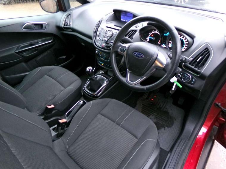 5" Colour screen, Easy fuel capless refuelling system, Navigation system, PAS, SYNC emergency assist and Ford SYNC Bluetooth connection with voice control and USB port, Trip computer, 6 speakers, Aux-in socket, DAB radio/CD player, MP3 connection, Remote audio controls on steering wheel, Body colour bumpers with black rubbing strip, Body colour door handles, Body colour grille with chrome surround, Body colour tailgate handle, Body coloured door mirrors, Chrome beltline trim, Chrome finish on upper door line, Courtesy headlamp delay, Door mirror integrated indicators, Electric adjustable door mirrors, Electric front and rear windows + one touch + global open/closing, Front fog lamps, Front intermittent wash wipers, LED daytime running lights, Quickclear heated windscreen, Rear wiper, Sliding rear side doors, 3 rear headrests, 3 spoke leather steering wheel, 60/40 split rear seat back, Air conditioning, Ambient interior lighting, Centre console with stowage tray/bottle holder/CD stowage/front and rear 12V power point, Child observation mirror, Courtesy lights with map reading light, Driver sunglasses holder, Extendable load floor, Fold flat passenger and rear seat, Front headrests, Glovebox illumination, Height adjustable driver's seat, Isofix standard child seat restraint mounting, Leather trimmed gearknob, Map pocket on driver seat back, New York cloth upholstery, Reach + rake adjustable steering column, Rear tilting/removable parcel tray, Satin chrome interior door handles, Tie down hooks, Variable boot floor, 3x3 point rear seatbelts, ABS + traction control, Deflation detection system, Driver and passenger airbags, Drivers knee airbag, Emergency brake assist, ESP, Front and rear curtain airbags, Front passenger airbag deactivation, Front side airbags, Hill start assist, Intelligent Protection System (IPS), Tyre pressure monitoring system, Warning triangle and first aid kit holder, Immobiliser, Locking wheel nuts, MyKey system, Remote central double locking, 15" 5 spoke alloy wheels,