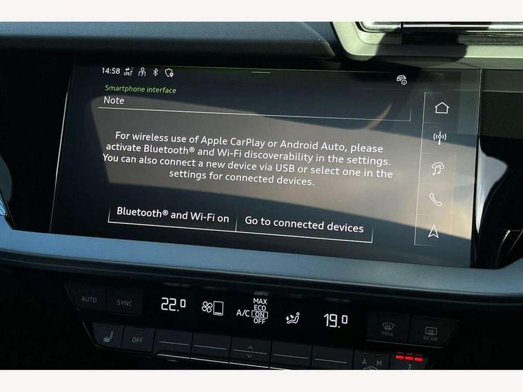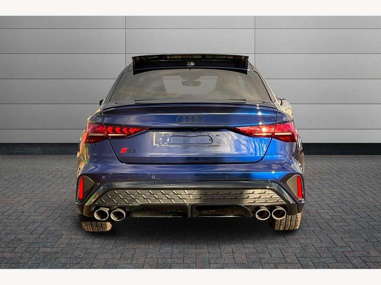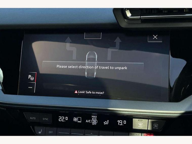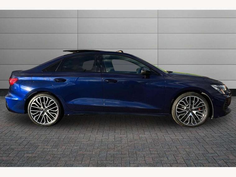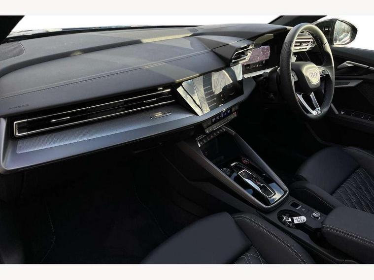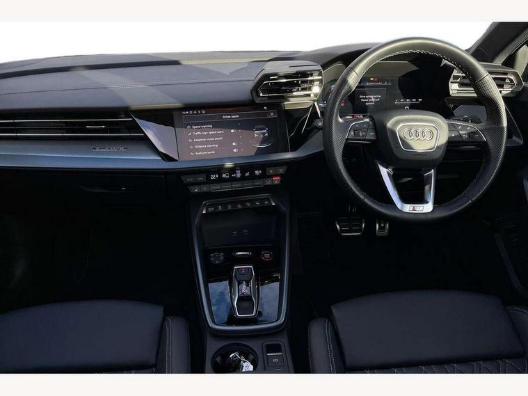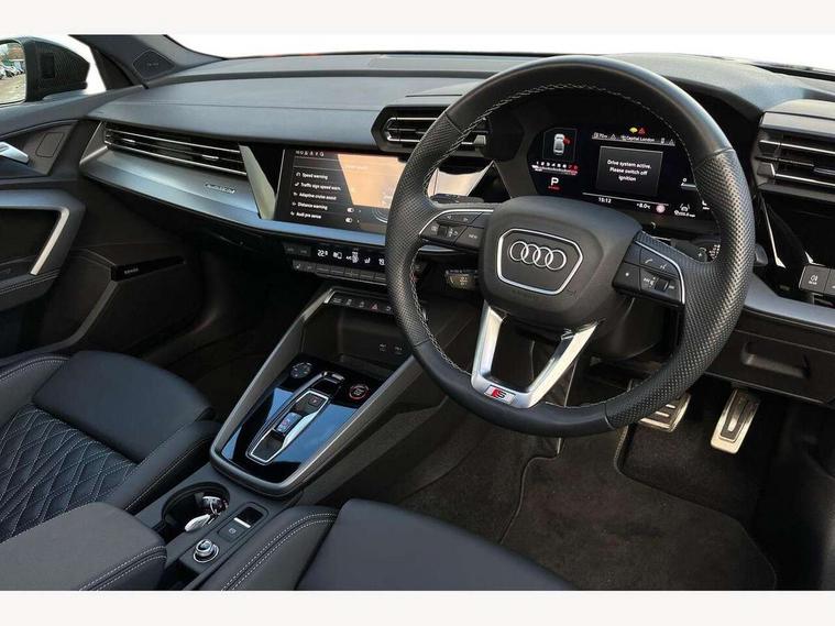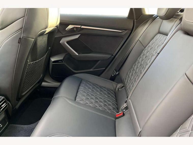 Adjustable speed limiter, Audi drive select, Audi smartphone interface with app store includes wireless Apple carplay, Android auto and Amazon alexa integration, Audi virtual cockpit plus - 12.3" full HD resolution dynamic digital instrument cluster, Automatic start/stop system with recuperation, Bluetooth interface, Camera based traffic sign recognition, Collision avoidance assistant, Distraction and Fatigue warning, e-Call (emergency call), Electromechanical power speed sensitive steering, Lane departure warning system, MMI Navigation Plus with high resolution 10.1" colour touch screen display, Park Assist with parking system Plus, Progressive steering, Service indicator, Trip computer, Voice control system with natural language interaction, S suspension with damper control, Audi Phonebox light with wireless charging, DAB Digital radio, USB ports with charging function in the rear, 3rd brake light, Anthracite grey Audi rings (front and rear), Audi Beam uses LEDs to project Vorsprung onto the ground as you exit your S3, Auto dimming frameless rear view mirror, Black accents front and rear bumpers including air inlets, Black accents in front grille and frame, Black accents window trims strips, Carbon door mirror housings, Electrically adjustable/heated/folding/auto dimming door mirrors with integrated LED indications + kerb view function for passenger side, Exterior model badging, Front electric windows, Headlight washers, Heat insulating glass windscreen, Illuminated door sills with aluminium inserts at the front with S logo, LED daytime running lights, Light and rain sensors, Privacy glass - dark tinted rear window, rear door and side windows, Rear boot, Rear electric windows, Rear side wing doors, S grille, S3 front bumper with S specific air intake grilles, 12V socket and storage compartment in front centre console, 3 seat bench in 2nd row, 3 spoke leather multifunction steering wheel with gear shift paddles, 3-zone deluxe automatic air conditioning, 4 way electrically adjustable lumbar support for driver and front passenger, 40/20/40 split folding rear seat bench, Black cloth headlining, Fine Nappa leather upholstery with front sports seats S embossed logo, Front and rear centre armrest in artificial leather, Front and rear headrests, Front/rear floor mats, Heated front seats, Height and reach adjustable steering wheel, Manual boot compartment lid, Rear cup holders, S badging on the steering wheel, Seat side bolsters, Single front passenger seat, Stainless steel pedals and front footrest in black, Aluminium interior elements pack - A3, Extended ambient lighting package Pro - S3, Storage package - A3 Saloon, Technology package pro - A3 S Tronic, 3x3 point rear seat belts, Driver and front passenger airbag with passenger airbag deactivation, Electronic Stabilisation Control (ESC) including ABS, ASR and EDL, First aid kit with warning triangle and 2 safety vests, Front side airbags with head airbags and interaction airbag, Hill hold assist, Pre-sense front with pedestrian and cyclist detection, Seatbelt monitoring, Tyre pressure loss indicator, Anti theft alarm, Anti-theft wheel bolts, Electronically operated child locks, Immobiliser, Remote central locking with safelock, Dash & door inlays in carbon atlas structure, 19" Multi spoke S design gloss turned alloy wheels in anthracite black,