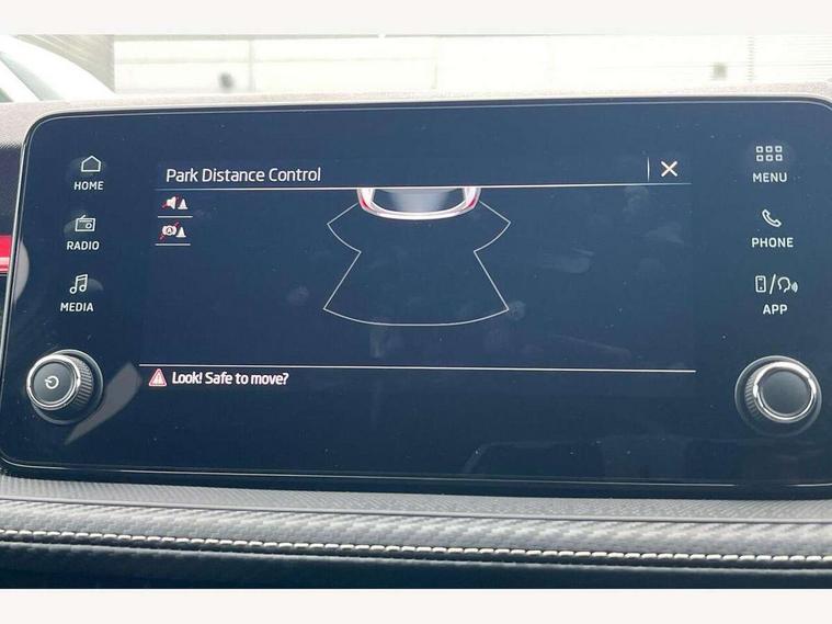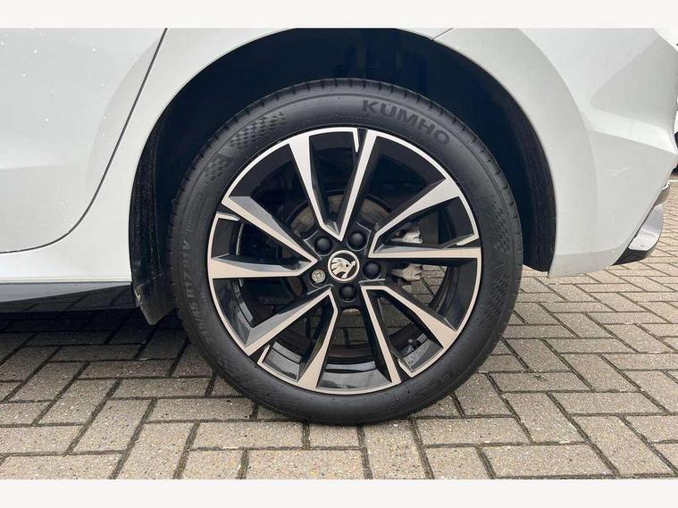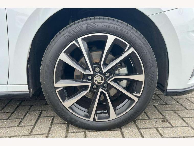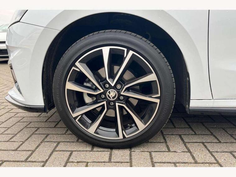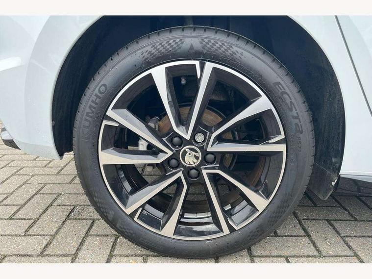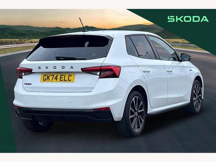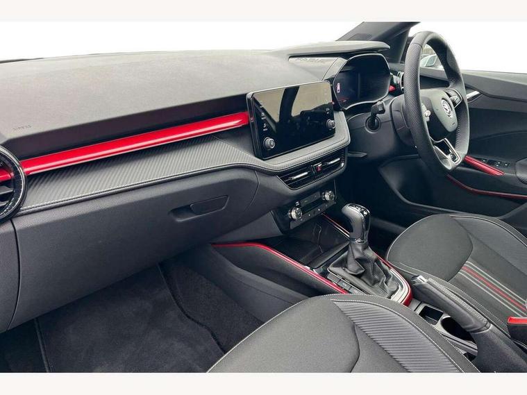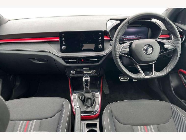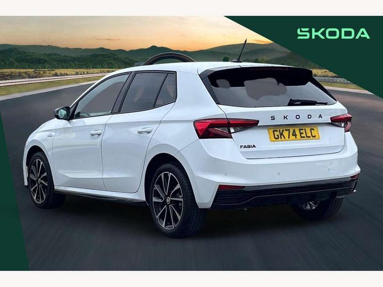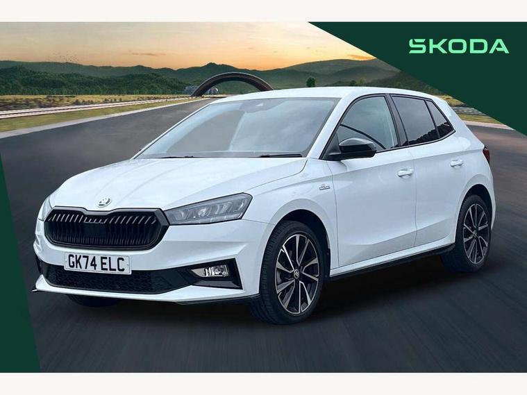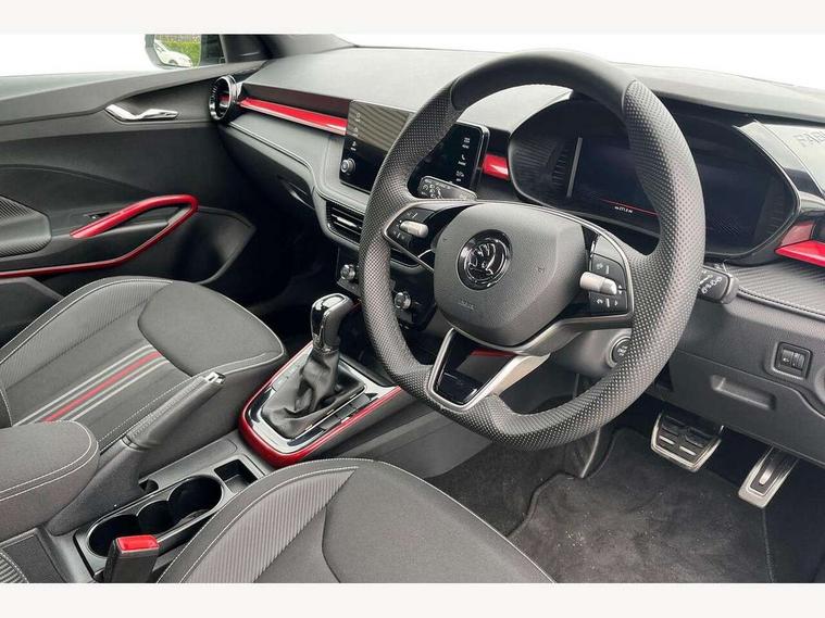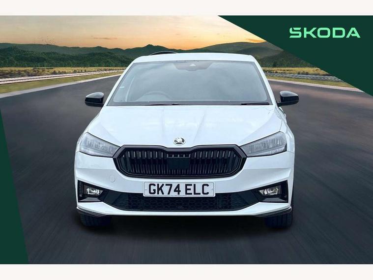 Advanced driver attention and drowsiness monitor, Bluetooth connection, Electromechanical power steering, Exterior temperature gauge, Service interval indicator, Traffic sign recognition, Virtual cockpit with 10.25" colour display, Wireless SmartLink for Apple CarPlay and Android Auto, 6 Speakers (4 in front and 2 in rear), Auxiliary socket for external MP3 player, DAB digital radio reception, Auto dimming rear view mirror, Black radiator grille, Body coloured bumpers, Door mirror integrated indicators, Front and rear electric windows, Front window wiper intermittent control, Headlight range control - Automatic, Ice scraper in fuel cap, LED daytime running lights with coming and leaving home feature, LED rear lights, Monte Carlo badging, Privacy glass, Rear LED fog light, Rear side wing doors, Rear window wiper with washing nozzles, Roof mounted spoiler, SKODA tailgate lettering in black, Sports bumpers, Third brake light, 2 reading lights in front and 2 reading lights in rear, 3 rear headrests, Aluminium pedals, Backrest split and folding, Black headlining, Central console with removable cup holder and storage box, Chrome handbrake release button, Door sills with fabia badging, Dual zone air conditioning with climatronic electronic control, Fabric/artificial leather upholstery, Front centre armrest, Front sports seats, Gearshift knob/handle in leather, Hand brake lever handle in leather, Height adjustable front headrests, Height adjustable front seats, Height adjustable steering wheel, ISOFIX and TopTether anchorage points to the outer rear seats, ISOFIX and TopTether on the front passenger seat, Luggage compartment lighting, Manually adjustable lumbar support in front seats, Metallic painted red central console cover, Metallic red interior door handles, Pollen filter, Rear seat bench unsplit, Single front passenger seat, Sun visors with mirror and airbag label on passenger side, Textile floor mats, Ticket holder, Umbrella in drivers door, 3-point height adjustable front seats belts with pretensioner and force limiter, Automatic warning lights in case of crash, Driver and passengers airbag with switch off function, e-Call+, ESC including ABS, MSR, ASR, EDS, HBA and XDS, Front and rear seat belt warning, FRONT ASSIST (AEB City and AEB Inter Urban), Front side airbags, Head airbags, Hill hold control, One tone horn, Pedestrian protection, Three rear 3-points safety seat belts with pretensioner and force limiter including stop function for outer rear seat belts, Tyre pressure monitoring system, Anti-theft alarm system including immobiliser, interior monitoring, backup horn, and towing protection, Central locking with radio remote control, interior controls, SAFE function and 2 foldable keys, Carbon effect door and side trim panels, Carbon effect lower decorative trim with white stitching, Monte carlo air vents, Red metallic upper decorative trim, Anti-theft wheel bolts protection, Super-low rolling resistance tyres,