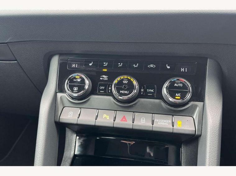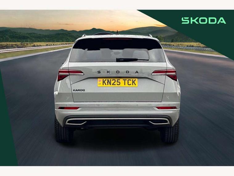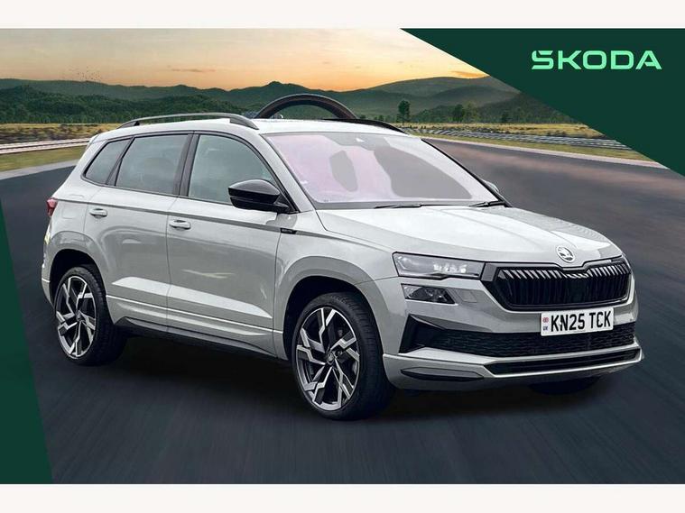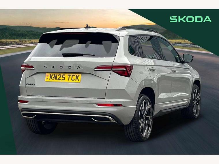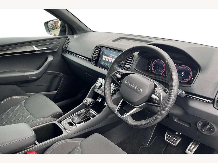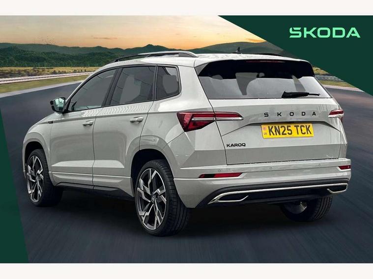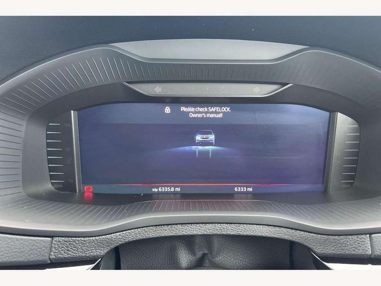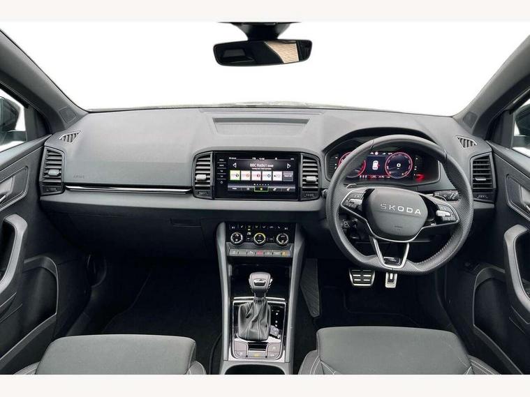 Advanced driver attention and drowsiness monitor, Emergency services call system, Outside temperature gauge, Sensor for driver assistance systems, Service interval indicator, SmartLink wireless for Apple and wired for Android, Start/stop system with regenerative braking, Traffic sign recognition, USB C Port x 2 in front centre console, Virtual Cockpit - 10.25" digital display, Virtual pedal with electrically operated boot door, Wireless smartphone charging, DAB radio with Bluetooth, USB connection, Acoustic glass, Aero front windscreen wipers with intermittent function, Auto dimming rear view mirror with light and rain sensors, Black door mirrors, Black electric window control buttons, Black radiator grille, Black roof rails, Body colour door handles, Electric front and rear windows with child proof lock, Extended rear roof spoiler, Front door steps with SportLine logo, Heated rear windscreen, LED daytime running lights, LED rear lights with high functionality welcome effect and dynamic indicators, Light assistant (coming/leaving home/tunnel light), Panoramic sliding sunroof, Plastic scuff plates in door apertures, Privacy glass, Protective door side sills in body colour, Rear diffuser, Rear side wing doors, Rear window wiper with washer system and intermittent control, Safety reflectors on front doors, Skoda lettering on tailgate in black, Sportline badge on front fender, Sports front and rear bumpers, Third brake light, Unique dark chrome design logo on alloy wheels, 1.5 litre bottle holders in driver and front passenger door panels, 12V socket in boot, 12v socket in front centre armrest with storage compartment and rear air vents, 2 x Tablet holder, 3 rear height adjustable headrests, 3 seat bench in 2nd row, 3 spoke sports leather heated multifunction steering wheel with DSG paddles, 4 foldable roof handles with rear coat hooks, Black floor carpet, Cargo elements in boot, Chrome inner door handles, Foldable hooks in the boot, Front head restraints, Height adjustable front three point seats belts with tensioners, Height/reach adjust steering wheel, Ice scraper, Illuminated glovebox, Illuminated luggage compartment, Isofix child seat preparation for front passenger seat, Isofix child seat preparation outer rear, Manual lumbar support for front seats, Pen holder, Pollen filter, Rear backrest release from boot, Rear boot cover, Rear package tray, Rear reading lights, Rear seats fixed folding and divided 60:40, Rubbish bin door, Safety vest holder, Single front passenger seat, Skoda lettering on steering wheel, Sportline decorative inserts, Storage box in upper central dashboard closed, Sunvisors with illuminated vanity mirrors, Textile floor mats, Ticket holder, Titan black interior ceiling, Umbrella under passenger seat, Under passenger seat storage compartment, Columbus pack - Karoq, LED Interior lighting pack with Skoda welcome logo - Karoq, Light Pack - Karoq, Non Smokers pack, Performance pack - Karoq, Winter plus pack with heated front and rear seats - Karoq, Automatic door unlocking in case of crash, Automatic fuel cut off in case of crash, Driver airbag, Electronic parking brake with auto hold function, Emergency rear braking signal, ESC (incl. ABS+MSR+ASR+EDS+HBA+DSR+RBS+MKB), Front side airbags, Head airbags, Hill hold control, Knee airbags, Passenger airbag with switch-off function, Pedestrian monitor, Seatbelt reminder signalisation and pretensioner for all seats, Three point seatbelts rear, Two tone horn, Tyre pressure monitor, Alarm with interior monitoring, back up horn and tilt sensor with safe function, Electronic engine immobiliser, Keyless entry and start/stop, Remote central locking with 2 remote folding keys, Black air vent surround, Black centre console, carbon door decor, Satin black dashboard, Satin black door trim, 19" Sagittarius anthracite alloy wheels, Anti-theft wheel bolts protection, Breakdown and tool kit,