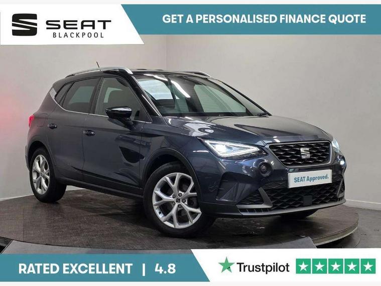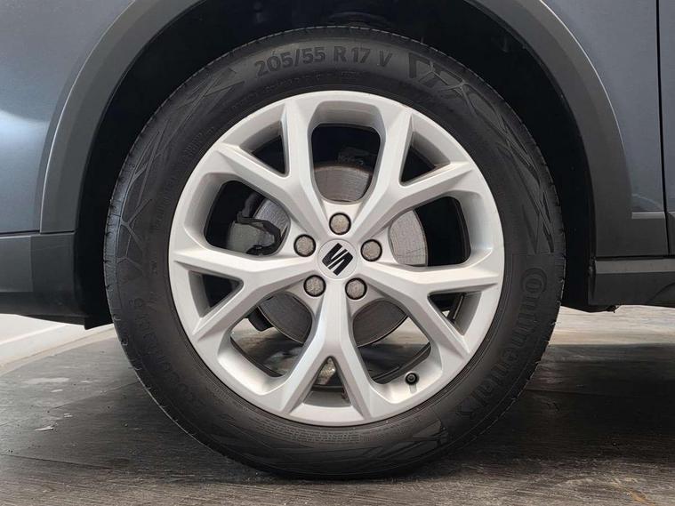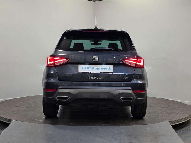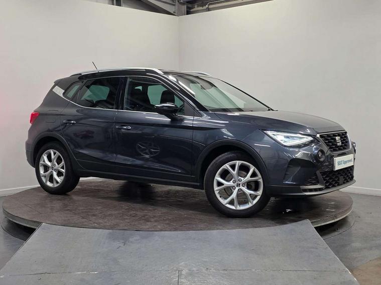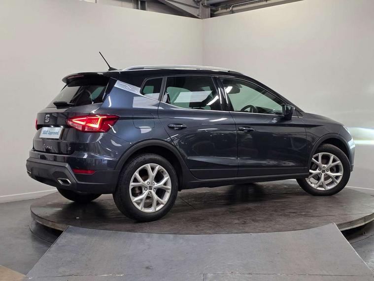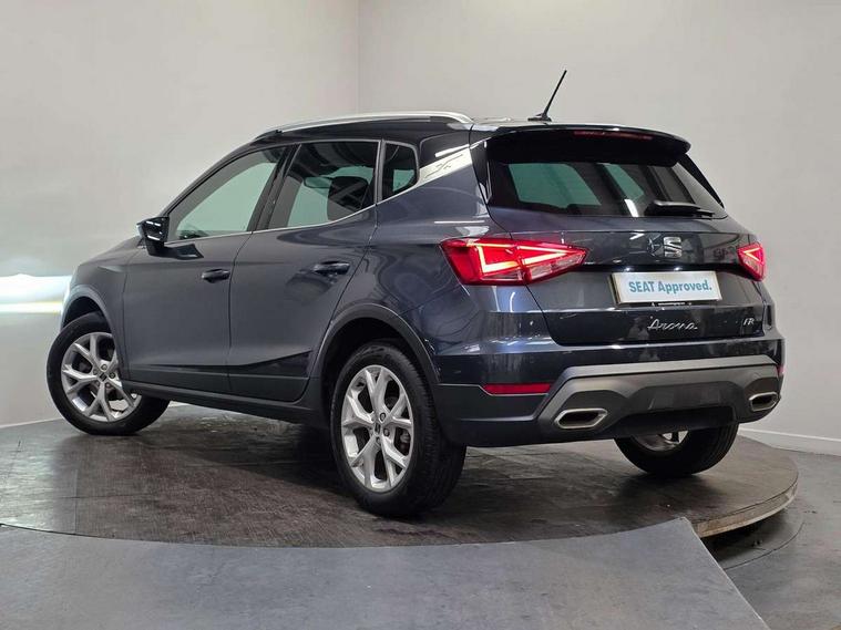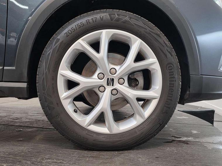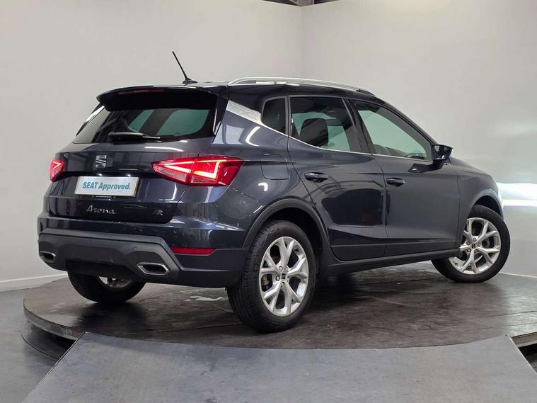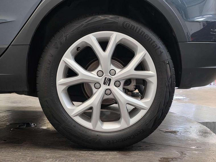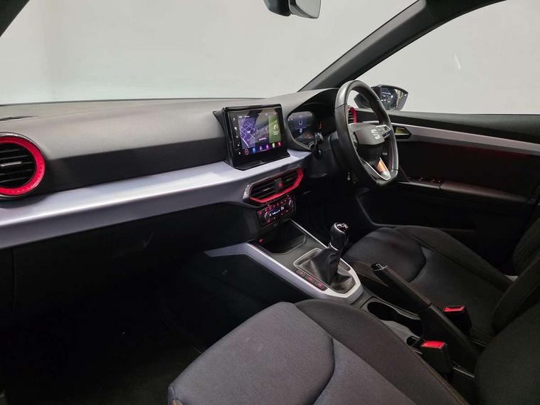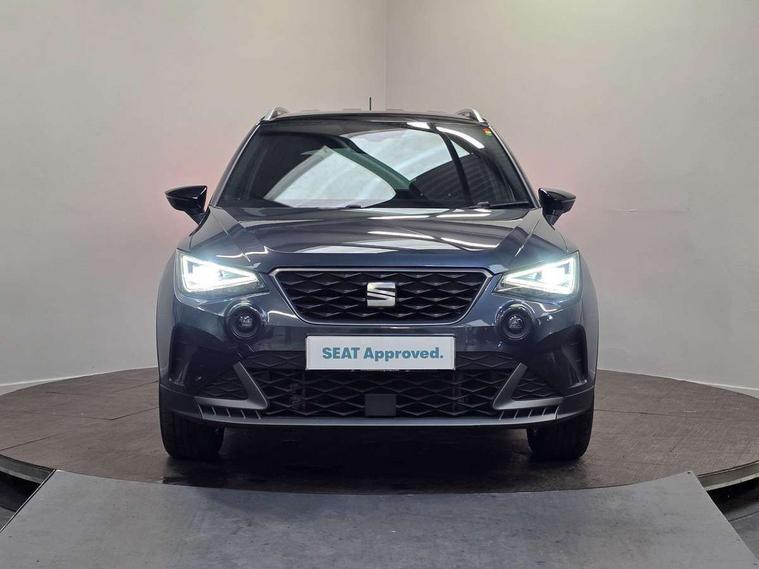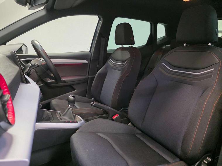 'Lights On' Reminder warning buzzer, 8" Digital cockpit, Digital clock, E-call, Electric speed sensitive power steering, Full Link Smartphone Integration with Mirror Link, Apple Car Play, Google Android Auto with USB Type C cable for Apple and Android compatibility, Lane keeping system, Low fuel warning light, Outside temperature display, Rear parking sensor, RPM counter, Seat connect with safety, service, remote and online, SEAT Drive profile - Four different models normal-sport-eco-individual, steering response, throttle response, Trip computer, Wireless phone charger, 9.2" colour touchscreen with navigation system, voice control and USB port (type c), Bluetooth interface for hands free and audio streaming, DAB digital radio and AM/FM radio, Steering wheel mounted audio controls, Anti theft roof antenna, Auto dimming interior rear view mirror, Automatic activation of hazard warning lights, Body coloured bumpers, Body coloured door handle inserts, Chrome roof rails and window surrounds, Dark tinted rear windows, Electric front/rear windows, Electrically adjustable, heated and folding door mirrors, Front fog lights with cornering function and rear fog light, FULL LED automatic headlights with dynamic headlight range control, coming and leaving home, LED daytime running lights, LED rear tail lights and licence plate lights, Protective side mouldings, Rain sensing wipers, Rear side wing doors, Rear spoiler, Rear window wash/wipe, Roof colour door mirrors, Third brake light, Twin exhaust pipe styling hidden exhaust pipe, Visible VIN plate, Windshield wiper with intermittent control and potentiometer, 2 cupholders, 3 seat bench in 2nd row, 60/40 split folding rear seat, Aircare filter, Black interior roof, Cloth upholstery, Double boot floor, Driver sunvisor with covered mirror + card holder, Dual zone climate control, Front courtesy light with front reading lights, Front sport seats, Gear shift indicator, Height adjustable front seats, Height/reach adjustable steering column, Illuminated boot, Instrument lighting with brightness control, Interior ambient lighting, Interior light in footwell, central console and door panel, ISOFIX points in outer rear seats with top tether anchorage points, Passenger sunvisor with vanity mirror, Perforated flat bottomed leather steering wheel/gear knob/handbrake with red stitching and FR logo, Single front passenger seat, Two front and three rear height adjustable headrests, Interior chrome pack - Arona, 3 point seatbelts on all rear seats, ABS, Active front headrests, Child locks on rear doors, Driver and front passenger airbags with front passenger airbag de activation, front side and curtain airbags, Electronic stability control, Emergency Brake Assist (EBA) and front assist, Front and rear seatbelt reminder, Hill hold control, Multi-Collision braking, Tiredness recognition system, Traction control, Tyre pressure monitoring system, Alarm with back-up horn, Electronic engine immobiliser, Locking wheel bolts, Remote central locking + deadlocks, Tow away protection, Titan black dashboard, 17" Dynamic alloy wheels,