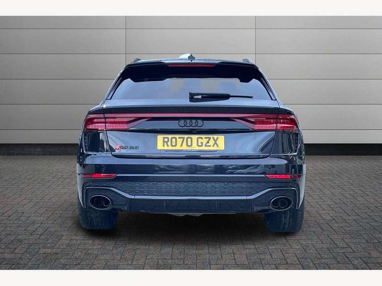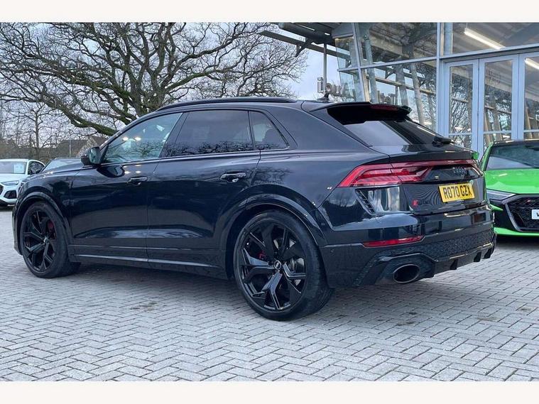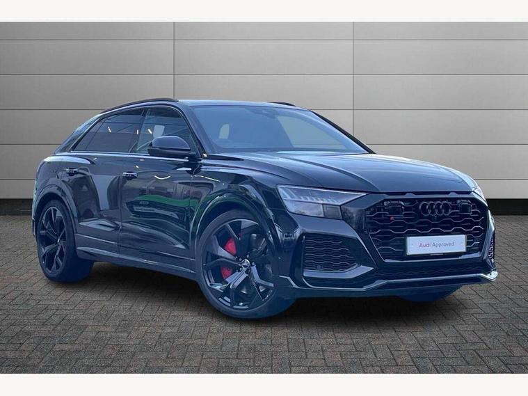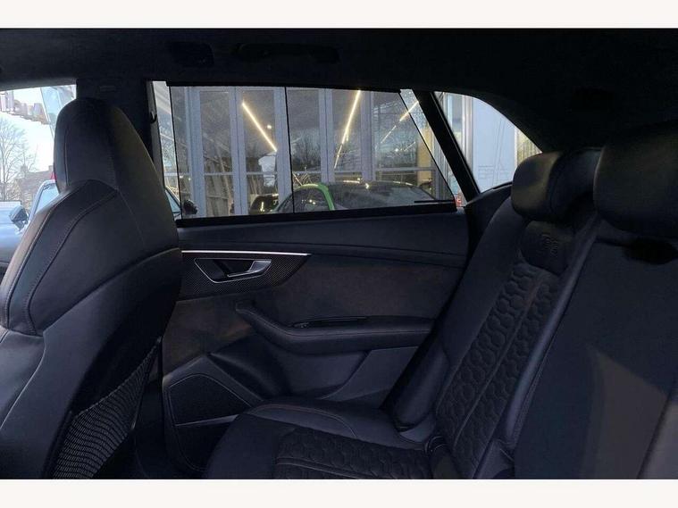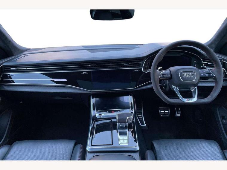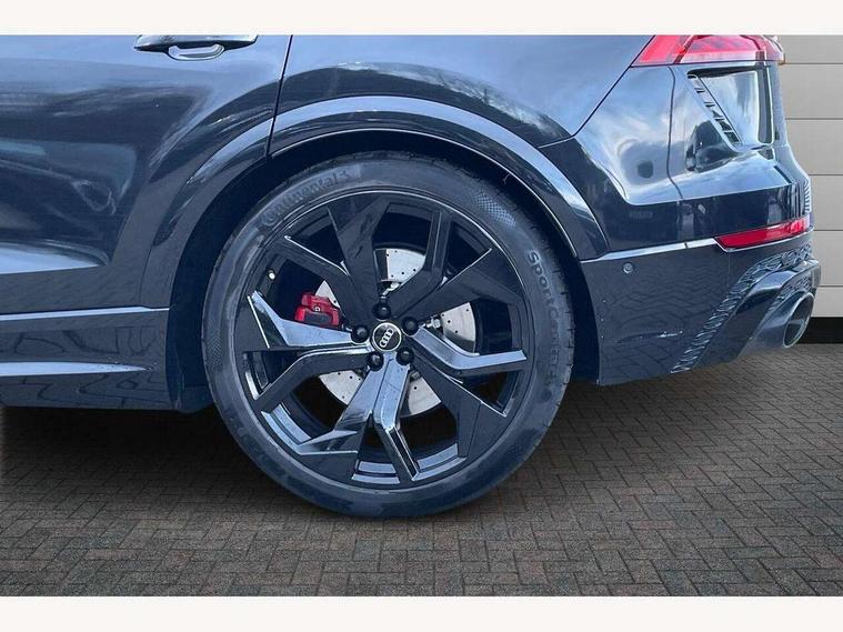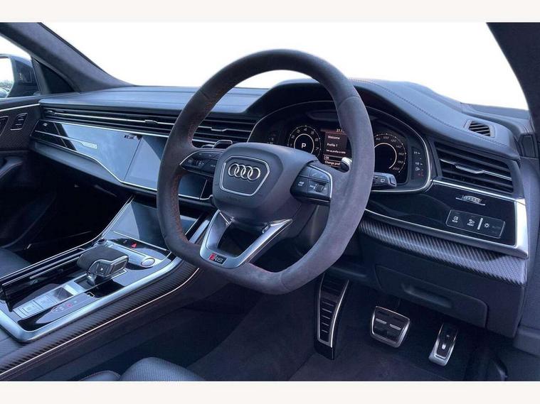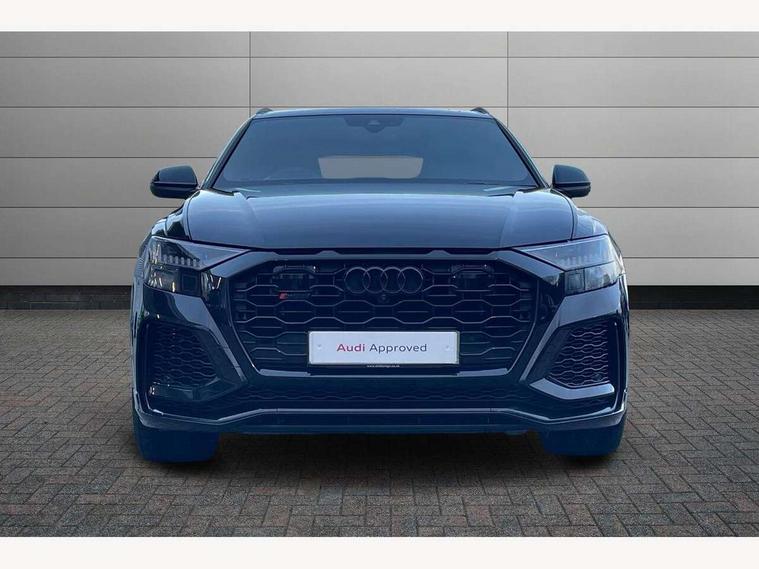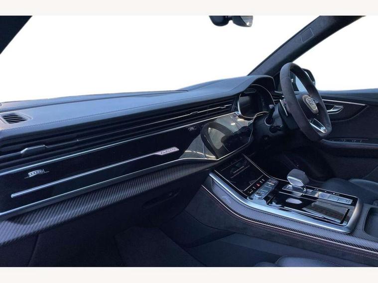 10.1" and 8.6" Dual colour touchscreens, All wheel steering, Audi connect safety and service (e-call), Audi phone box with wireless charging, Audi smartphone interface with wireless Apple CarPlay, Audi virtual cockpit - 12.3" high resolution LCD display with fully customisable instrument cluster and RS specific menus and options, Automatic start/stop system, Electro-mechanical PAS, Head up Display, MMI navigation plus with MMI touch, Natural voice recognition, On board computer, Operating buttons in black, glass look with haptic feedback, Power door closure, Power operated tailgate, RS Audi drive select, Service interval indicator, 48V Mild hybrid technology, Electromechanical active roll stabilisation, Quattro all wheel drive with sport differential, RS specific Adaptive air suspension, Audi music interface with 2 USB ports with charge and data functions, Audi music interface with 2 USB ports with charge and data functions in the rear, Aux-in socket, DAB Digital radio, Adaptive windscreen wipers with integrated washer jets, Audi Beam uses LEDs to project Vorsprung logo, Audi HD Matrix LED headlights in RS specific design with dynamic front and rear indicators, Auto dimming frameless rear view mirror, Electric front+rear windows, Electric panoramic glass sunroof, Electrically adjustable/heated/folding/dimming door mirrors with kerb view includes integrated LED indications + kerb view function for passenger side, Gloss black finish for exterior Audi rings and RS Q8 logo, Headlight washers, Heat insulating glass in windshield, Illuminated door sill trims with RS logo, LED signature daytime running lights, Privacy glass - dark tinted rear and rear side windows from B-pillar backwards, Rain and light sensors, Rear wiper, RS badges on front wings, RS coming/leaving home animations in front and rear, RS manhattan grey front spoiler lip and rear diffuser insert, RS specific bumpers in full body colour paint finish, RS sport exhaust system with black exhaust tips, 4 zone automatic climate control, 4-way lumbar support for front seats, 40:20:40 split folding rear bench seat, Black Alcantara headlining, Comfort front centre armrest, Double sun visor with illuminated vanity mirror on driver and passenger side extendable, Driver and front passenger seat memory function for electrically adjustable front seats, Electric adjustable steering column with memory functionality, Electric sunblind for the rear side windows and manual sunblind for the rear window, Front and rear head restraints, ISOFIX child seat mounting for front passenger seat and 2 outer rear seats with top tether child seat mounting for all 3 rear seats, Luggage compartment sill protection in stainless steel, Massage and ventilation function for front seats, Perforated Valcona leather upholstery + RS front super sports seats + honeycomb pattern with RS embossed logo, Rear seat bench plus, Stainless steel pedals, Tool kit, Air quality package - RS Q8, City assist pack - Q8, Comfort and sound pack - RS SQ8, Multi-coloured extended LED interior lighting pack - RS Q8, RS specific styling pack - RS Q8, Titanium black styling pack - RS Q8, Tour pack - Q8, 3 point seatbelts on all seats, Audi pre sense front, Driver and front passenger, front side and curtain airbags, Electromechanical parking brake, Electronic Stability Control (ESC) including ABS, ASR and EDL, Hill descent control, Hill hold assist, Predictive pedestrian protection, Seatbelt monitoring, Tyre pressure loss indicator, Warning triangle and first aid kit, Advanced key, Anti theft alarm with tow away protection, Anti-theft wheel bolts and wheel loosening detection, Immobiliser, 23" x 10.5J 5 Y spoke rotor design Audi sport alloy wheels in gloss anthracite black with diamond finish, Tyre repair kit,