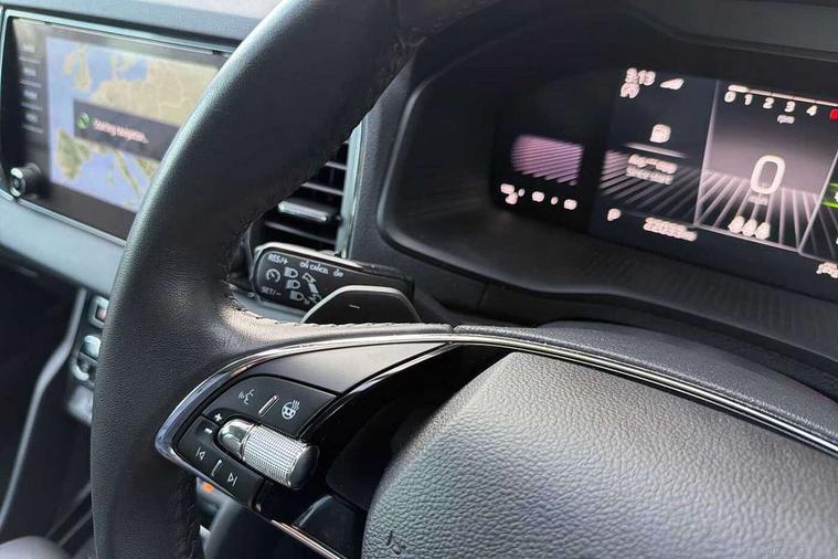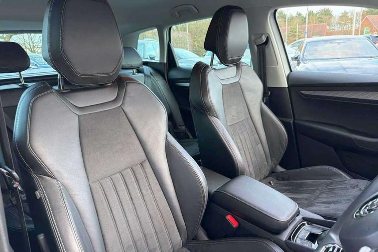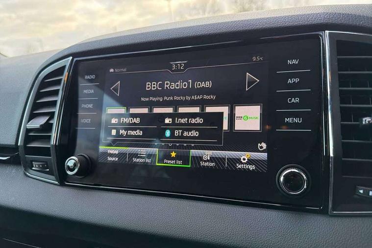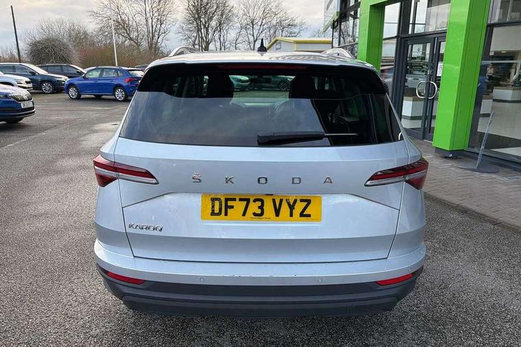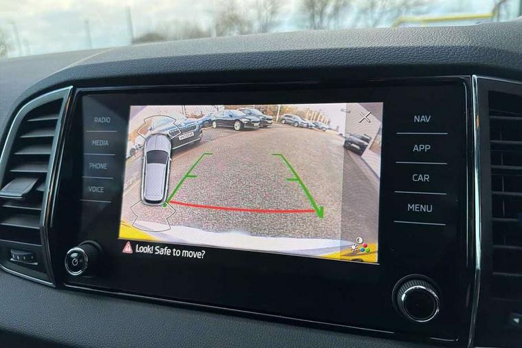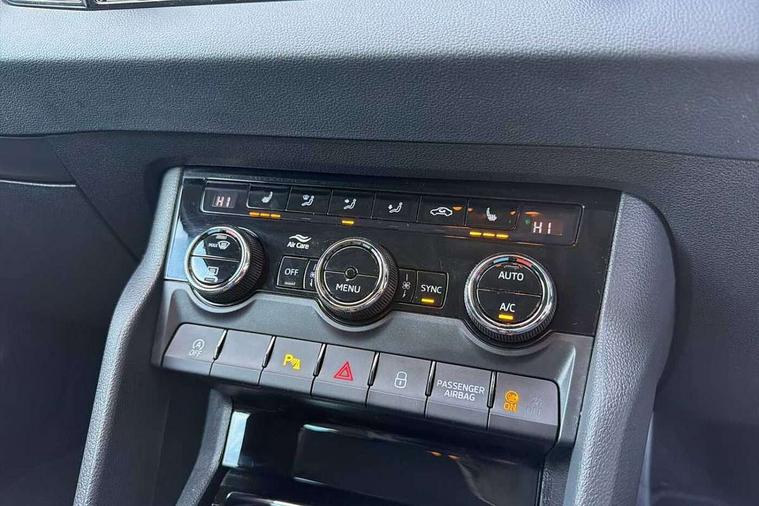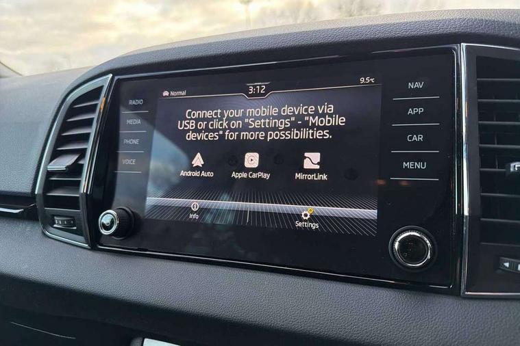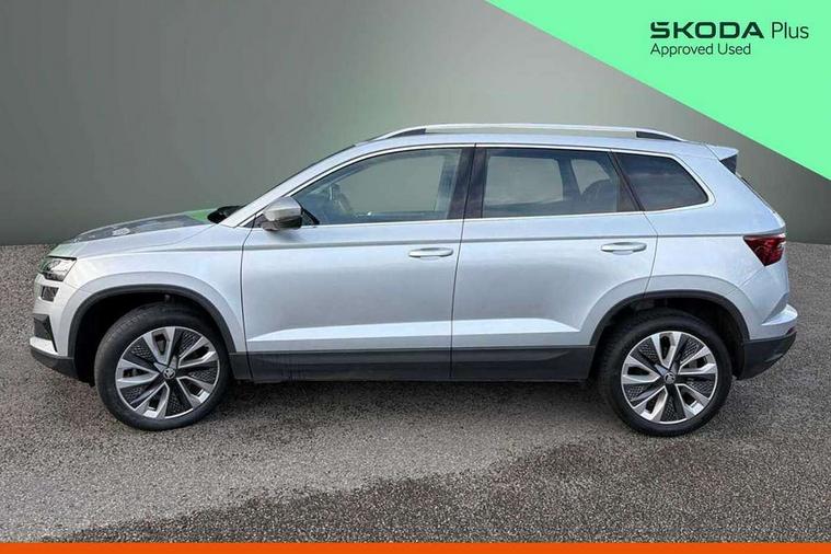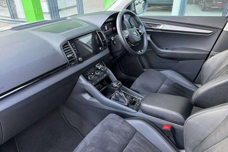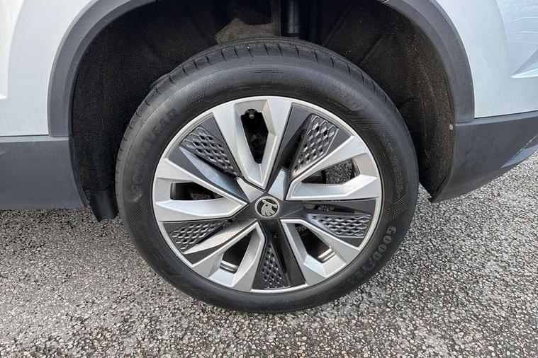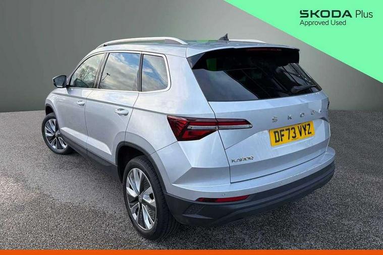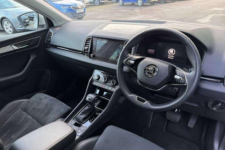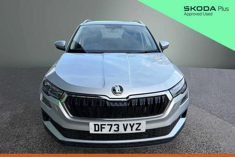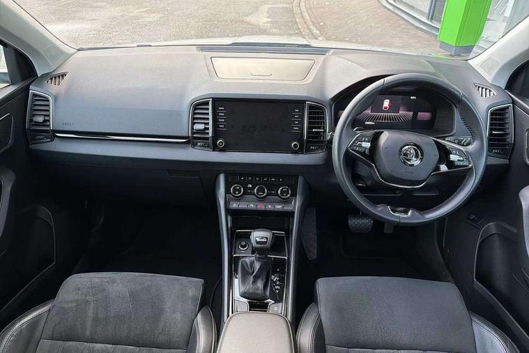 8" Digital display, Care connect, Driver fatigue sensor, Emergency services call system, Outside temperature gauge, Service interval indicator, SmartLink wireless for Apple and wired for Android, Start/stop system with regenerative braking, USB C Port x 2 in front centre console, 8 Speakers, DAB radio with Bluetooth, USB connection, Acoustic glass, Aero front windscreen wipers with intermittent function, Auto dimming rear view mirror with light and rain sensors, Black electric window control buttons, Body colour door mirrors and handles, Dynamic headlight range control with cornering light function, Electric front and rear windows with child proof lock, Heated rear windscreen, LED daytime running lights, LED rear lights with high functionality welcome effect and dynamic indicators, Light assistant (coming/leaving home/tunnel light), Plastic scuff plates, Privacy glass, Rear side wing doors, Rear spoiler, Rear window wiper with washer system and intermittent control, Safety reflectors on front doors, 1.5 litre bottle holders in driver and front passenger door panels, 12V socket in boot, 12v socket in front centre armrest with storage compartment and rear air vents, 2 spoke leather heated multifunction steering wheel with DSG paddles, 2 x Tablet holder, 3 rear height adjustable headrests, 3 seat bench in 2nd row, 4 foldable roof handles with rear coat hooks, Black floor carpet, Chrome inner door handles, Double sided boot floor, Foldable hooks in the boot, Front head restraints, Height adjustable front three point seats belts with tensioners, Height/reach adjust steering wheel, Ice scraper, Illuminated glovebox, Illuminated luggage compartment, Isofix child seat preparation for front passenger seat, Isofix child seat preparation outer rear, Manual lumbar support for front seats, Pen holder, Pollen filter, Rear boot cover, Rear reading lights, Rubbish bin door, Safety vest holder, Single front passenger seat, Storage box in upper central dashboard closed, Sunvisors with illuminated vanity mirrors, Textile floor mats, Ticket holder, VarioFlex seats with standard rear seat release, Boot pack - Karoq, Design Pack - Karoq, Parking pack - Karoq, Automatic door unlocking in case of crash, Automatic fuel cut off in case of crash, Child locks on rear doors, Driver airbag, Electronic parking brake with auto hold function, Emergency rear braking signal, ESC including ABS, MSR, ASR, EDS, HBA, DSR, RBS, MKB and traction control, Front side airbags, Hill hold control, Knee airbags, Passenger airbag with switch-off function, Pedestrian monitor, Seatbelt reminder signalisation and pretensioner for all seats, Three point seatbelts rear, Two tone horn, Tyre pressure display, Tyre pressure monitor, Alarm with interior monitoring, back up horn and tilt sensor with safe function, Electronic engine immobiliser, Keyless entry and start/stop, Remote central locking with 2 remote folding keys, Chrome framed air vents, 18" Miran alloy wheels in black, Anti-theft wheel bolts protection, Tool kit,