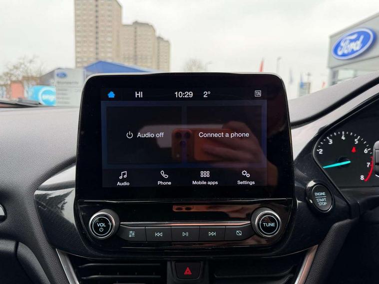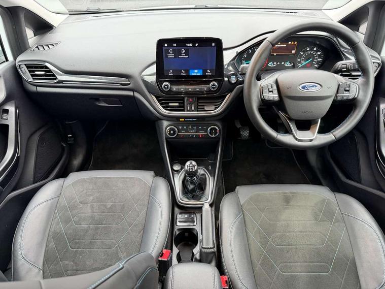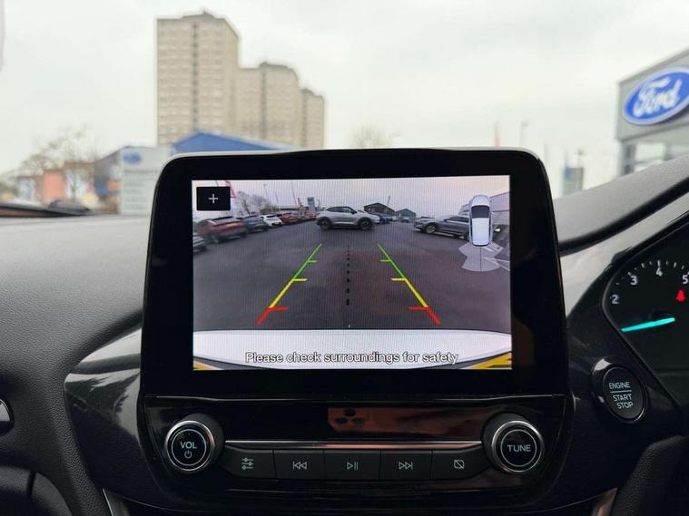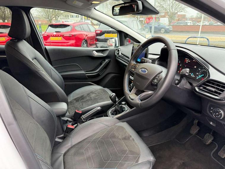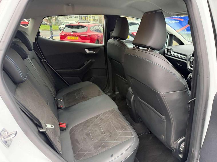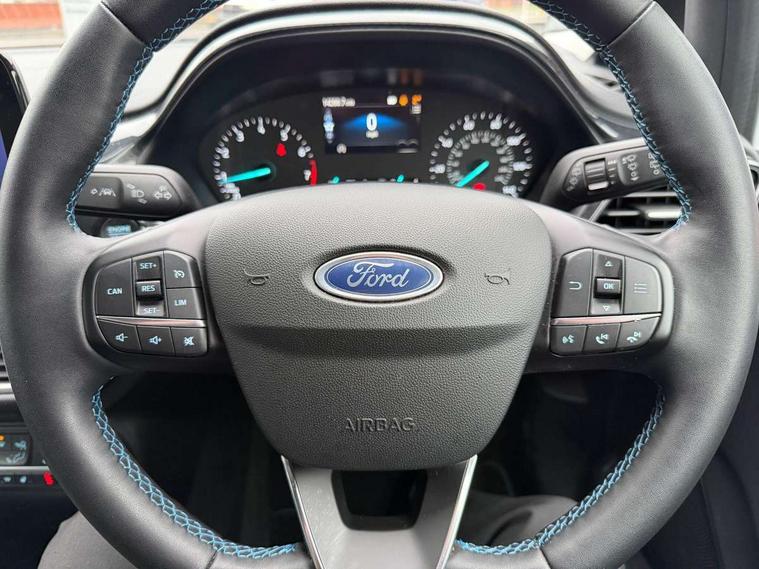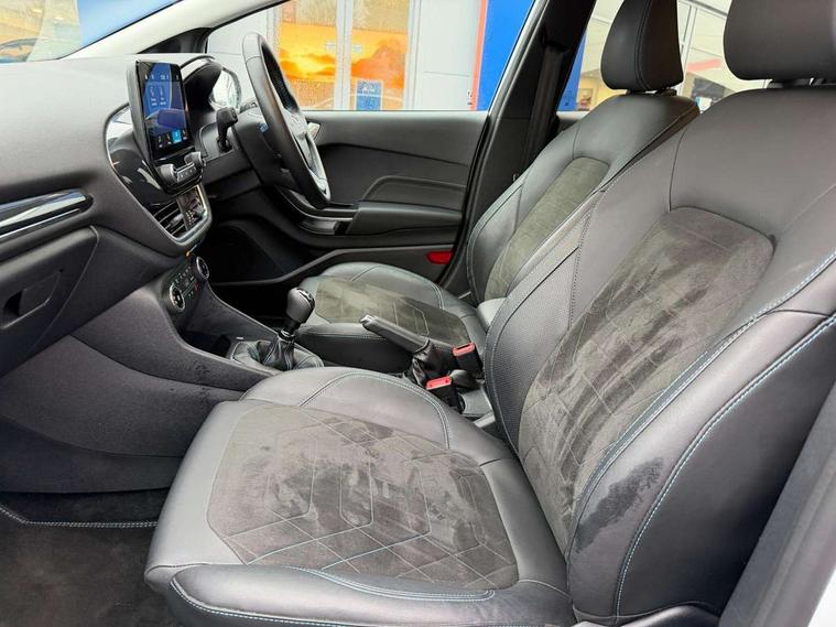 4.2" TFT instrument cluster screen, Bluetooth system, Electric power steering, Extra selectable drive modes ( Trail, Slippery), Ford easy fuel, Rear parking distance sensors, Selectable drive modes (Normal, Sport, Track), Traffic sign recognition, Trip computer, Rough road suspension with increased ride height adjust, 2 USB ports, Auxiliary input socket, B&O Premium audio system with 8" touchscreen, 10 speakers, 360 degree sound system, Ford SYNC 3 navigation system and Ford pass connect, DAB Digital radio, Steering wheel mounted controls, Auto high beam, Body colour bumpers, Body colour door handles, Body colour rear spoiler, Chrome beltline trim, Cornering front fog lights, Electric front windows/one touch facility, Electric rear windows, LED Night signature to rear lights, Mesh design front grille with chrome surround, Power foldable door mirrors with puddle lights, Quickclear heated windscreen, Rain sensing wipers and auto dimming rear view mirror, Rear privacy glass, Rear wiper, Rugged body styling kit with active front wing badges, 3 spoke leather trimmed steering wheel with audio control, 60/40 split folding rear seat, Adjustable head restraints, Boot carpet, Centre console with opening armrest, 2x cupholders, 12v and USB, Chrome inner door handles, Drivers and Passenger lumbar support, EATC - Electronic Auto Temperature control, Footwell illumination, Front floor mats in velour, Front map reading lights, Front seat and rear pockets, Height adjustable passenger seat, Illuminated glovebox, Leather gaiter, LED ambient lighting, Load area light, Manual 4-way driver seat adjust, Overhead console with sunglasses holder, Pollen filter, Rake/reach adjustable steering wheel, Sensico partial premium upholstery, Sensico wrapped steering wheel, NCAP Pack - Fiesta, 3 point seatbelts on all rear seats, ABS+EBA, Curtain airbags, Driver and passenger airbags, Drivers knee airbag, Electronic stability control with hill start assist, Front passenger airbag deactivation, Front side airbags, Seatbelt warning, Two tone horn, Tyre pressure monitoring system, Ford keyfree system with Keyless entry and keyless start, MyKey system, Remote central locking & engine immobiliser, Thatcham Cat.1 alarm, 18" 5 spoke alloy wheels with shadow black machined finish,
