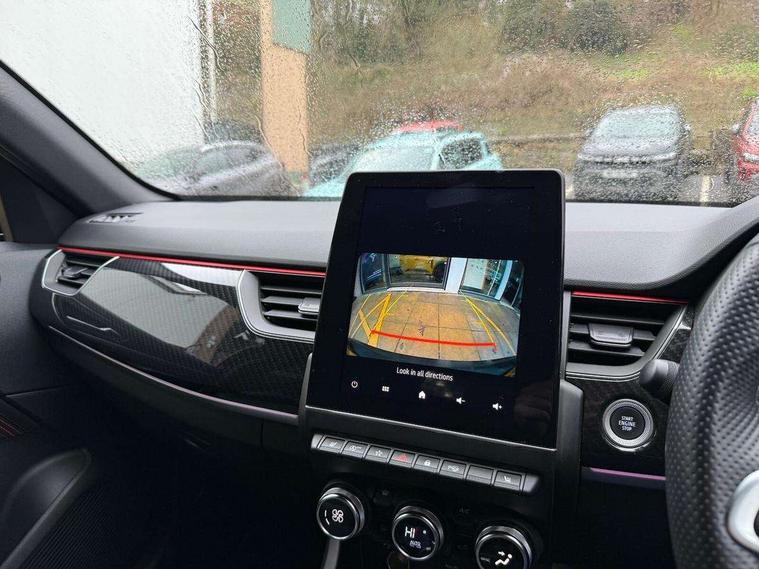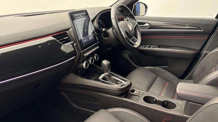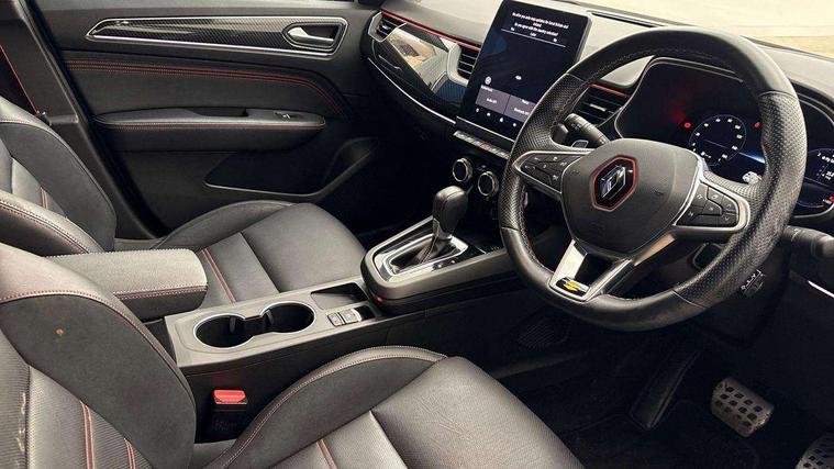 10" TFT Driver information display, Adaptive cruise control and speed limiter, Blind spot warning, Bluetooth system, EASY LINK 9.3" portrait touchscreen with navigation, Google search and traffic information, Eco mode, Front and rear parking sensors, Gear change indicator, Lane departure warning, Lane keep assist, Multi-sense - 3 driving modes and 8 ambient lighting, Rear cross traffic alert, Rear view camera, Renault automatic emergency assist, Smartphone integration compatible with Apple CarPlay and Android Auto, Traffic sign recognition with over speed warning, Trip computer, Variable assistance electric power steering, Wireless phone charger, Arkamys classic sound system with 6 speakers, DAB radio, USB port, 3rd brake light, Auto dimming rear view mirror, Automatic full LED headlights, Automatic headlights, Automatic high / low beam, Automatic windscreen wipers with rain sensor, Black door mirrors, Black side door protection with gun metal insert, Body colour rear boot spoiler, Body coloured bumpers, C-shaped LED front signature lighting (333 high), Chrome decopart on wing (fender molding) with R.S. Line badge, Double chromed exhaust tailpipes elements, Extra tinted rear windows and tailgate, Frameless rear view mirror, Front and rear electric windows, Front bumper with F1 blade and honeycomb front grille, Front driver window with one touch facility and anti-pinch function, Front grille with chrome on upper part, Glossy black door mirror and lower window lining, Gun Metal front and rear skid plates, Heated rear window, R.S. Line badges on front wing and hatch door, Rear windscreen wiper, Shiny black shark fin antenna, 3 seat bench in 2nd row, 60:40 split and fixed base rear seats, Aluminium pedals, Automatic climate control with combined filter, humidity sensor and AQS, Black interior roof lining, Carbon style dashboard, Central console with storage, Front and rear head restraints, Heated front seats, Heated steering wheel, Height and reach adjustable steering wheel, ISOFIX child seat fixing points on rear outermost seats, LED front and rear roof lights, Power adjustable driver and passenger seat with lumbar adjustable drivers seat, R.S. line black suede-leather upholstery with red/grey stiching, R.S. Line perforated leather steering wheel with red/black harmony and R.S. Line badge, Rear air vents, Red inserts on air vents, Single front passenger seat, Variable boot floor, Parking Pack - Hands-free parking & flank protection - Arkana, 3x3 point rear seat belts, ABS+EBA, Active emergency braking system, Distance warning alert, Driver airbag, Driver and passenger front and side airbag deactivation, Driver and passenger side airbags, Driver height adjustable seat belt, Electronic parking brake with auto hold, ESC (Electronic Stability Control), Front and rear no seatbelt warning sound, Front curtain airbags, Front head airbags, Hill start assist, Passenger airbag, Tyre pressure warning light, Anti drill door locks and locking fuel cap, Central door locking, Deadlocking system, Hands free keycard with Keyless access and start, RAID (Renault Anti-Intruder Device) automatic door locking, Rear side wing door and window child locking function (front driver door control panel), Thatcham alarm, 18" Silverstone diamond alloy wheels with red inserts,