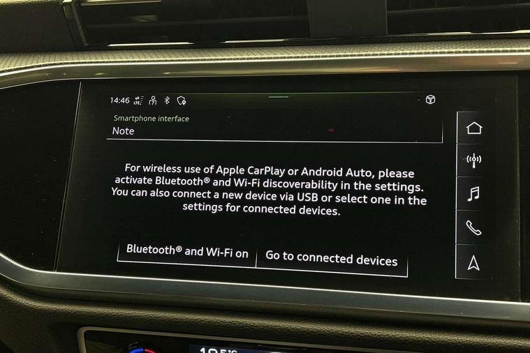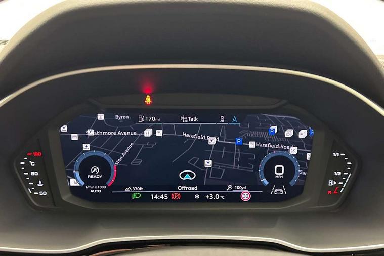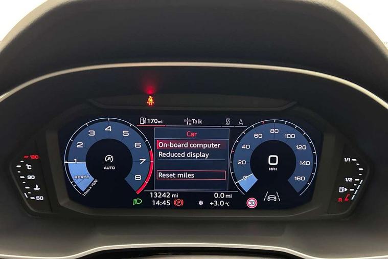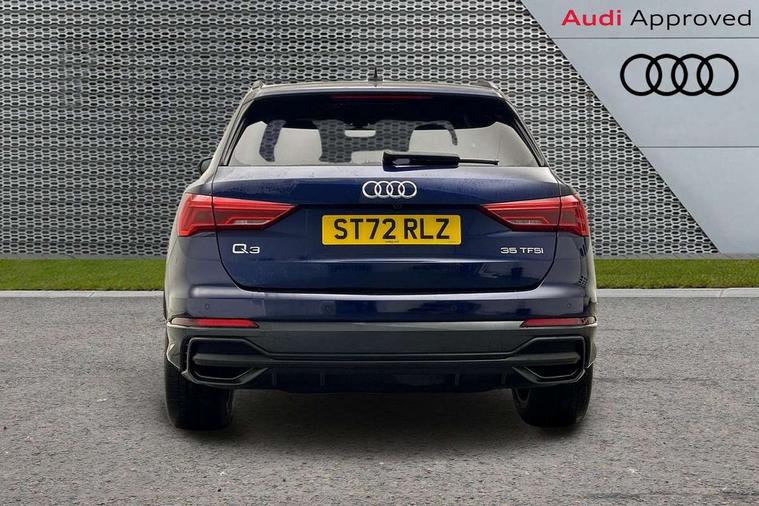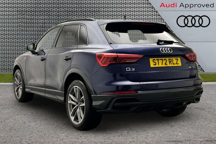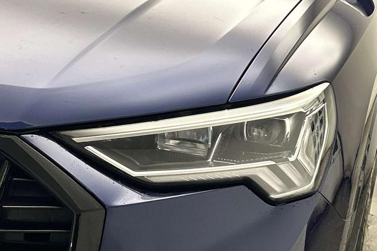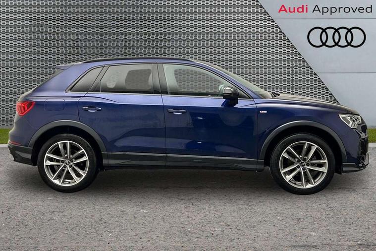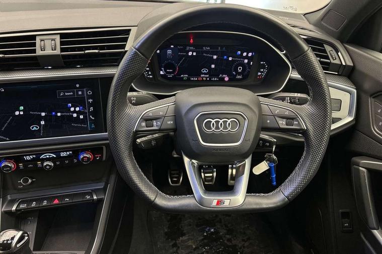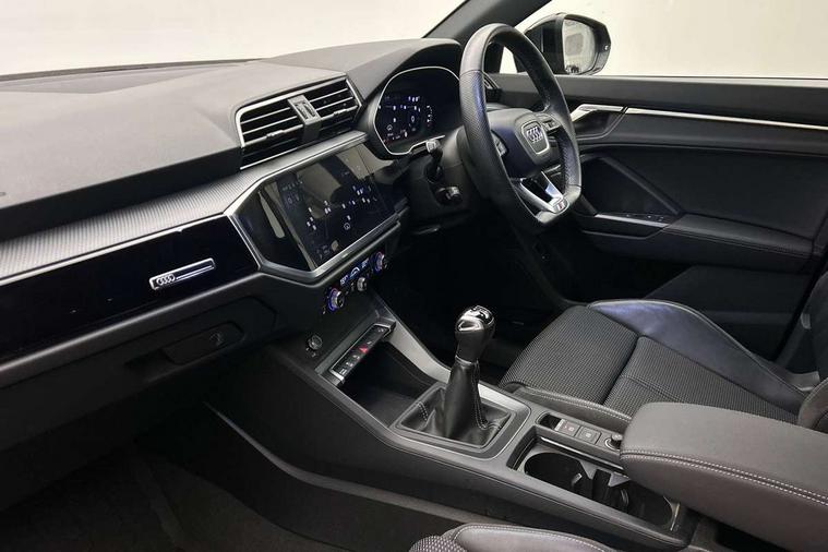 Amazon alexa Integration, Audi drive select, Audi lane departure warning, Audi Virtual Cockpit - 10.25" display, Bluetooth interface, Camera based traffic sign recognition, Cruise control + speed limiter, Legal emergency call, MMI Navigation Plus with high resolution 10.1 inch touchscreen colour display, Power operated tailgate, Progressive steering, Rear parking sensors, Service interval indicator, Smartphone interface includes wireless Apple carplay/Android Auto, Start stop system with recuperation, Voice control system with natural language interaction, Sports suspension, 2 USB-C ports with charge and data functions, 6 passive loudspeakers, DAB digital radio module, Acoustic windscreen, Auto dimming frameless rear view mirror, Black roof rails, Electrically folding, adjustable and heated door mirrors with integrated LED side indicators and kerb view function for passenger side, Front and rear electric windows, Front fog lights, Grille vertical bars in aluminium silver/Matt, High gloss black finish B and C pillars, LED Dynamic rear indicators, LED headlights with LED daytime running lights, LED rear lights, LED third brake light, Privacy glass dark tinted rear and rear-side windows (from B-pillar backwards), Rain and light sensors, Rear diffuser grille in grained matt black, Rear diffuser strip in matt titanium black, Rear side wing doors, Rear wiper, S line bumpers in contrasting Manhattan grey, Variable front intermittent wipers, 12V socket in rear centre console, 3 seat bench in 2nd row, 3 spoke flat bottomed multi-function leather sport steering wheel, 40:20:40 folding with manual adjustment for 60:40 forwards/backwards position and backrest angle, Adjustable rear seat bench/backrest with centre armrest and cupholder, Black cloth headlining, Dual zone electronic climate control, Front and rear black floor mats with contrast stitching in rock grey, Front and rear headrests, Front and rear roof module including reading lights, Front centre armrest, Glove compartment lighting, Height and reach adjustable steering wheel, Illuminated door sill trims with S logo, ISOFIX child seat mounting for front passenger with airbag deactivation and outer rear seat including top tether attachment point for outer rear seats, Luggage compartment light, Manual front seats with height adjustment, Perforated leather gearknob, Single front passenger seat, Stainless steel luggage compartment sill finisher, Stainless steel pedals, Ambient lighting pack - Q3, Black styling pack - Q3, Non smoking pack - Q3, 3x3 point rear seatbelts, 6 airbags - Driver, front passenger, curtain and side windows, Audi pre-sense front with pedestrain and cyclist recognition, Electrically operated child locks on rear doors, Electromechanical parking brake, Electronic stabilisation control including ABS, ASR and EDL, Front seatbelt reminder, Hill descent control, Hill hold assist, Pre sense basic, Seatbelt monitoring, Tyre pressure warning, Warning triangle and first aid kit, Anti theft alarm, Anti theft wheel bolts, Immobiliser, Remote central locking, Detail dashboard around MMI touch colour display in glass look, black with surround in aluminium look, Leatherette door armrest, Piano black inlay,