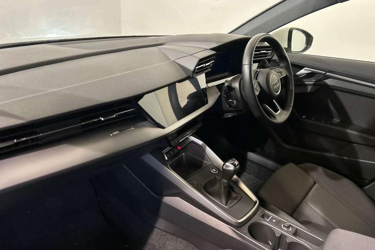 Audi drive select (Auto, Comfort, Dynamic, Efficiency and Individual), Audi smartphone interface, Audi Virtual Cockpit - 10.25" digital and colour instrument cluster, Automatic start/stop system with recuperation, Bluetooth interface, Camera based traffic sign recognition, Collision avoidance assistant, Cruise control, e-Call (emergency call), Electromechanical power speed sensitive steering, Lane departure warning system, MMI Navigation Plus with high resolution 10.1" colour touch screen display, Rear parking sensors, Service indicator, Trip computer, Voice control system with natural language interaction, Standard suspension, 2xUSB-C connection with data and charging functions, 6 passive loudspeakers, DAB Digital radio, 3rd brake light, Acoustic glass windscreen, Aluminium window trim, Auto dimming frameless rear view mirror, Body colour exterior mirrors, Body colour roof spoiler, Electrically adjustable/heated/folding/auto dimming door mirrors with integrated LED indications + kerb view function for passenger side, Front electric windows, LED daytime running lights, LED headlights and halogen rear lights, Light and rain sensors, Rear electric windows, Rear side wing doors, Rear window, rear door windows and rear side windows in clear glass, Rear wiper, 12V socket and storage compartment in front centre console, 3 seat bench in 2nd row, 3 spoke leather multifunction steering wheel, 4 way electrically adjustable lumbar support for driver and front passenger, 60/40 split folding rear seat bench, Dual zone electronic climate control, Front and rear headrests, Front centre armrest, Front door sill trims with aluminium inlay, Front/rear floor mats, Height and reach adjustable steering wheel, Interior lighting - Front and rear roof module including reading lights, glove compartment light and right hand side, Interior lighting - glove compartment light and right hand side, Luggage compartment floor covering, Manual boot compartment lid, Manually adjustable front seats, Routine cloth upholstery with front sports seats, Seat side bolsters, Single front passenger seat, Steel grey cloth headlining, Aluminium interior elements pack - A3 Sportback, LED interior lighting pack - A3 Sportback, Sport styling pack - A3 Sportback, 3x3 point rear seat belts, Driver and front passenger airbag with passenger airbag deactivation, Electronic Stabilisation Control (ESC) including ABS, ASR and EDL, First aid kit with warning triangle and 2 safety vests, Front side airbags with head airbags and interaction airbag, Pre-sense front with pedestrian and cyclist detection, Seatbelt monitoring, Tyre pressure loss indicator, Anti theft alarm, Anti-theft wheel bolts, Electronically operated child locks, Immobiliser, Remote control central locking, Inlays with silk effect paint in platinum grey,