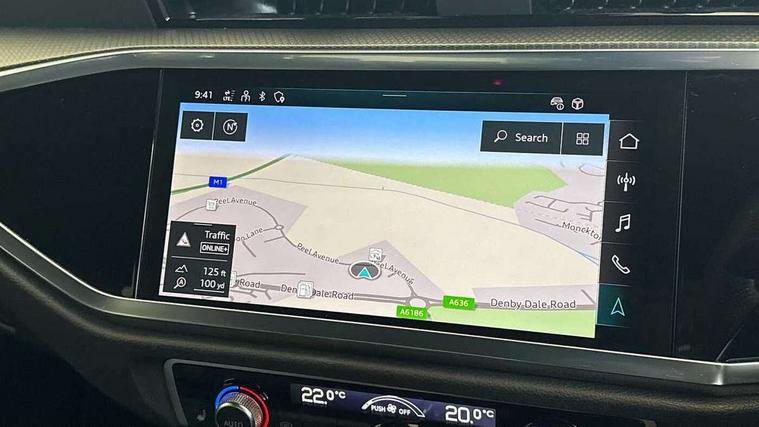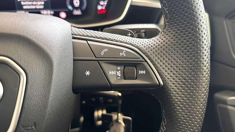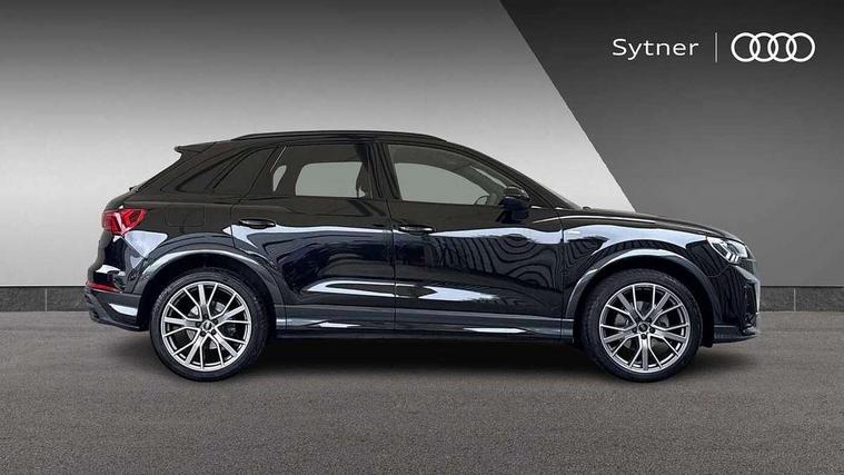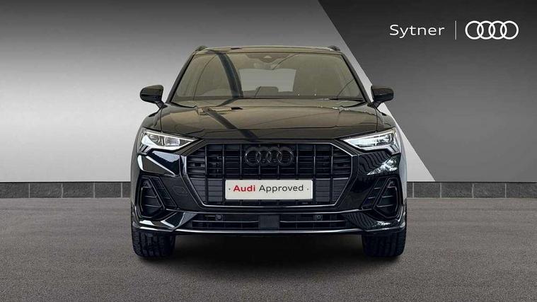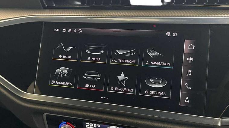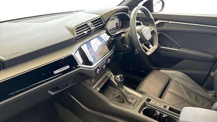 Amazon alexa Integration, Audi connect safety and service, Audi drive select, Audi lane departure warning, Audi Virtual Cockpit - 10.25" display, Bluetooth interface, Camera based traffic sign recognition, Distraction and Fatigue warning, Legal emergency call, MMI Navigation Plus with high resolution 10.1 inch touchscreen colour display, Power operated tailgate, Progressive steering, Service interval indicator, Smartphone interface includes wireless Apple carplay/Android Auto, Start stop system with recuperation, Voice control system with natural language interaction, Diesel particulate filter, Sports suspension, 2 USB-C ports with charge and data functions, 6 passive loudspeakers, DAB digital radio module, Acoustic windscreen, Anthracite black radiator grille, Audi Beam uses LEDs to project the Audi logo onto the ground as you exit your Q3, Auto dimming door mirrors, Auto dimming frameless rear view mirror, Black roof rails, Electrically folding, adjustable and heated door mirrors with integrated LED side indicators and kerb view function for passenger side, Front and rear electric windows, Front fog lights, Grille vertical bars in aluminium silver/Matt, High gloss black finish B and C pillars, LED Dynamic rear indicators, LED headlights with LED daytime running lights, LED rear lights, LED third brake light, Privacy glass dark tinted rear and rear-side windows (from B-pillar backwards), Rain and light sensors, Rear diffuser grille in grained matt black, Rear diffuser strip in matt anthracite black, Rear side wing doors, Rear wiper, S line bumpers in contrasting Manhattan grey, Variable front intermittent wipers, 12V socket in rear centre console, 3 seat bench in 2nd row, 40:20:40 folding with manual adjustment for 60:40 forwards/backwards position and backrest angle, Adjustable rear seat bench/backrest with centre armrest and cupholder, Black carpet mats, Black cloth headlining, Dual zone electronic climate control, Electric lumbar support, Front and rear black floor mats with contrast stitching in rock grey, Front and rear headrests, Front centre armrest, Height and reach adjustable steering wheel, Illuminated door sill trims with S logo, ISOFIX child seat mounting for front passenger with airbag deactivation and outer rear seat including top tether attachment point for outer rear seats, Luggage compartment sill protection in stainless steel, Manual front seats with height adjustment, Perforated leather gearknob, Single front passenger seat, Stainless steel pedals, Twin leather upholstery with front sport seats + S embossing, Black styling pack - Q3, Non smoking pack - Q3, 3x3 point rear seatbelts, 6 airbags - Driver, front passenger, curtain and side windows, Audi pre-sense front with pedestrain and cyclist recognition, Electrically operated child locks on rear doors, Electromechanical parking brake, Electronic stabilisation control including ABS, ASR and EDL, Front seatbelt reminder, Hill descent control, Hill hold assist, Pre sense basic, Seatbelt monitoring, Tyre pressure warning, Warning triangle and first aid kit, Anti theft wheel bolts, Immobiliser, Remote central locking, Thatcham approved category 1 anti theft alarm, Aluminium look interior elements, Detail dashboard around MMI touch colour display in glass look, black with surround in aluminium look, Leatherette door armrest, Piano black inlay,