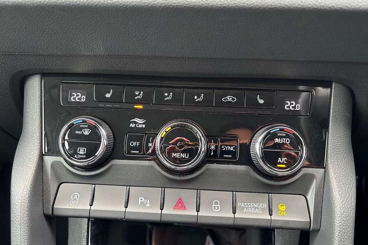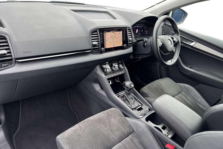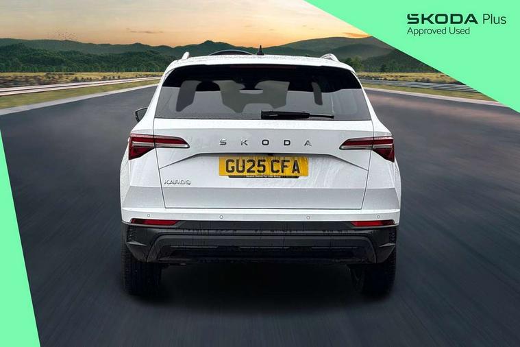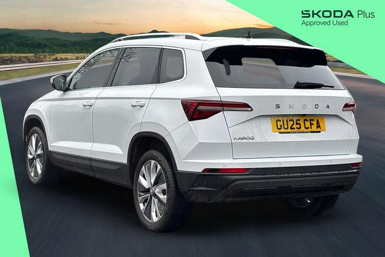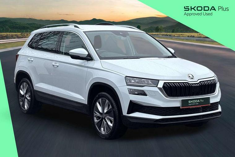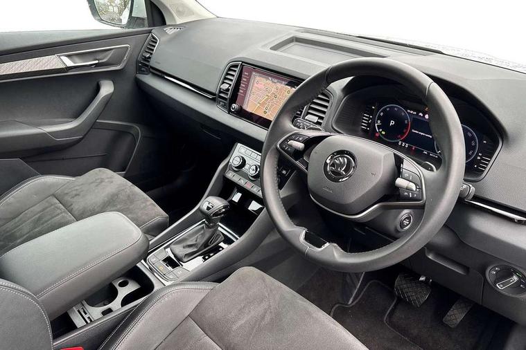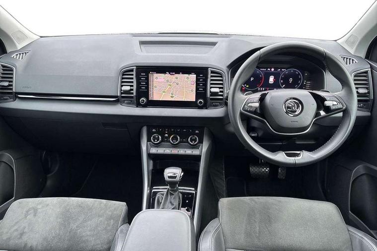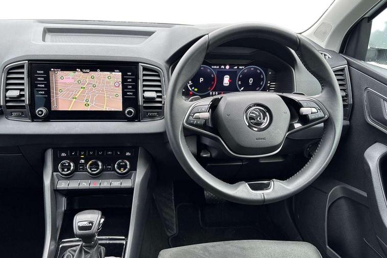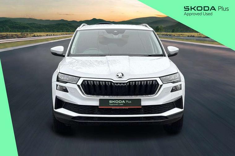 8" Digital display, Advanced driver attention and drowsiness monitor, Emergency services call system, Outside temperature gauge, Sensor for driver assistance systems, Service interval indicator, SmartLink wireless for Apple and wired for Android, Start/stop system with regenerative braking, USB C Port x 2 in front centre console, Virtual Cockpit - 10.25" digital display, Wireless smartphone charging, DAB radio with Bluetooth, USB connection, Acoustic glass, Aero front windscreen wipers with intermittent function, Auto dimming rear view mirror with light and rain sensors, Black electric window control buttons, Body colour door mirrors and handles, Electric front and rear windows with child proof lock, Heated rear windscreen, LED daytime running lights, LED rear lights with high functionality welcome effect and dynamic indicators, Light assistant (coming/leaving home/tunnel light), Plastic scuff plates in door apertures, Privacy glass, Rear side wing doors, Rear spoiler, Rear window wiper with washer system and intermittent control, Safety reflectors on front doors, Third brake light, 1.5 litre bottle holders in driver and front passenger door panels, 12V socket in boot, 12v socket in front centre armrest with storage compartment and rear air vents, 2 spoke leather heated multifunction steering wheel with DSG paddles, 2 x Tablet holder, 3 rear height adjustable headrests, 3 seat bench in 2nd row, 4 foldable roof handles with rear coat hooks, Black floor carpet, Chrome inner door handles, Foldable hooks in the boot, Front head restraints, Height adjustable front three point seats belts with tensioners, Height/reach adjust steering wheel, Ice scraper, Illuminated glovebox, Illuminated luggage compartment, Interior noise suppression, Isofix child seat preparation for front passenger seat, Isofix child seat preparation outer rear, Manual lumbar support for front seats, Pearl grey interior ceiling, Pen holder, Pollen filter, Rear boot cover, Rear reading lights, Rubbish bin door, Safety vest holder, Single front passenger seat, Storage box in upper central dashboard closed, Sunvisors with illuminated vanity mirrors, Textile floor mats, Ticket holder, Design Pack - Karoq, Non Smokers pack, Parking pack - Karoq, Automatic door unlocking in case of crash, Automatic fuel cut off in case of crash, Driver airbag, Electronic parking brake with auto hold function, Emergency rear braking signal, ESC (incl. ABS+MSR+ASR+EDS+HBA+DSR+RBS+MKB), Front side airbags, Head airbags, Hill hold control, Knee airbags, Passenger airbag with switch-off function, Pedestrian monitor, Seatbelt reminder signalisation and pretensioner for all seats, Three point seatbelts rear, Two tone horn, Tyre pressure monitor, Alarm with interior monitoring, back up horn and tilt sensor with safe function, Electronic engine immobiliser, Keyless entry and start/stop, Remote central locking with 2 remote folding keys, Black centre console, Chrome framed air vents, Satin black dashboard, Anti-theft wheel bolts protection, Breakdown and tool kit,