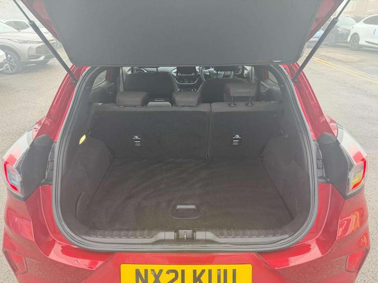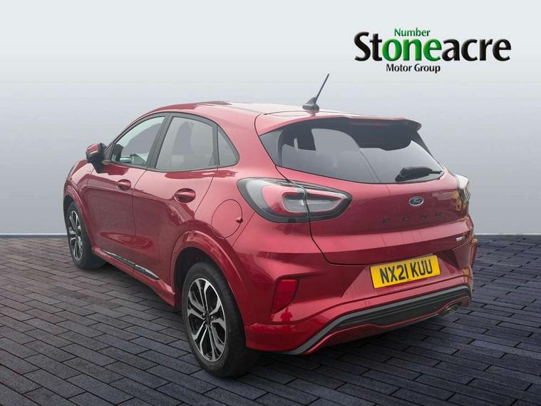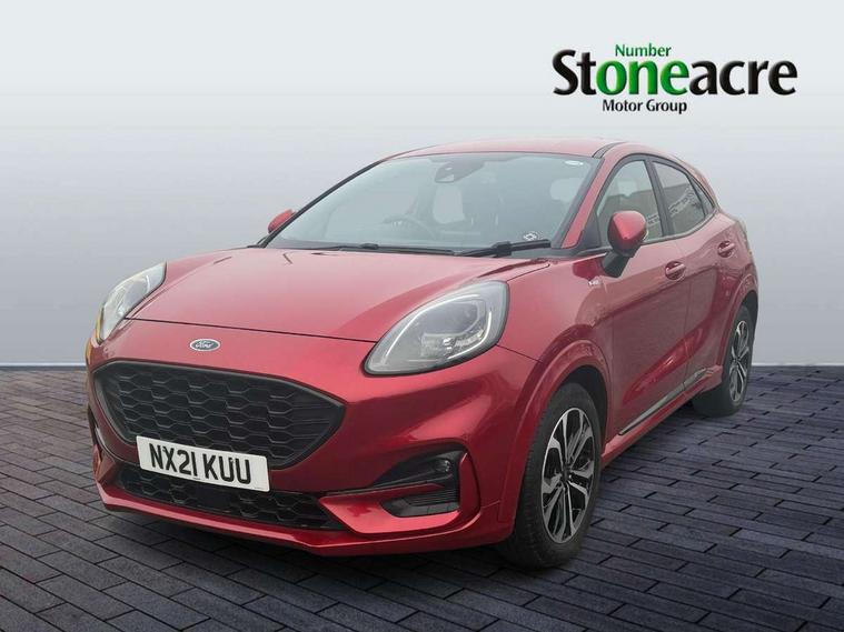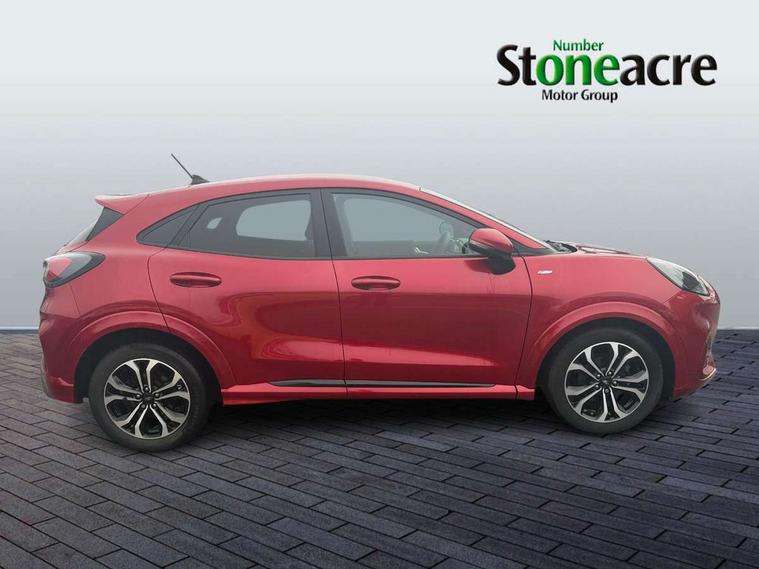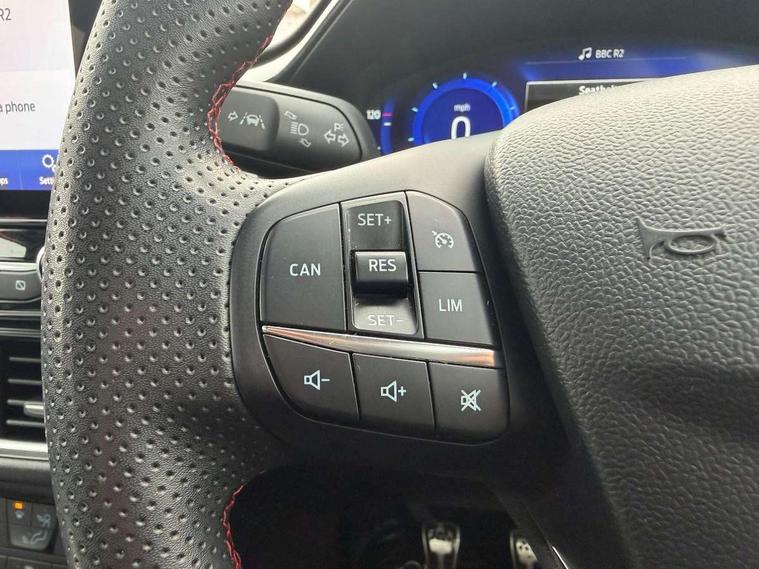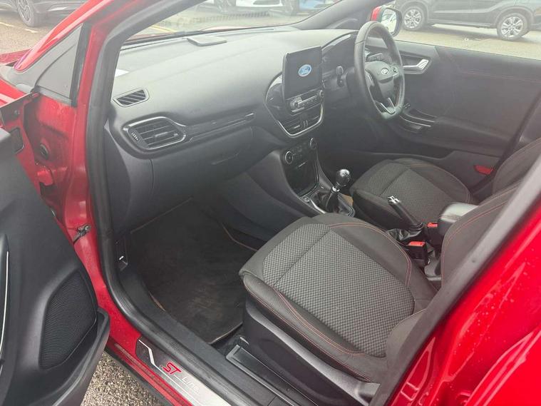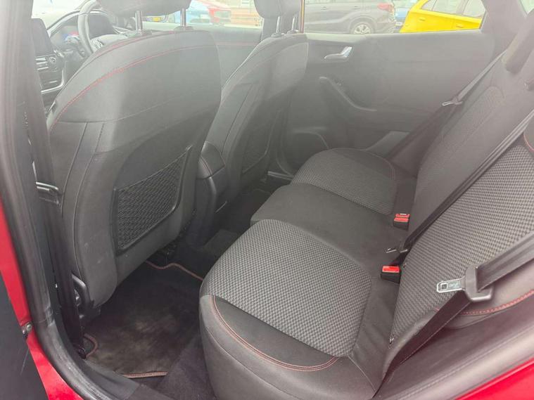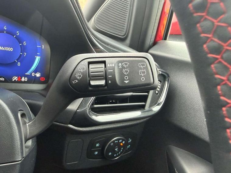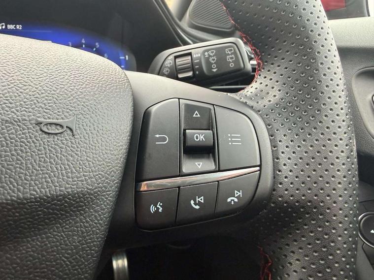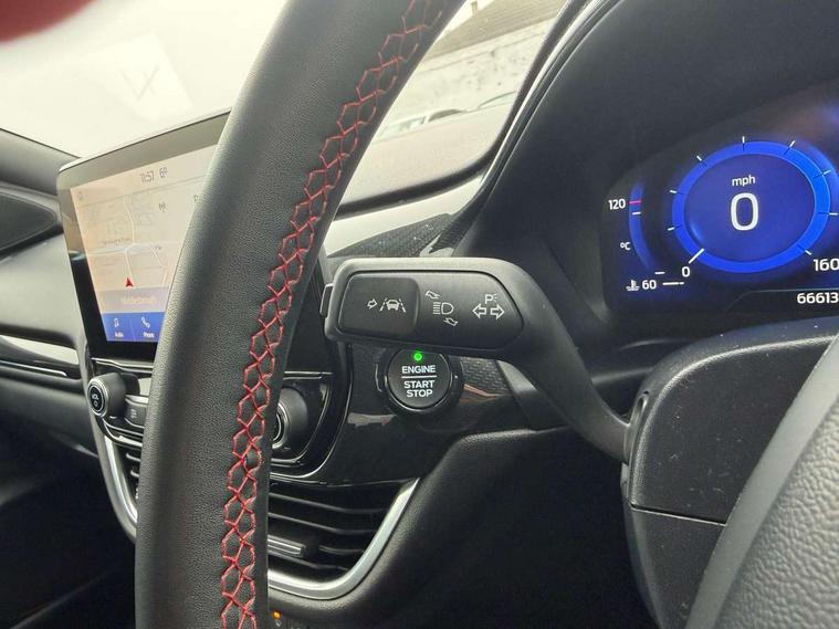 Ford easy fuel, Full digital 12.3" instrument cluster, Lane keeping aid with lane departure warning, Power assist steering, Power start button, Rear parking sensor, Selectable drive modes(Normal, sport, Eco, trail, slippery), Automatic headlights with rain sensing wipers and auto high beam, Body coloured door mirrors, Front fog lights with cornering lights and LED rear lamps, Power foldable heated door mirrors with puddle lamps, Projector headlamps with LED day time running lights, Quickclear heated windscreen, Rear wiper, ST-Line body kit with large rear spoiler wth sports suspension, Centre console with armrest and stowage, Cloth upholstery, Driver seat height/lumbar adjust, Ford megabox extended bootspace, Front and rear floor mats, Front and rear head restraints, Manual air conditioning, ST-Line flat bottomed sensico leather steering wheel with leather handbrake and aluminium gear knob, Ford SYNC 3 navigation pack - Puma, 3 rear seatbelts, Electronic stability control (ESC) and hill start assist, Pre-collision assist with autonomous emergency braking, pedestrian/cyclist detection & post-collision braking, Tyre pressure monitoring system (TPMS), Thatcham alarm,