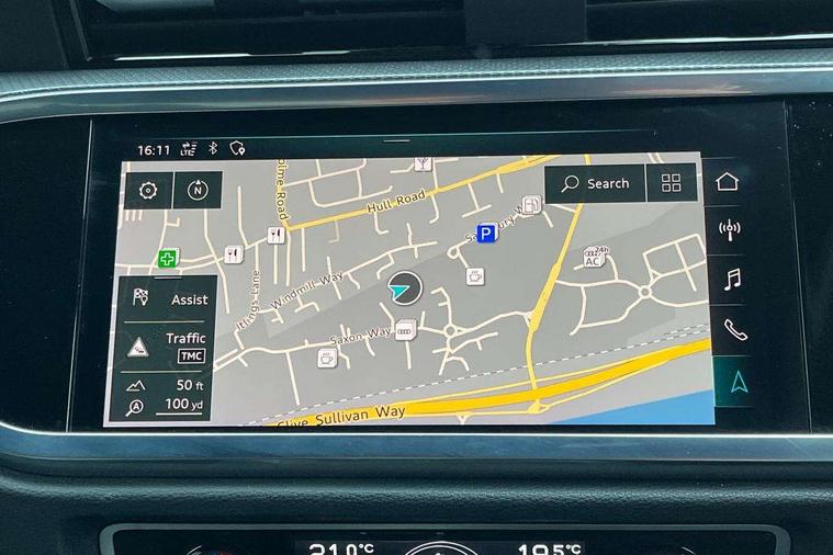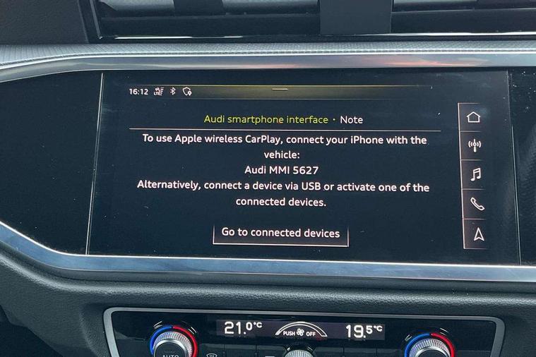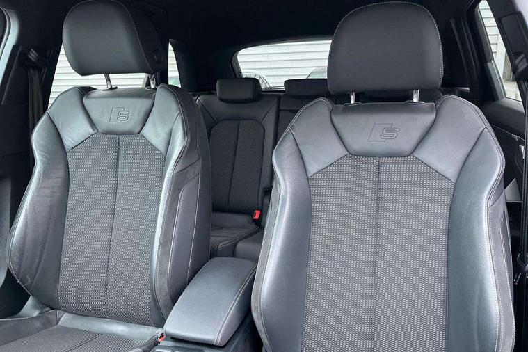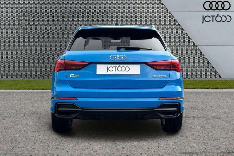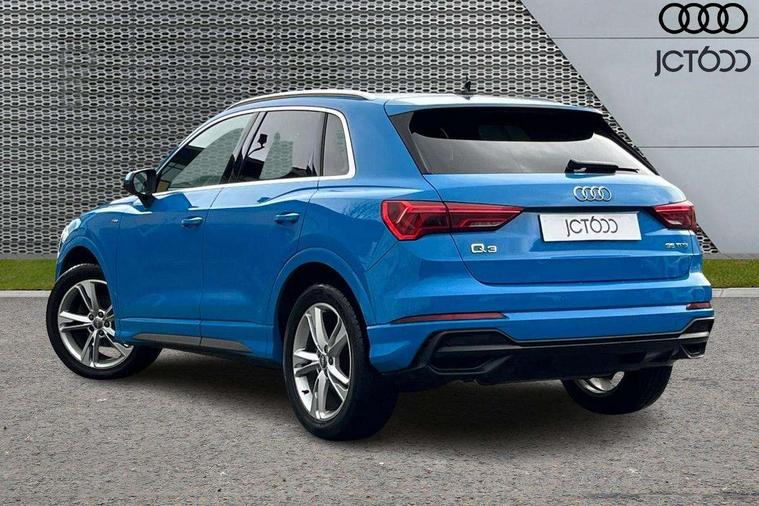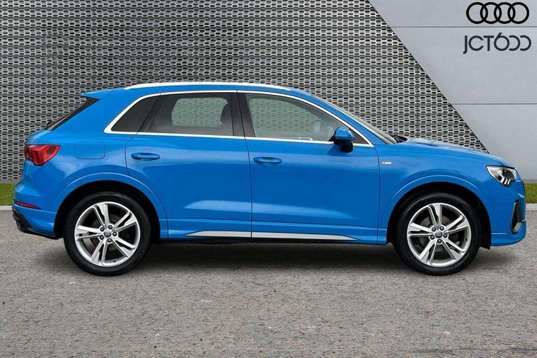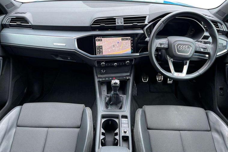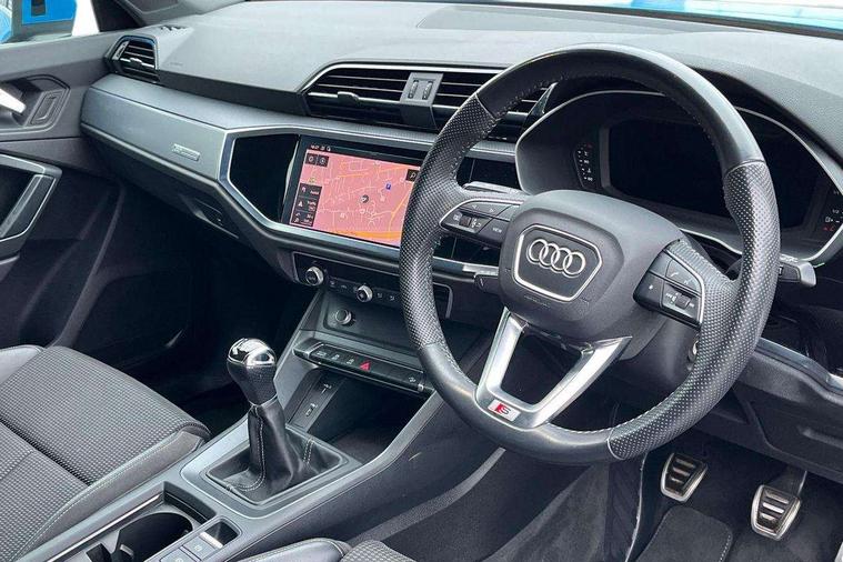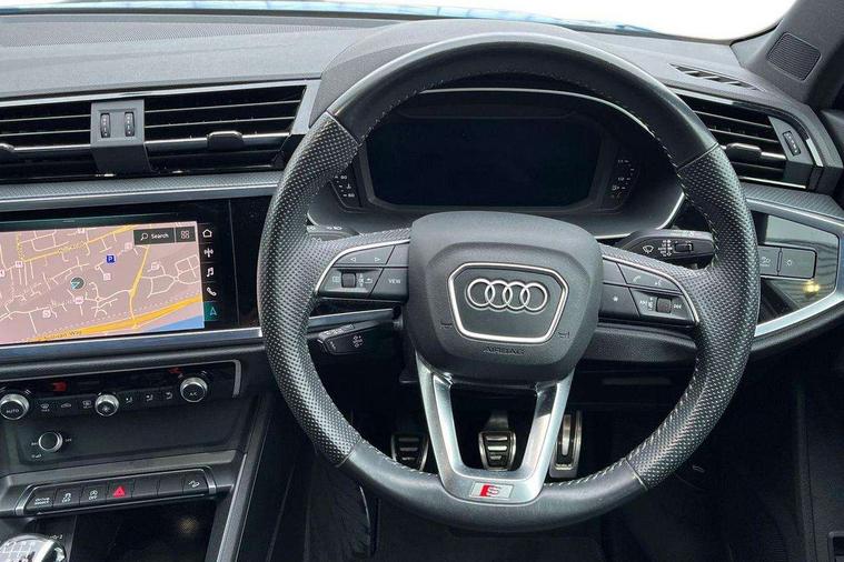 Apple CarPlay, Audi connect safety and service (e-call), Audi drive select, Audi lane departure warning, Audi side assist, Audi smartphone interface, Audi Virtual Cockpit - 10.25" display, Bluetooth interface, Camera based traffic sign recognition, Cruise control + speed limiter, MMI Navigation Plus with high resolution 10.1 inch touchscreen colour display, Power opening/closing tailgate, Progressive steering, Rear parking sensors, Service interval indicator, Start stop system with recuperation, Voice control system with natural language interaction, Sports suspension, 1 x USB type C and 1 USB type A charging points, 6 speakers, DAB digital radio module, Acoustic windscreen, Aluminium roof rails, Aluminium window trim, Auto dimming frameless rear view mirror, Body coloured bumpers, Electrically folding, adjustable and heated door mirrors with integrated LED side indicators and kerb view function for passenger side, Front and rear electric windows, Front fog lights, Front side air inlets in matt platinum grey, Front spoiler blade in matt platinum grey, Grille vertical bars in aluminium silver/Matt, High gloss black finish B and C pillars, LED headlights with LED daytime running lights and dynamic rear indicator, LED rear lights, Privacy glass, Rain and light sensors, Rear diffuser strip in matt titanium black, S Line badge on wings, S Line front and rear bumpers, Side skirt insert in matt Platinium grey, Silver chrome grille surround, Titanium black radiator grille, 12V socket in rear centre console, 40:20:40 split folding rear bench seat, 60:40 forwards/backwards position and backrest angle, Adjustable rear seat bench/backrest with centre armrest and cupholder, Aluminium door sill trims, Black cloth headlining, Dual zone electronic climate control, Front and rear black floor mats with contrast stitching in rock grey, Front and rear headrests, Front and rear roof module including reading lights, Front centre armrest with storage compartment and angle adjustment, Glove compartment lighting, Height and reach adjustable steering wheel, Illuminated door sill trims with S logo, ISOFIX child seat mounting and Top Tether with front passenger airbag deactivation, Luggage compartment light, Manual front seats with height adjustment, Perforated leather gearknob, Stainless steel luggage compartment sill finisher, Stainless steel pedals, Non smoking pack - Q3, 3x3 point rear seatbelts, 6 airbags - Driver, front passenger, curtain and side windows, Audi pre-sense front with pedestrain and cyclist recognition, Electrically operated child locks on rear doors, Electromechanical parking brake, Electronic stabilisation control including ABS, ASR and EDL, Hill descent control, Hill hold assist, Pre sense basic, Seatbelt monitoring, Tyre pressure warning, Warning triangle and first aid kit, Anti theft alarm, Anti theft wheel bolts, Remote central locking, Dark matt brushed aluminium inlay, Leatherette door armrest, MMI touch colour display in gloss black with aluminium surround,