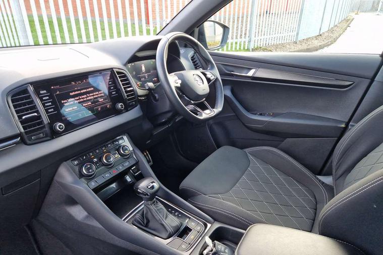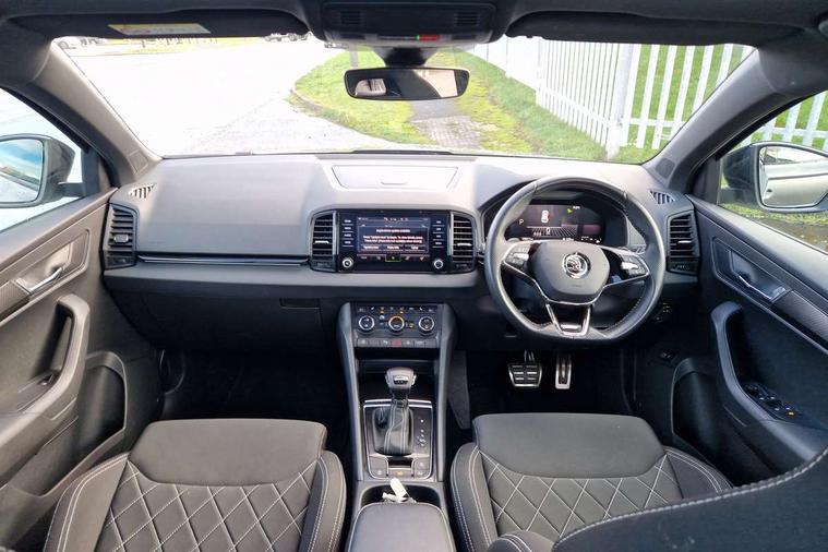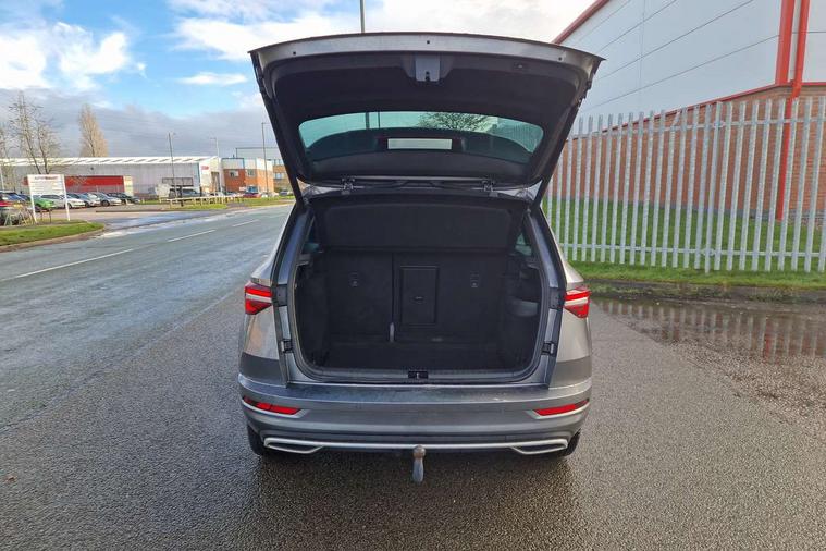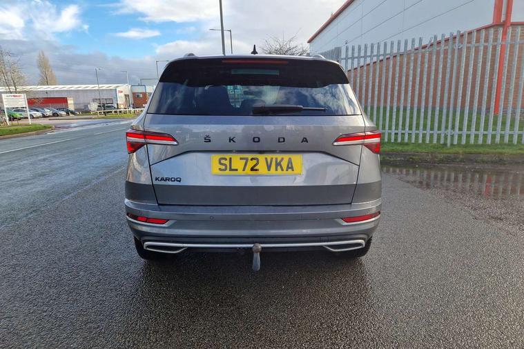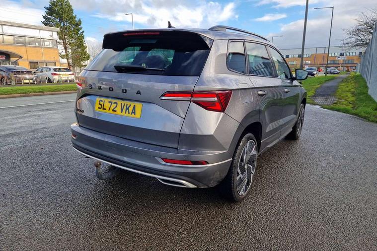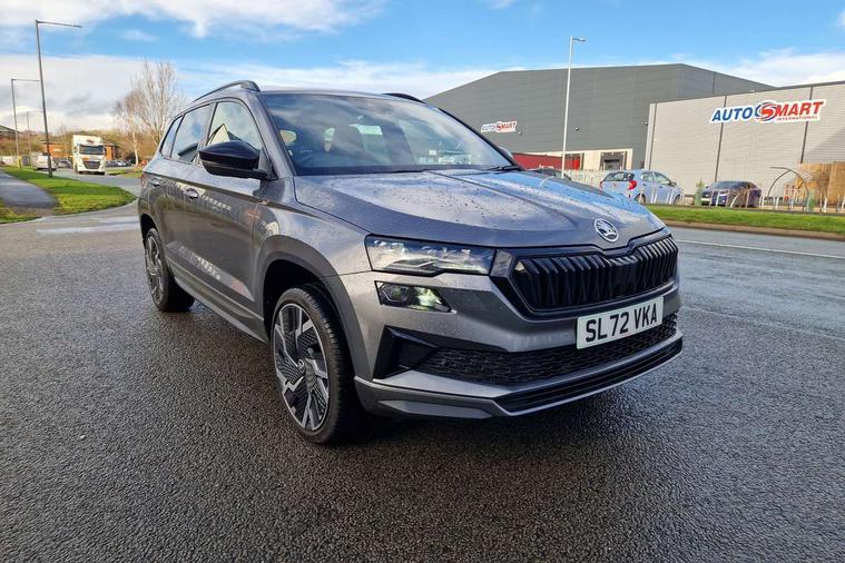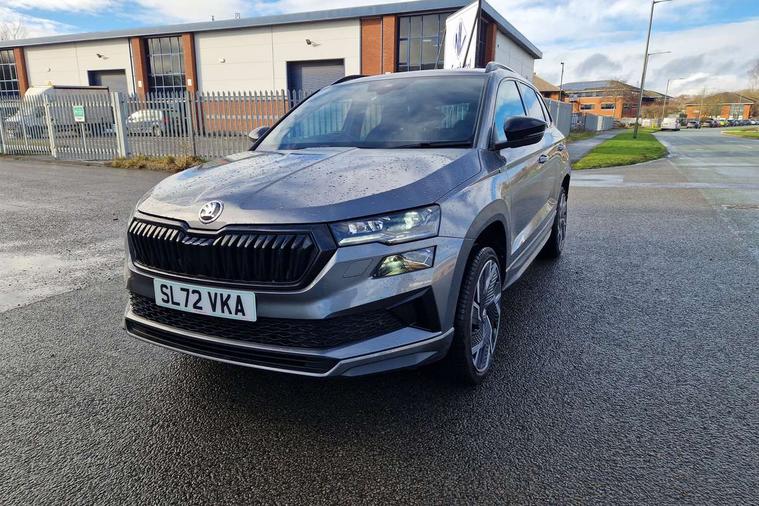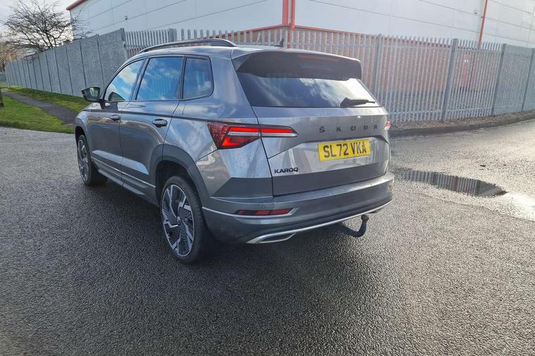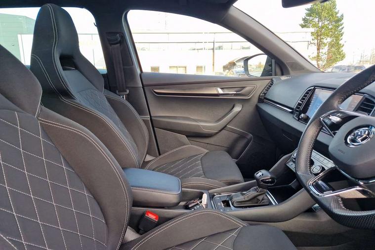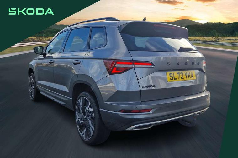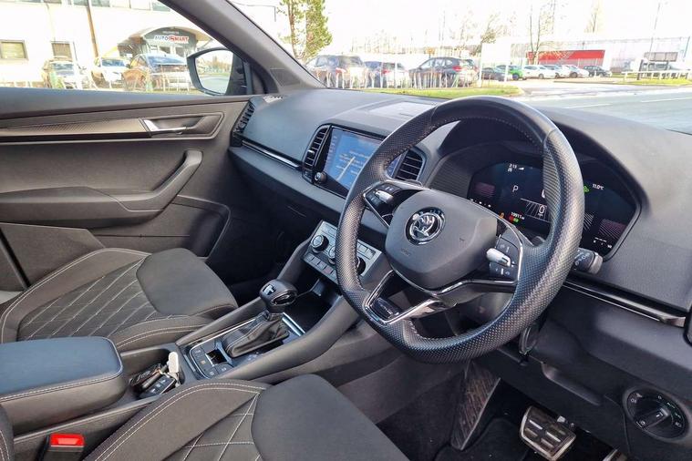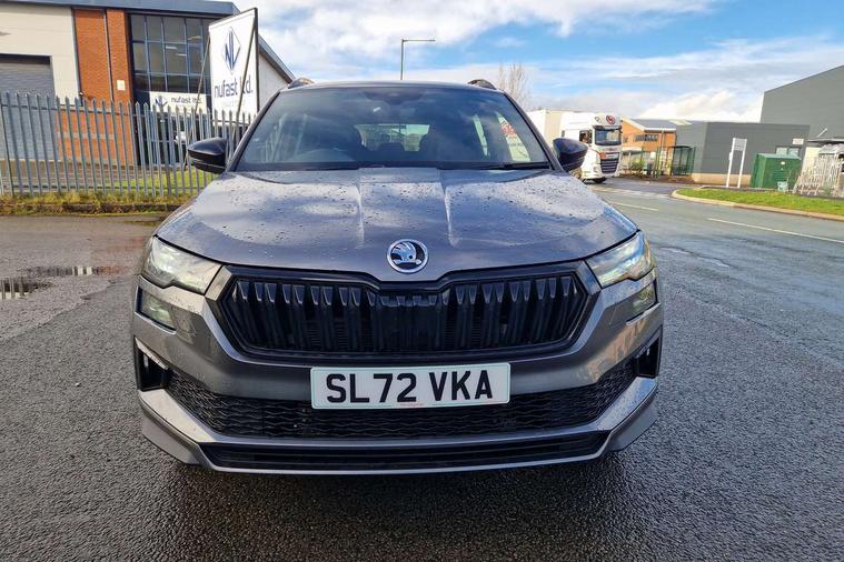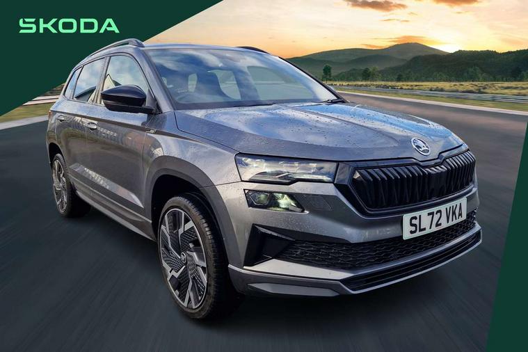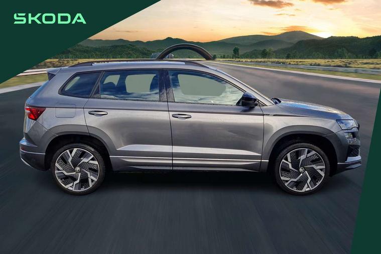8" Digital display, Care connect, Driver fatigue sensor, Emergency services call system, Outside temperature gauge, Service interval indicator, SmartLink wireless for Apple and wired for Android, Start/stop system with regenerative braking, USB C Port x 2 in front centre console, Virtual pedal with electrically operated boot door, 8 Speakers, DAB radio with Bluetooth, USB connection, Acoustic glass, Aero front windscreen wipers with intermittent function, Auto dimming rear view mirror with light and rain sensors, Black door mirrors, Black electric window control buttons, Black radiator grille, Black roof rails, Body colour door handles, Dynamic headlight range control with cornering light function, Electric front and rear windows with child proof lock, Front door steps with SportLine logo, Heated rear windscreen, LED daytime running lights, LED rear lights with high functionality welcome effect and dynamic indicators, Light assistant (coming/leaving home/tunnel light), Panoramic sliding sunroof, Plastic scuff plates, Privacy glass, Protective door side sills in body colour, Rear diffuser, Rear side wing doors, Rear spoiler, Rear window wiper with washer system and intermittent control, Safety reflectors on front doors, Skoda lettering on tailgate in black, Sportline badge on front fender, Sportline decorative inserts with badging, Sports front and rear bumpers, 1.5 litre bottle holders in driver and front passenger door panels, 12V socket in boot, 12v socket in front centre armrest with storage compartment and rear air vents, 2 Folding hooks and nets in boot, 3 rear height adjustable headrests, 3 seat bench in 2nd row, 3 spoke leather sports multifunction steering wheel and silver stitching with gear shift paddles, 4 foldable roof handles with rear coat hooks, Black floor carpet, Black roof headlining, Chrome inner door handles, Double sided boot floor, Foldable hooks in the boot, Front head restraints, Height adjustable front three point seats belts with tensioners, Height/reach adjust steering wheel, Ice scraper, Illuminated glovebox, Illuminated luggage compartment, Isofix child seat preparation outer rear, Manual lumbar support for front seats, Pen holder, Pollen filter, Rear boot cover, Rear reading lights, Rear seats fixed folding and divided 60:40, Rubbish bin door, Safety vest holder, Single front passenger seat, Storage box in upper central dashboard closed, Sunvisors with illuminated vanity mirrors, Textile floor mats, Ticket holder, Titan black interior ceiling, Welcome animation with sportline logo, Light Pack - Karoq, Parking pack - Karoq, Automatic door unlocking in case of crash, Automatic fuel cut off in case of crash, Child locks on rear doors, Driver airbag, Electronic parking brake with auto hold function, Emergency rear braking signal, ESC including ABS, MSR, ASR, EDS, HBA, DSR, RBS, MKB and traction control, Front side airbags, Hill hold control, Knee airbags, Passenger airbag with switch-off function, Pedestrian monitor, Seatbelt reminder signalisation and pretensioner for all seats, Three point seatbelts rear, Two tone horn, Tyre pressure display, Tyre pressure monitor, Alarm with interior monitoring, back up horn and tilt sensor with safe function, Electronic engine immobiliser, Keyless entry and start/stop, Remote central locking with 2 remote folding keys, Black air vent surround, Black centre console, Satin black dashboard, Satin black door trim, 19" Vega black polished alloy wheels, Anti-theft wheel bolts protection, Matt black aero hub caps, Storage on wheel cover, Tool kit,