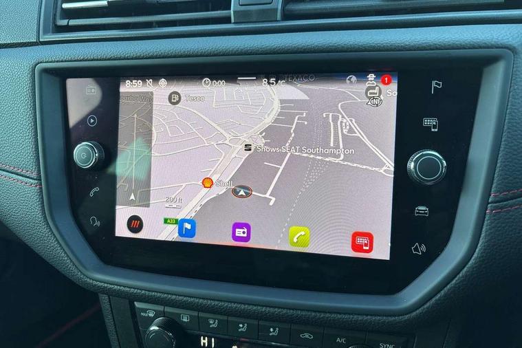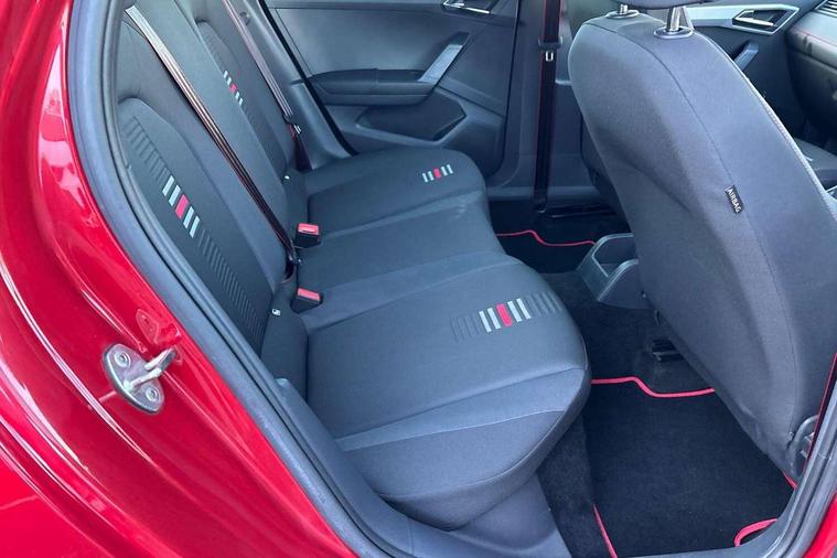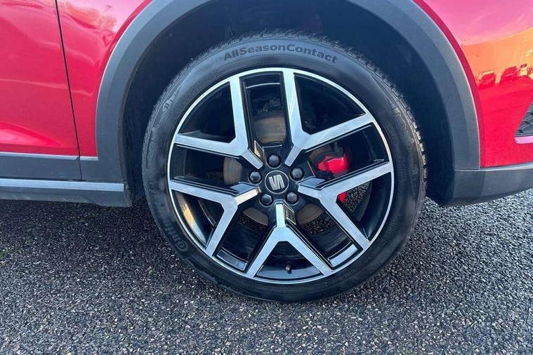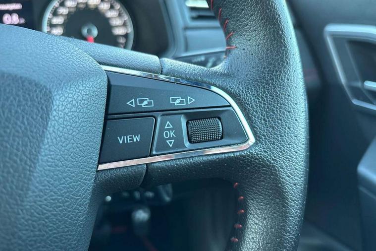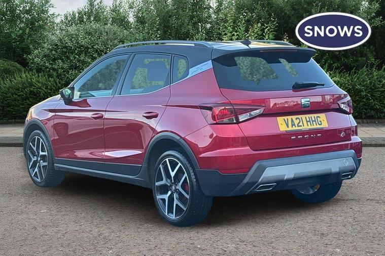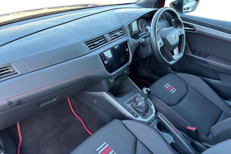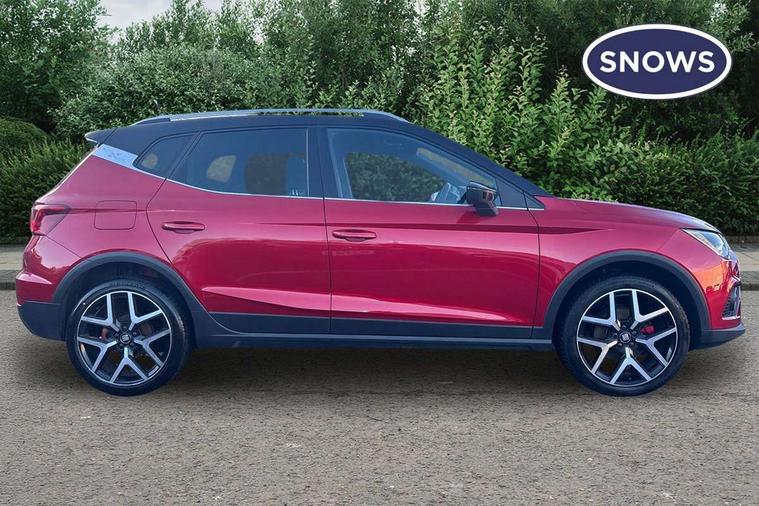 'Lights On' Reminder warning buzzer, Cruise control and speed limiter, Digital clock, Electric speed sensitive power steering, Full Link Smartphone Integration with Mirror Link, Apple Car Play, Google Android Auto with USB cable for Apple and Android compatibility, Low fuel warning light, Outside temperature display, Rear parking sensor, RPM counter, Seat connect with safety, service, remote and online, SEAT Drive profile with dynamic chassis control - Four different models normal-sport-eco-individual, steering response, throttle response, Trip computer, Sports suspension, 6 speakers, Bluetooth interface for hands free and audio streaming, DAB digital radio and AM/FM radio, Steering wheel mounted audio controls, Anti theft roof antenna, Auto dimming interior rear view mirror, Automatic activation of hazard warning lights, Automatic headlights, Body coloured bumpers, Body coloured door handle inserts, Chrome front grille frame, Chrome roof rails, Chrome window trim, Coming/leaving home lighting function, Dark tinted rear windows, Electric front/rear windows with one touch/auto up/down, Electrically adjustable, heated and folding door mirrors, Full LED headlights dipped and mainbeam + front and rear fog lights, LED daytime running lights, LED rear tail lights and licence plate lights, Protective side mouldings, Rain sensing wipers, Rear window wash/wipe, Roof colour door mirrors, Twin exhaust pipe styling hidden exhaust pipe, Visible VIN plate, Windshield wiper with intermittent control and potentiometer, 2 cupholders, 60/40 split folding rear seat, Aircare filter, Black interior roof, Double boot floor, Driver sunvisor with covered mirror + card holder, Dual zone climate control, Front courtesy light with front reading lights, Front sport seats, Gear shift indicator, Heated front seats, Height adjustable front seats, Height/reach adjustable steering column, Illuminated boot, Instrument lighting with brightness control, Interior light in footwell, central console and door panel, ISOFIX points in outer rear seats with top tether anchorage points, Multi-colour ambient interior lighting, Nora cloth upholstery, Passenger sunvisor with vanity mirror, Perforated flat bottomed leather steering wheel/gear knob/handbrake with red stitching and FR logo, Two front and three rear height adjustable headrests, Connectivity pack plus - Arona, Interior chrome pack - Arona, 3 point seatbelts on all rear seats, ABS, Active front headrests, Child locks on rear doors, Driver and front passenger airbags with front passenger airbag de activation, front side and curtain airbags, Electronic stability control, Emergency Brake Assist (EBA) and front assist, Front and rear seatbelt reminder, Hill hold control, Multi-Collision braking, Red brake calipers, Seatbelts with red stripe, Tiredness recognition system, Traction control, Tyre pressure monitoring system, 2 folding remote keys with window open/close function, Alarm with back-up horn, Electronic engine immobiliser, Locking wheel bolts, Remote central locking + deadlocks, Tow away protection, Interior chrome line trim, Leatherette dashboard, 18" Performance alloy wheels,