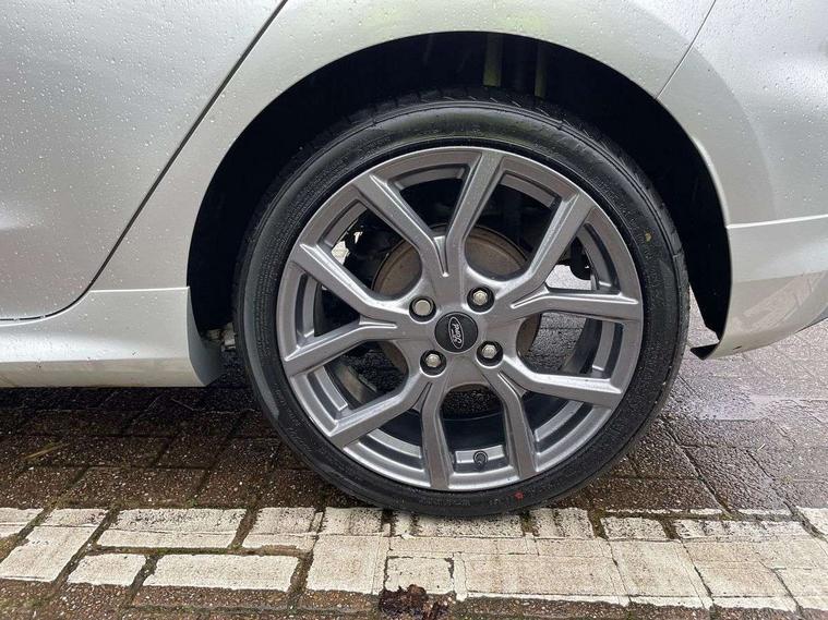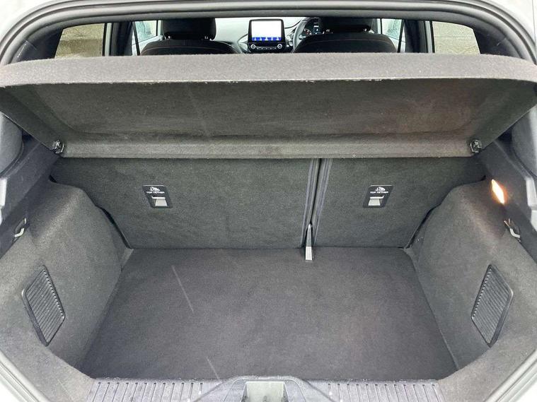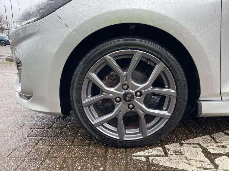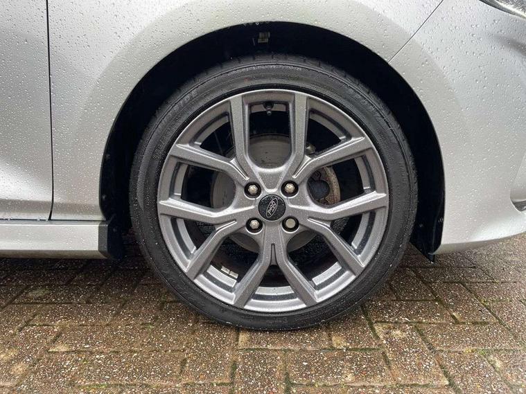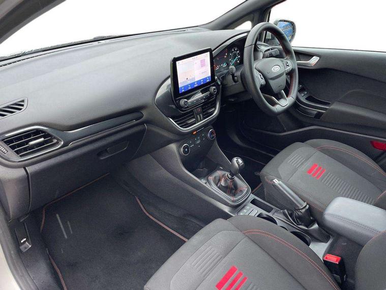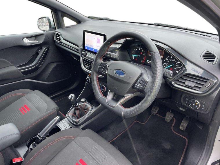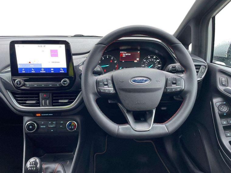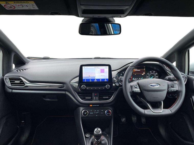 Bluetooth system, Electric power steering, Ford easy fuel, Ford SYNC 3 Navigation system incl 8" touchscreen, 7 speakers, FordPass connect, Apple carplay, android auto, voice control and emergency assistance, Rear parking distance sensors, Selectable drive modes (Normal, Sport, Track), Trip computer, Sports suspension, 2 USB ports, Auxiliary input socket, DAB Digital radio, Steering wheel mounted controls, Body colour bumpers, Body colour door handles, Body colour large rear spoiler, Body coloured electrically operated and heated door mirrors with side indicators, Cornering front fog lights, Electric front windows/one touch facility, Electric rear windows, LED Night signature to rear lights, Quickclear heated windscreen, Rain sensing wipers and auto dimming rear view mirror, Rear privacy glass, Rear wiper, Unique ST-Line upper grille & full bodystyling kit with ST-Line wing badges, 3 spoke flat bottomed leather steering wheel, 60/40 split folding rear seat, Adjustable head restraints, Black headlining, Boot carpet, Centre console with opening armrest, 2x cupholders, 12v and USB, Chrome inner door handles, Cloth upholstery, Footwell illumination, Front floor mats in velour, Front map reading lights, Front seat and rear pockets, Illuminated glovebox, Leather gaiter, Load area light, Manual 2 way passenger seat adjust, Manual 4-way driver seat adjust, Manual air conditioning, Overhead console with sunglasses holder, Pollen filter, Rake/reach adjustable steering wheel, Sensico wrapped steering wheel, Sports front seats, NCAP Pack - Fiesta, 3 point seatbelts on all rear seats, ABS+EBA, Curtain airbags, Driver and passenger airbags, Drivers knee airbag, Electronic stability control with hill start assist, Front passenger airbag deactivation, Front side airbags, Seatbelt warning, Two tone horn, Tyre pressure monitoring system, Keyless start with 'Ford Power' starter button, MyKey system, Remote central locking & engine immobiliser, Thatcham Cat.1 alarm, 17" 5 spoke alloy wheels with rock metallic finish,