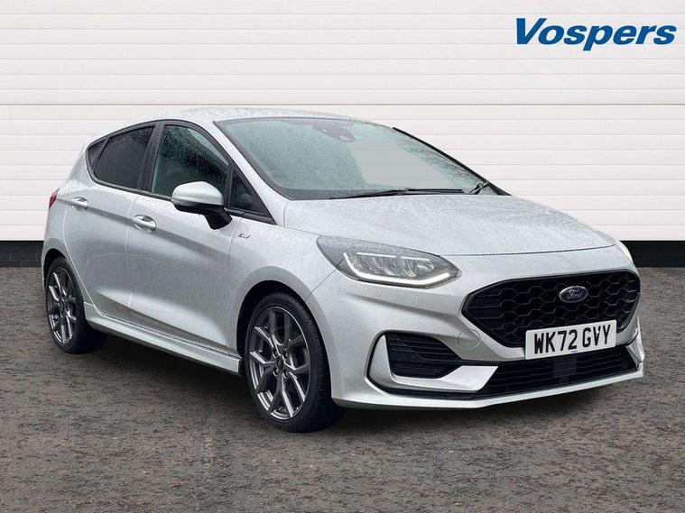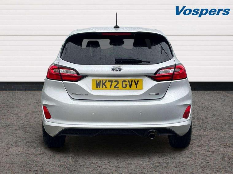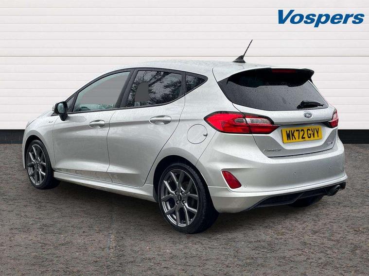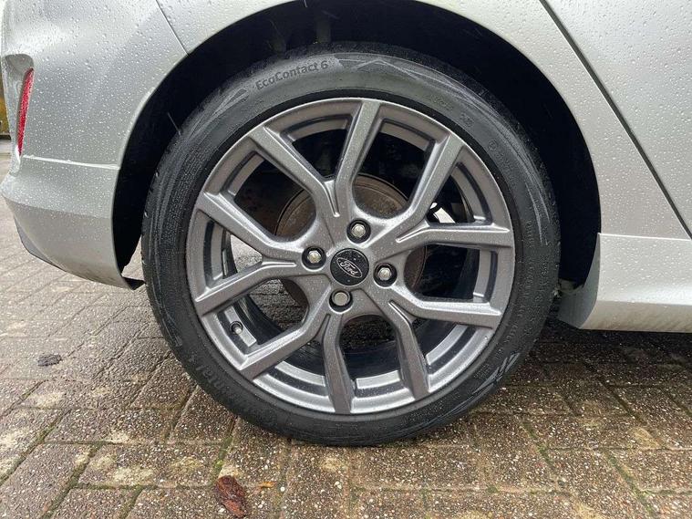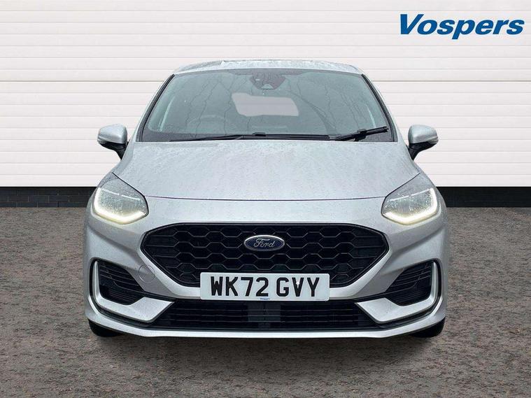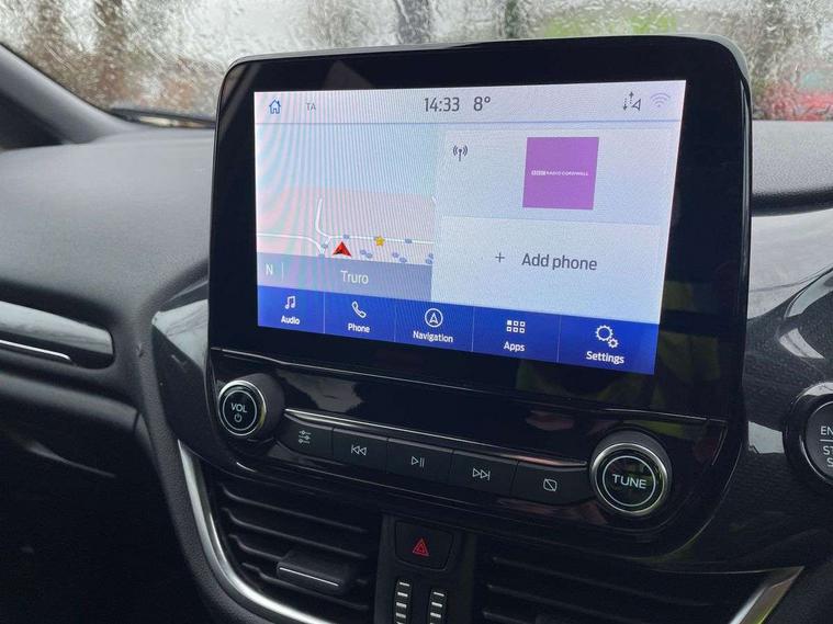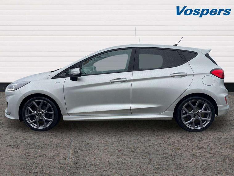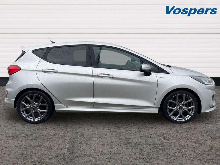 Bluetooth system, Electric power steering, Ford easy fuel, Ford SYNC 3 Navigation system incl 8" touchscreen, 7 speakers, FordPass connect, Apple carplay, android auto, voice control and emergency assistance, Rear parking distance sensors, Selectable drive modes (Normal, Sport, Track), Trip computer, Sports suspension, 2 USB ports, Auxiliary input socket, DAB Digital radio, Steering wheel mounted controls, Body colour bumpers, Body colour door handles, Body colour large rear spoiler, Body coloured electrically operated and heated door mirrors with side indicators, Cornering front fog lights, Electric front windows/one touch facility, Electric rear windows, LED Night signature to rear lights, Quickclear heated windscreen, Rain sensing wipers and auto dimming rear view mirror, Rear privacy glass, Rear wiper, Unique ST-Line upper grille & full bodystyling kit with ST-Line wing badges, 3 spoke flat bottomed leather steering wheel, 60/40 split folding rear seat, Adjustable head restraints, Black headlining, Boot carpet, Centre console with opening armrest, 2x cupholders, 12v and USB, Chrome inner door handles, Cloth upholstery, Footwell illumination, Front floor mats in velour, Front map reading lights, Front seat and rear pockets, Illuminated glovebox, Leather gaiter, Load area light, Manual 2 way passenger seat adjust, Manual 4-way driver seat adjust, Manual air conditioning, Overhead console with sunglasses holder, Pollen filter, Rake/reach adjustable steering wheel, Sensico wrapped steering wheel, Sports front seats, NCAP Pack - Fiesta, 3 point seatbelts on all rear seats, ABS+EBA, Curtain airbags, Driver and passenger airbags, Drivers knee airbag, Electronic stability control with hill start assist, Front passenger airbag deactivation, Front side airbags, Seatbelt warning, Two tone horn, Tyre pressure monitoring system, Keyless start with 'Ford Power' starter button, MyKey system, Remote central locking & engine immobiliser, Thatcham Cat.1 alarm, 17" 5 spoke alloy wheels with rock metallic finish,